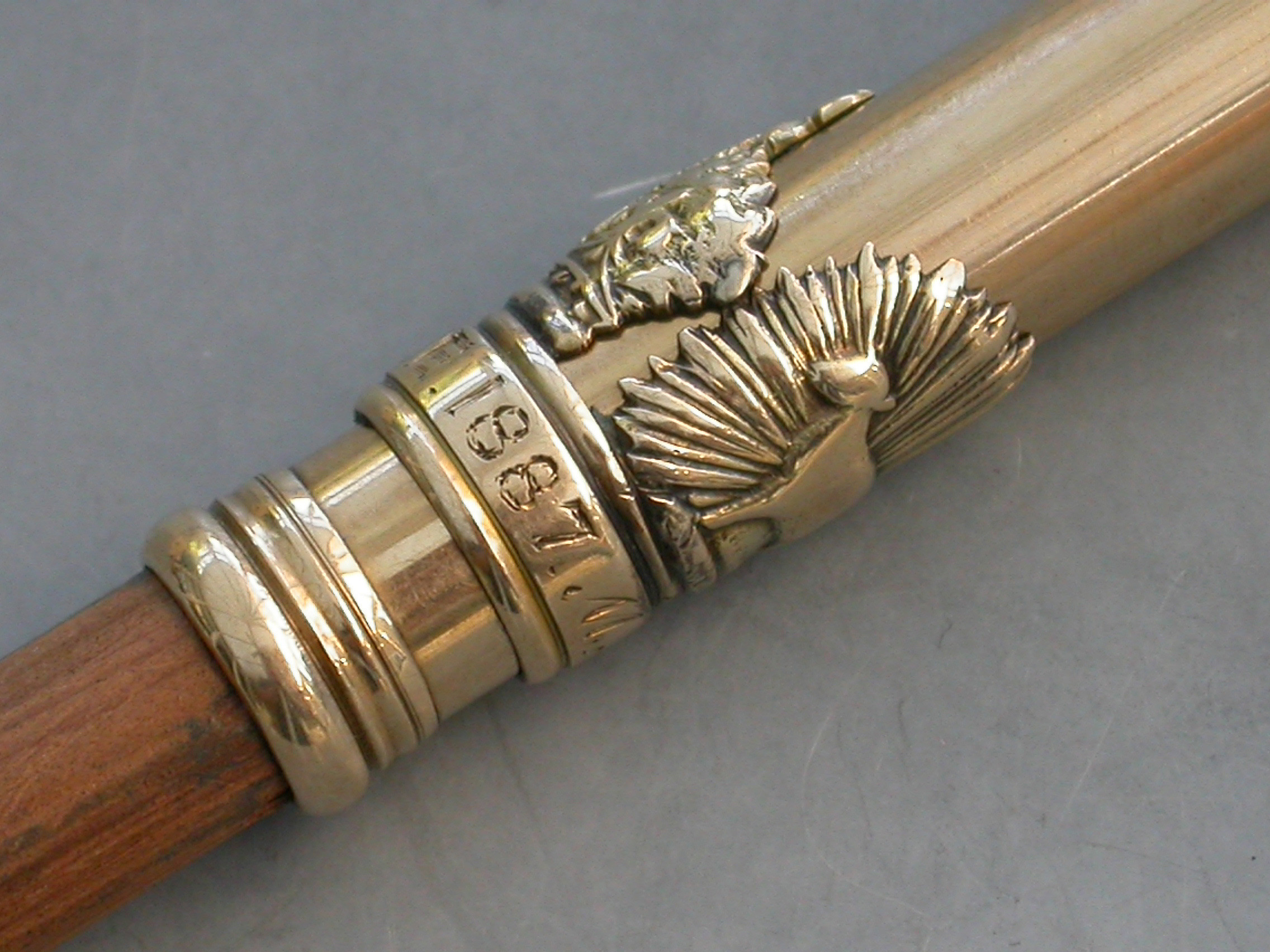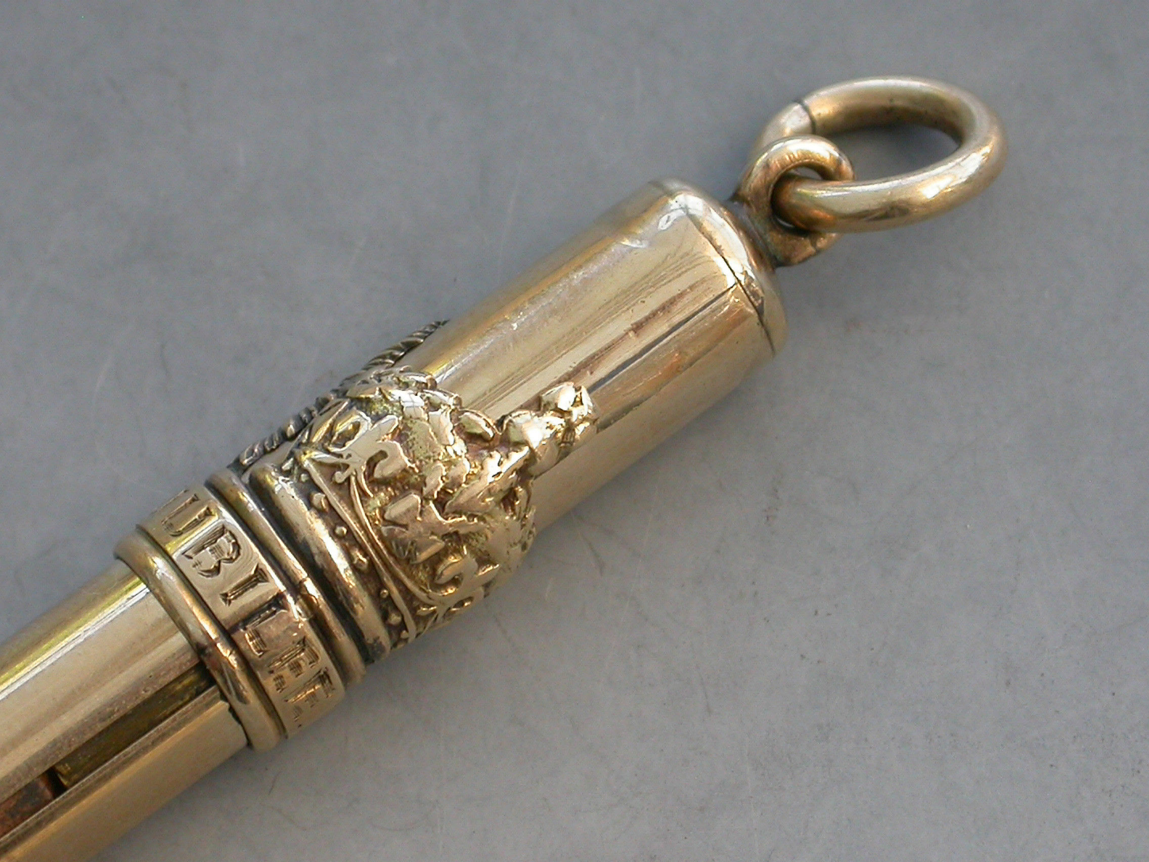 A rare Victorian 10 carat gold sliding cedar Pencil Holder of plain cylindrical form with attached suspension ring, the sliding sleeve to propel the pencil engraved - 'Jubilee 1887.M.T.Co.' and mounted with the Royal Crown of Victoria and the crest of the Merchant Taylor's Company (a lamb passant in front of a rising sun).