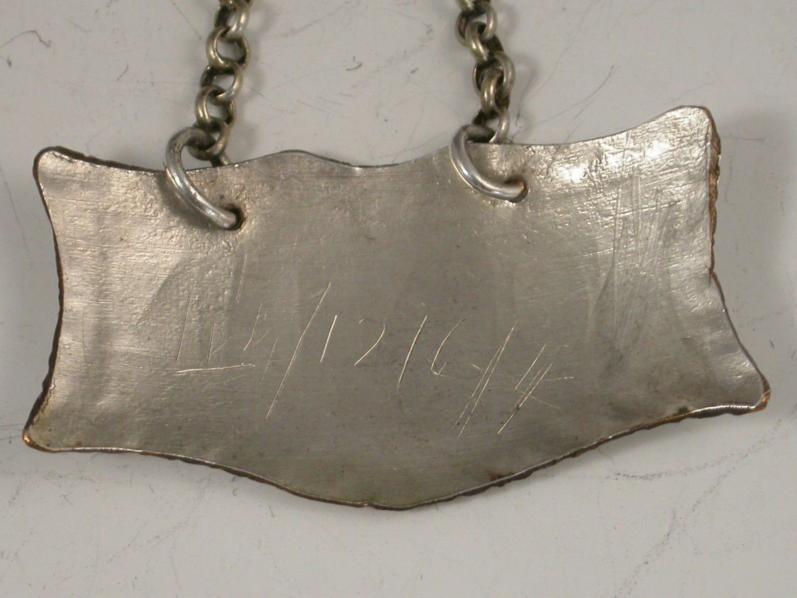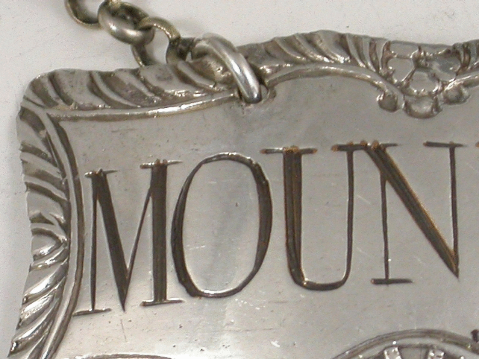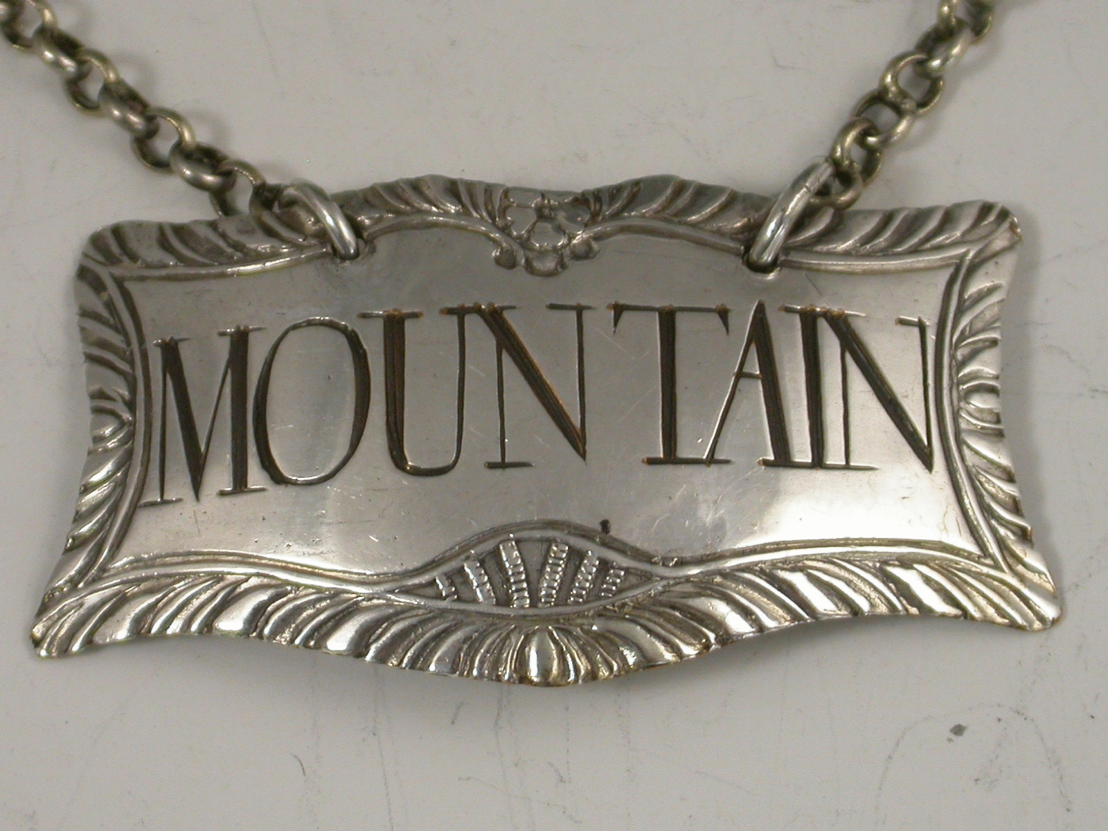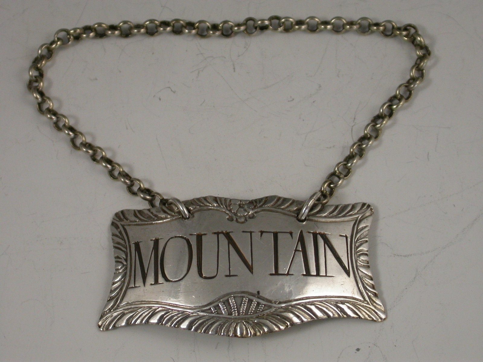 A good 18th century Old Sheffield Plate Wine Label of shaped rectangular or cushion form with gadroon, shell and flower head border, incised in bold script for Mountain.