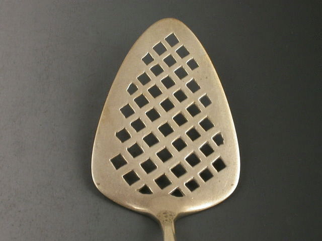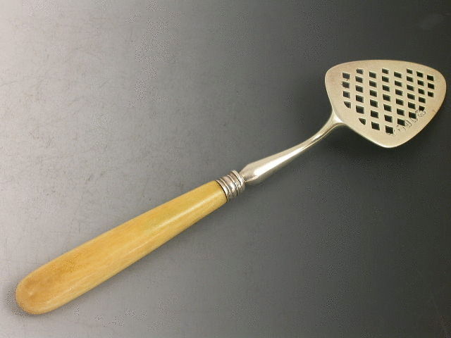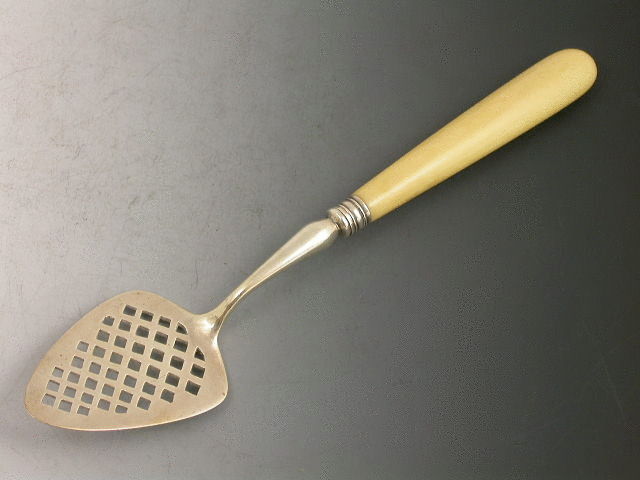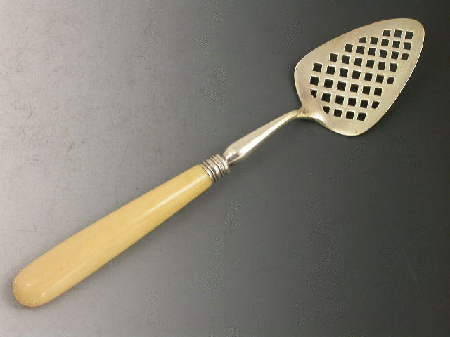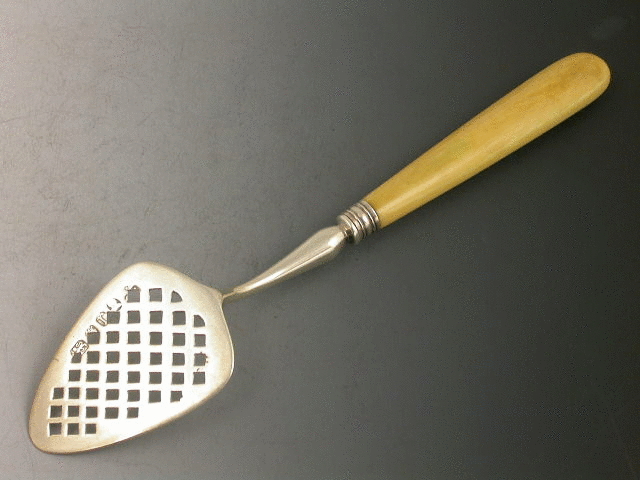 A good quality little 18th century silver pierced Butter Spade with plain bone handle, the spade shaped blade with lattice work piercing.