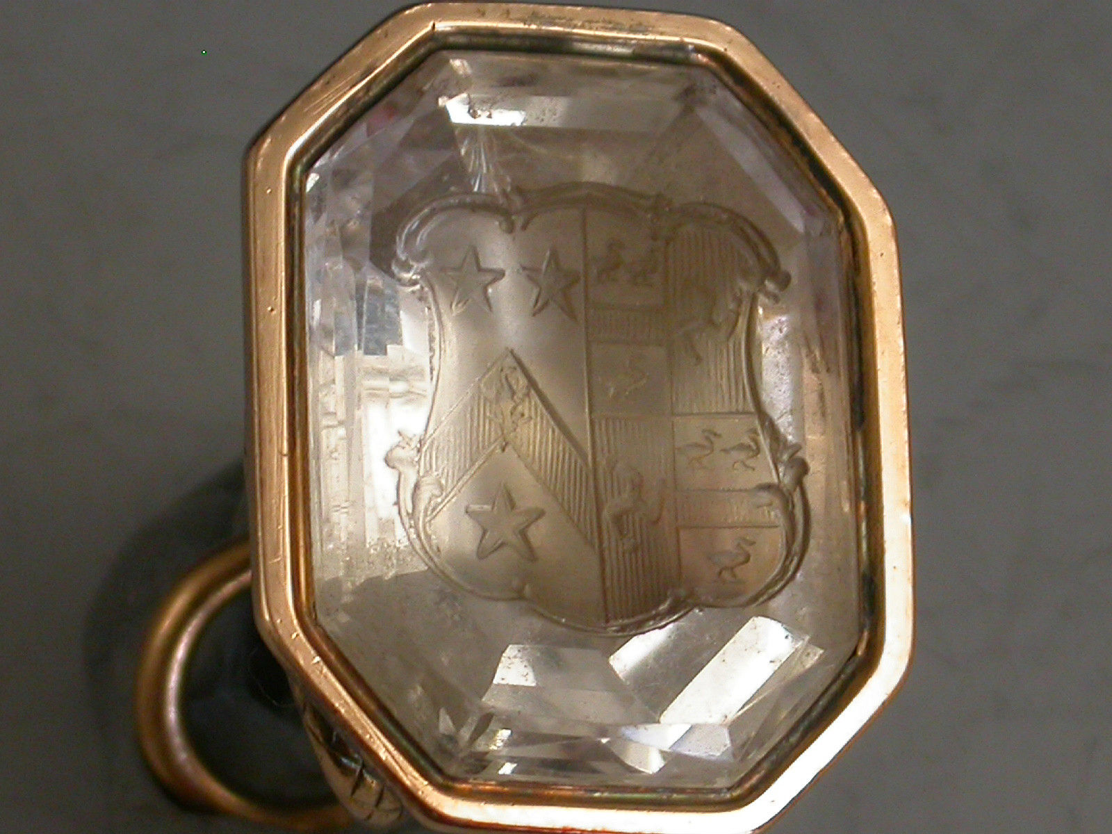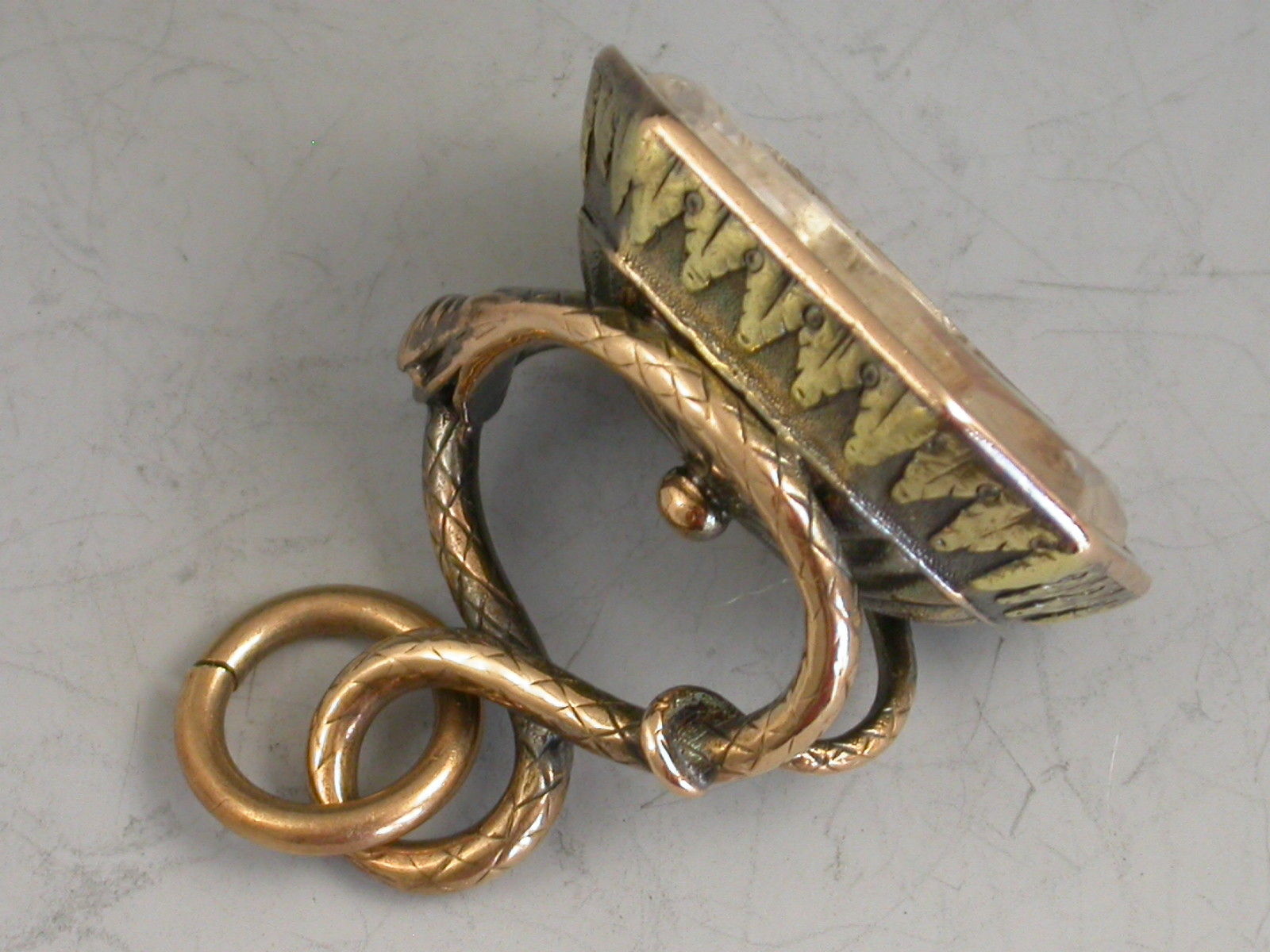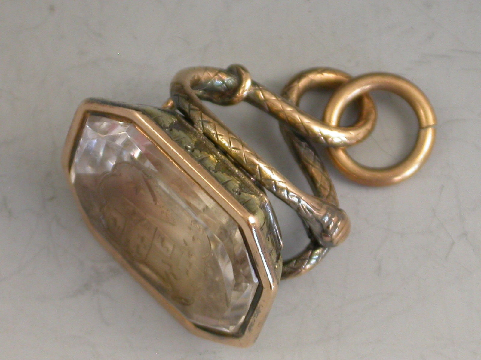 A good early 19th century two colour gold fob Seal, the handle formed from an entwined snake, the cut-cornered rectangular quartz matrix engraved with a coat of arms.
