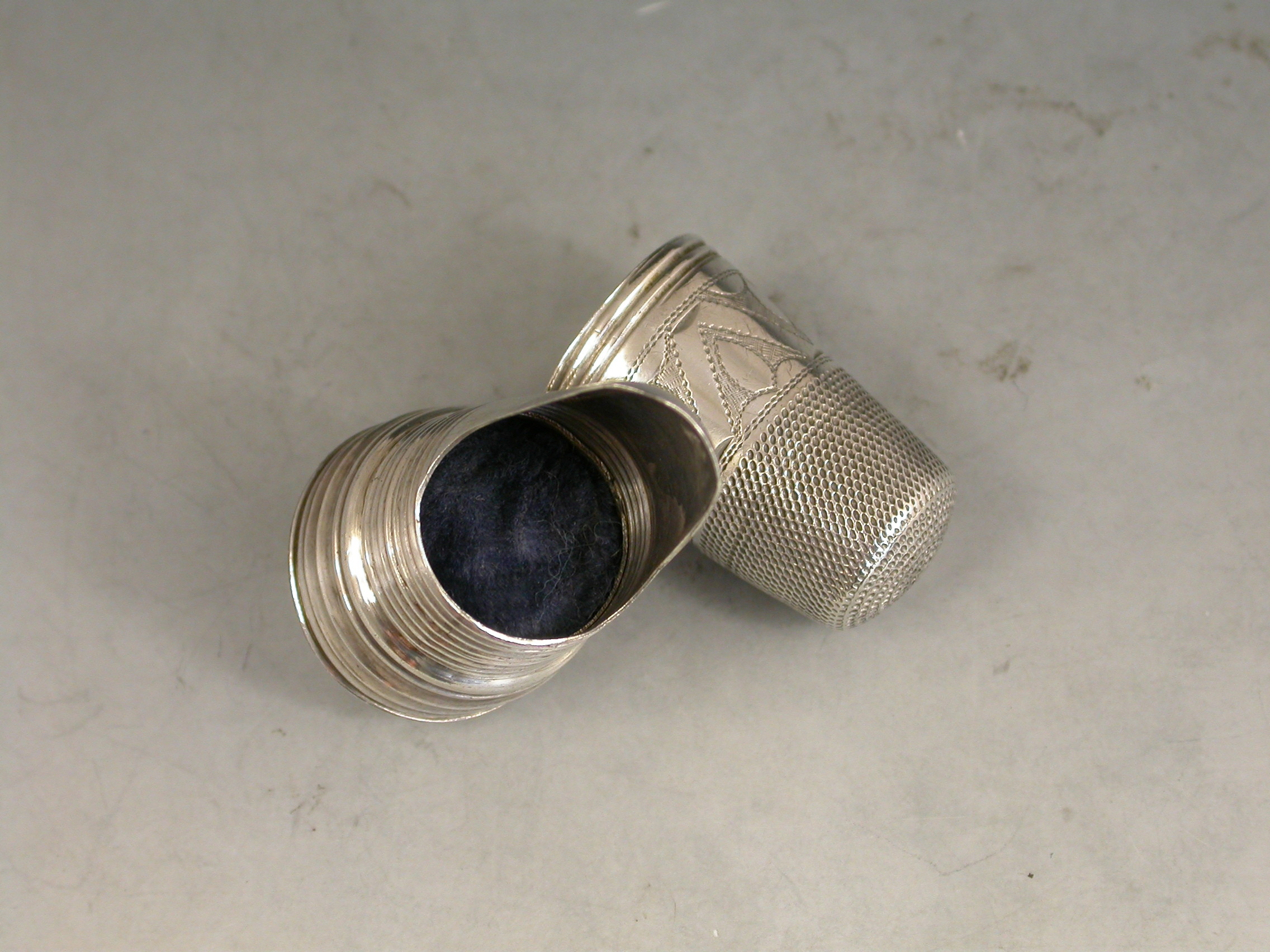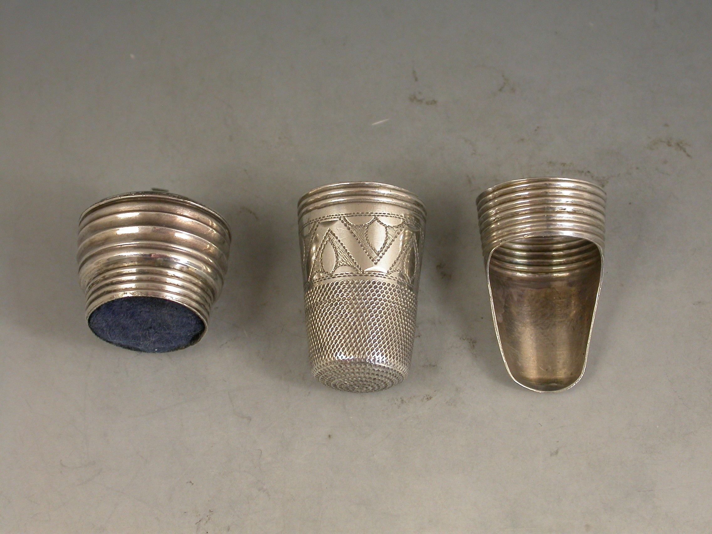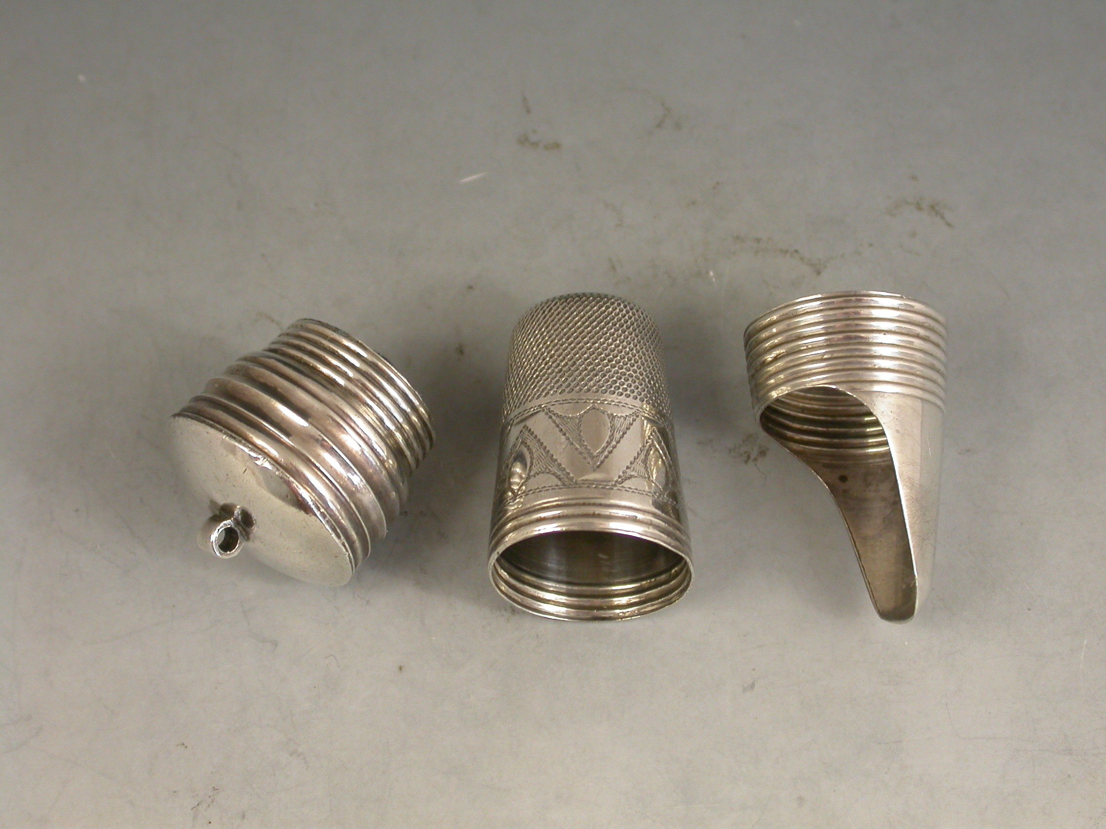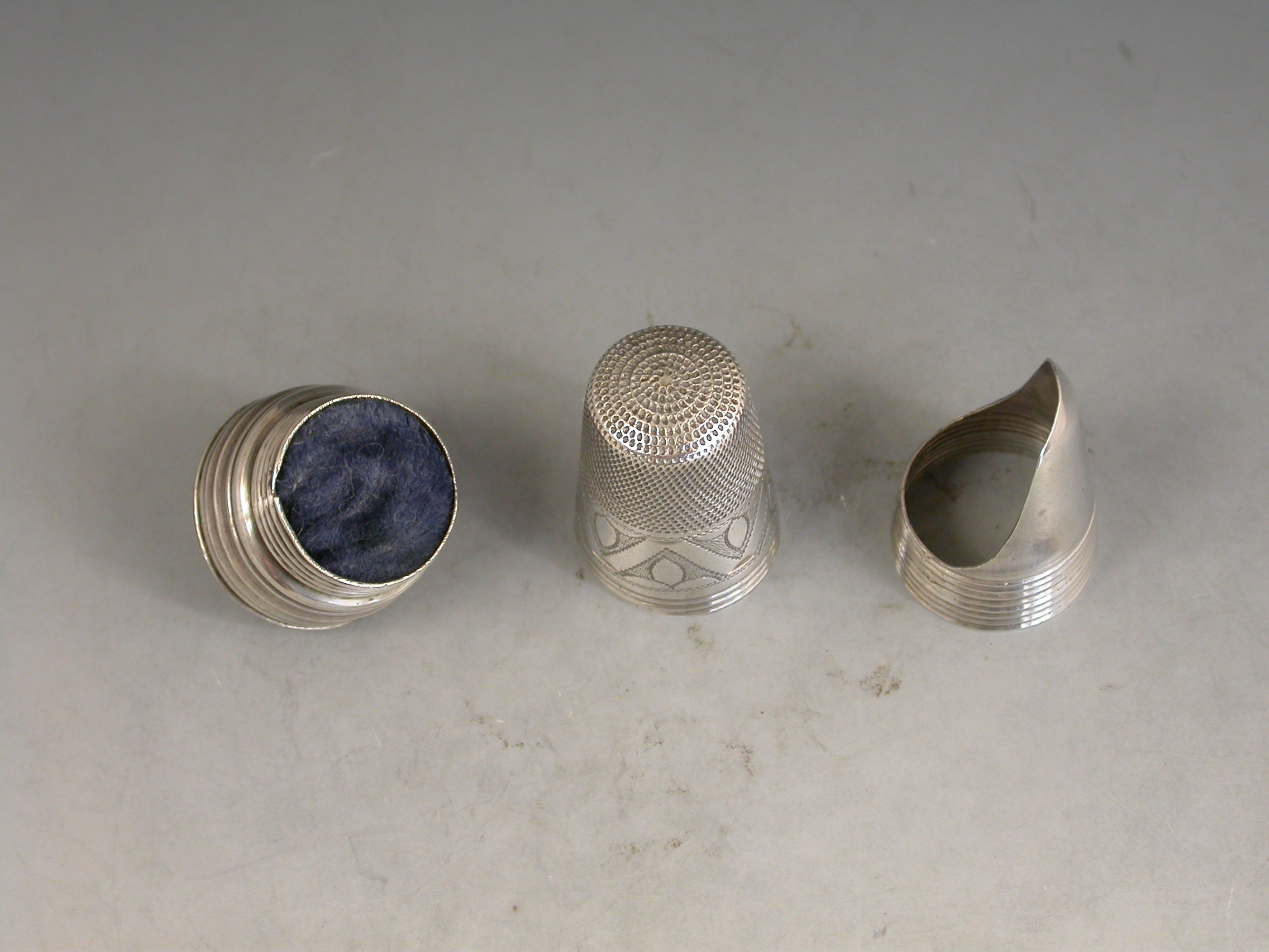 A rare late 19th century combined silver Thimble, Finger Guard and Pin Cushion, the whole screwing together on reeded threads, the pin cushion occupying the base. The thimble with bright-cut engraved decoration and script initials to a square cartouche.