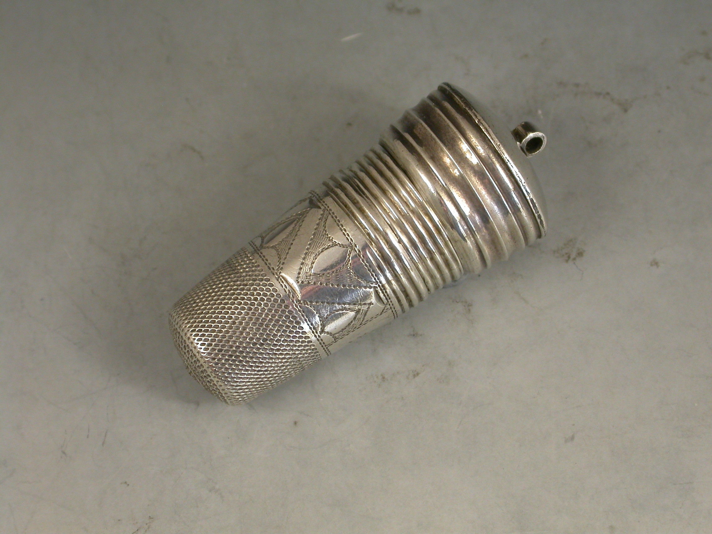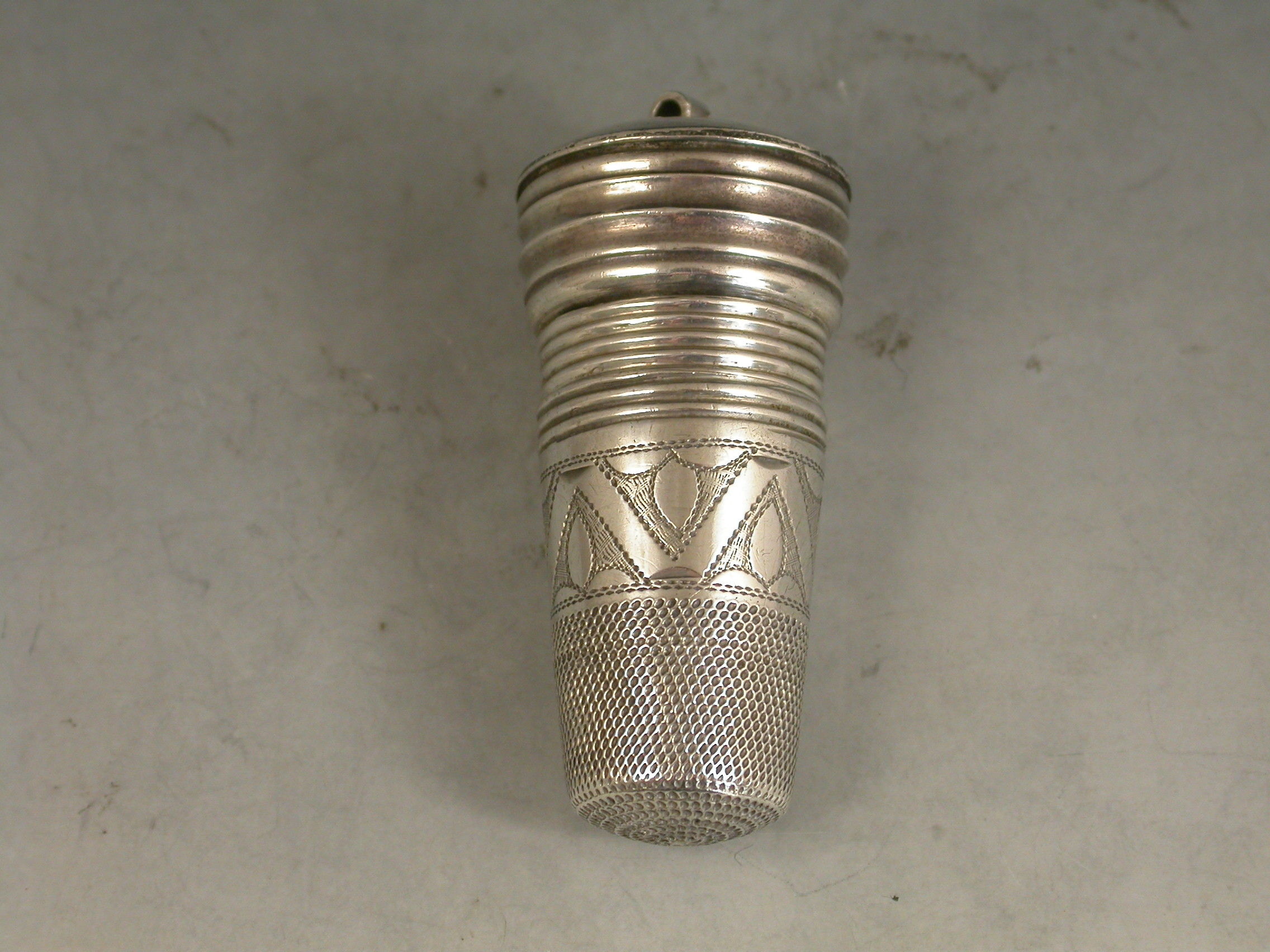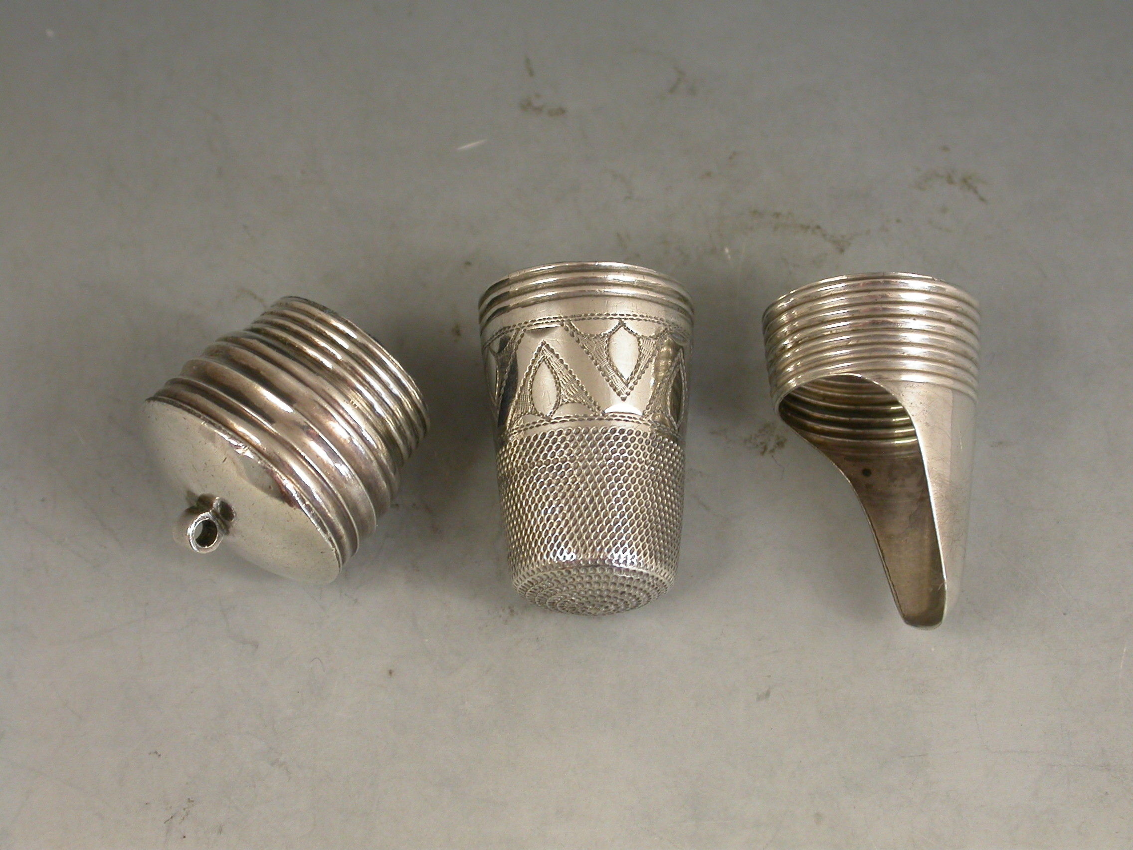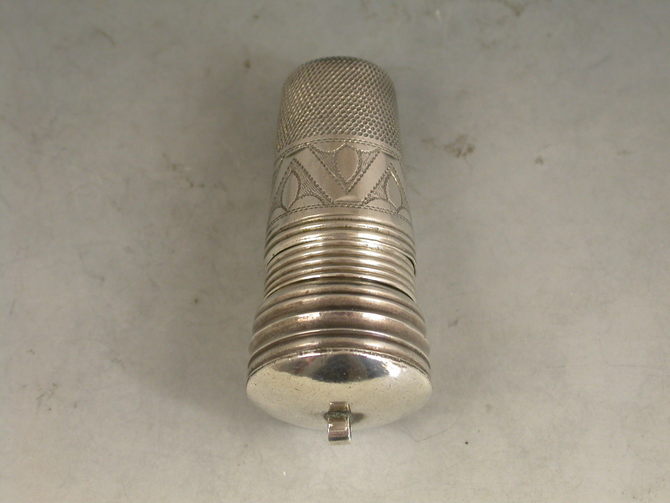 A rare late 19th century combined silver Thimble, Finger Guard and Pin Cushion, the whole screwing together on reeded threads, the pin cushion occupying the base. The thimble with bright-cut engraved decoration and script initials to a square cartouche.