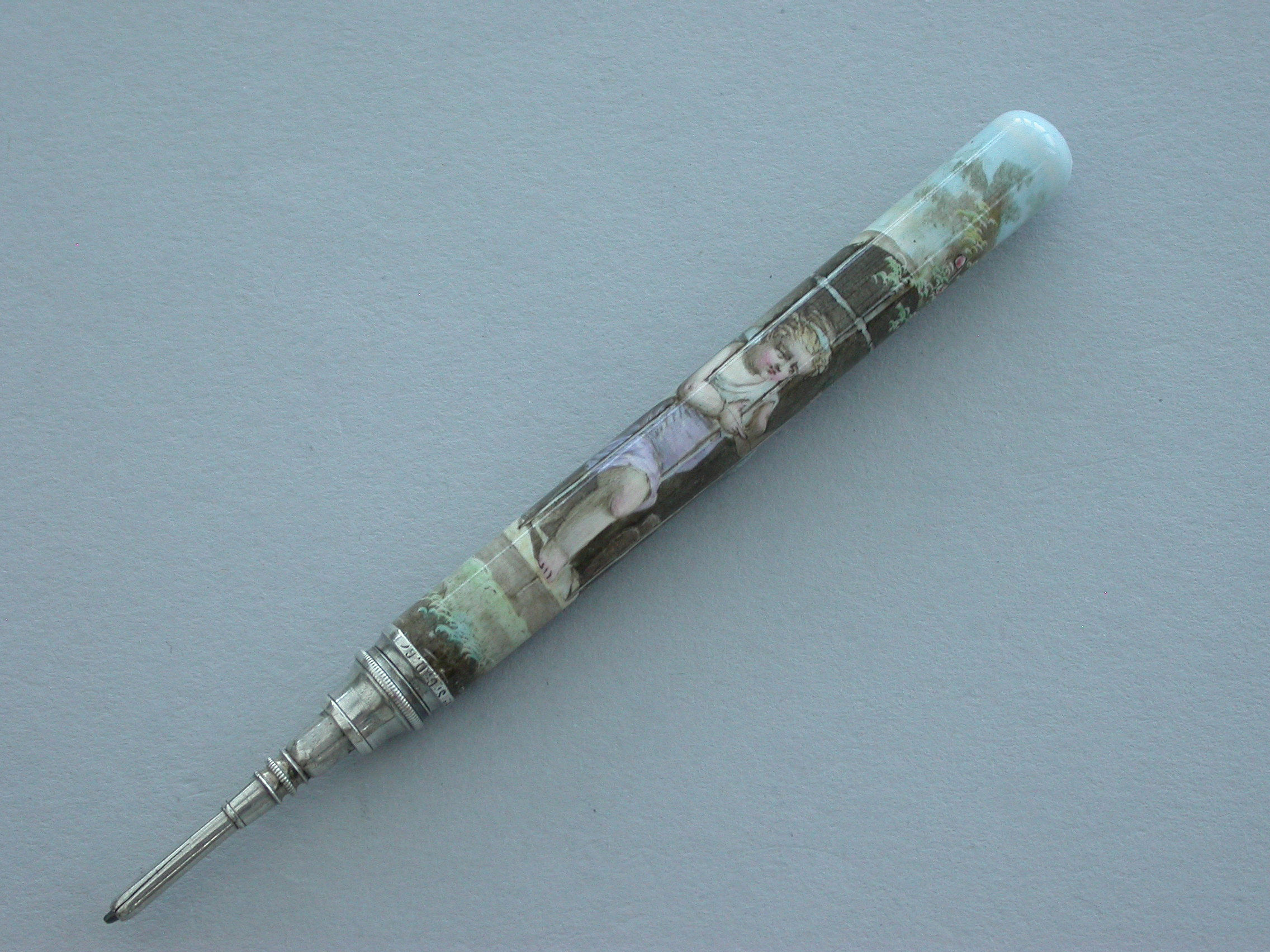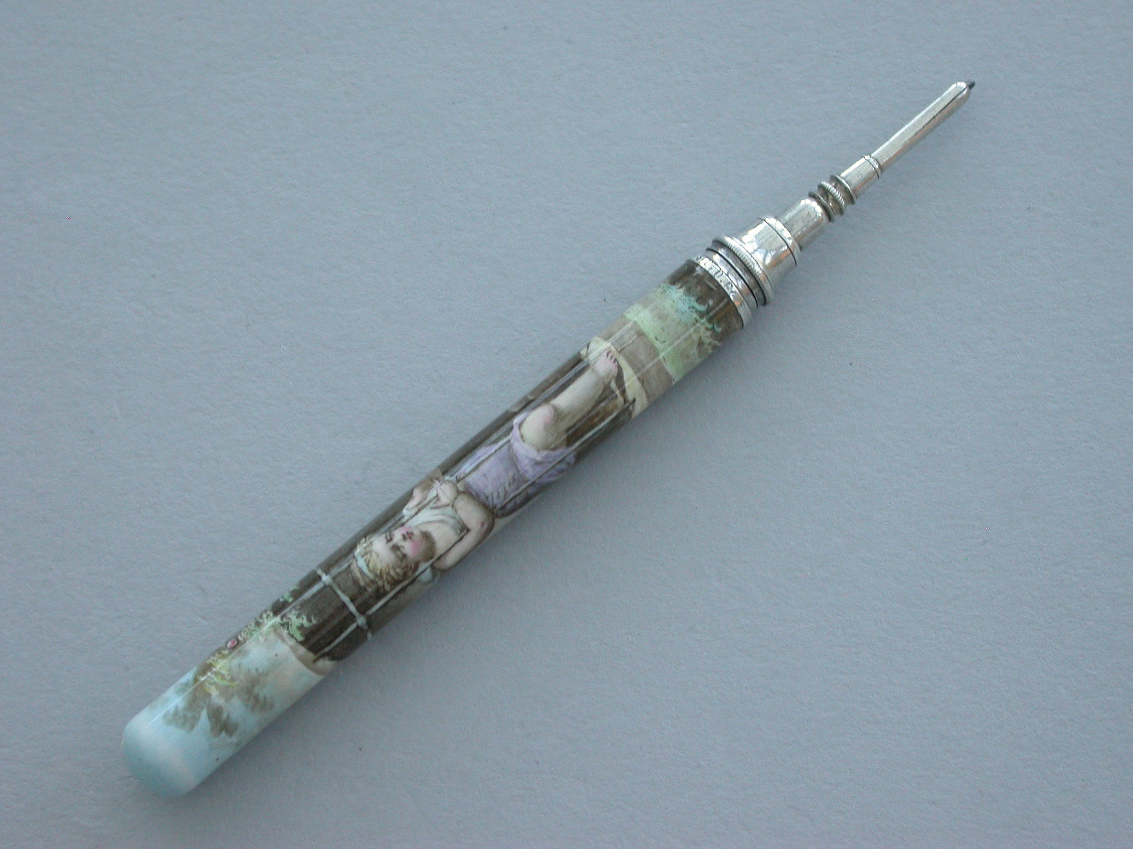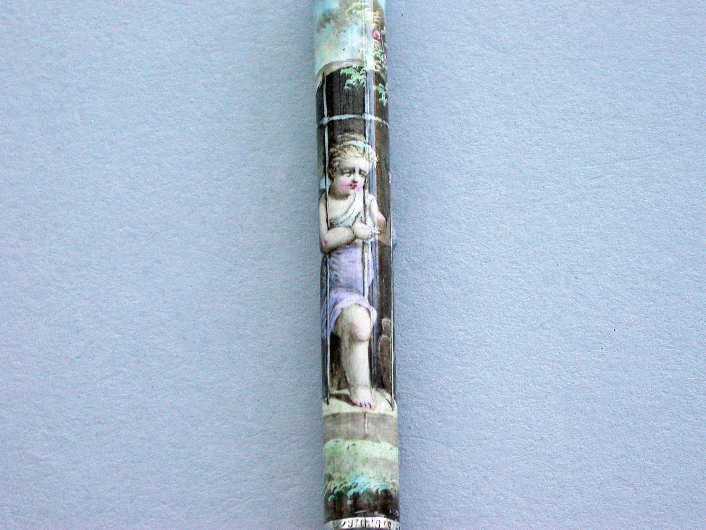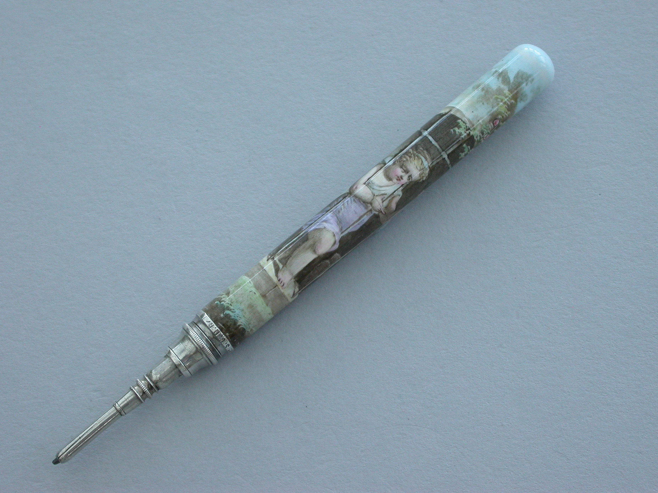 A fine quality late 19th century German silver and enamel Propelling Pencil, the plain cylindrical body fully enameled with a scene depicting a cherub looking out from a barred window onto a garden scene.