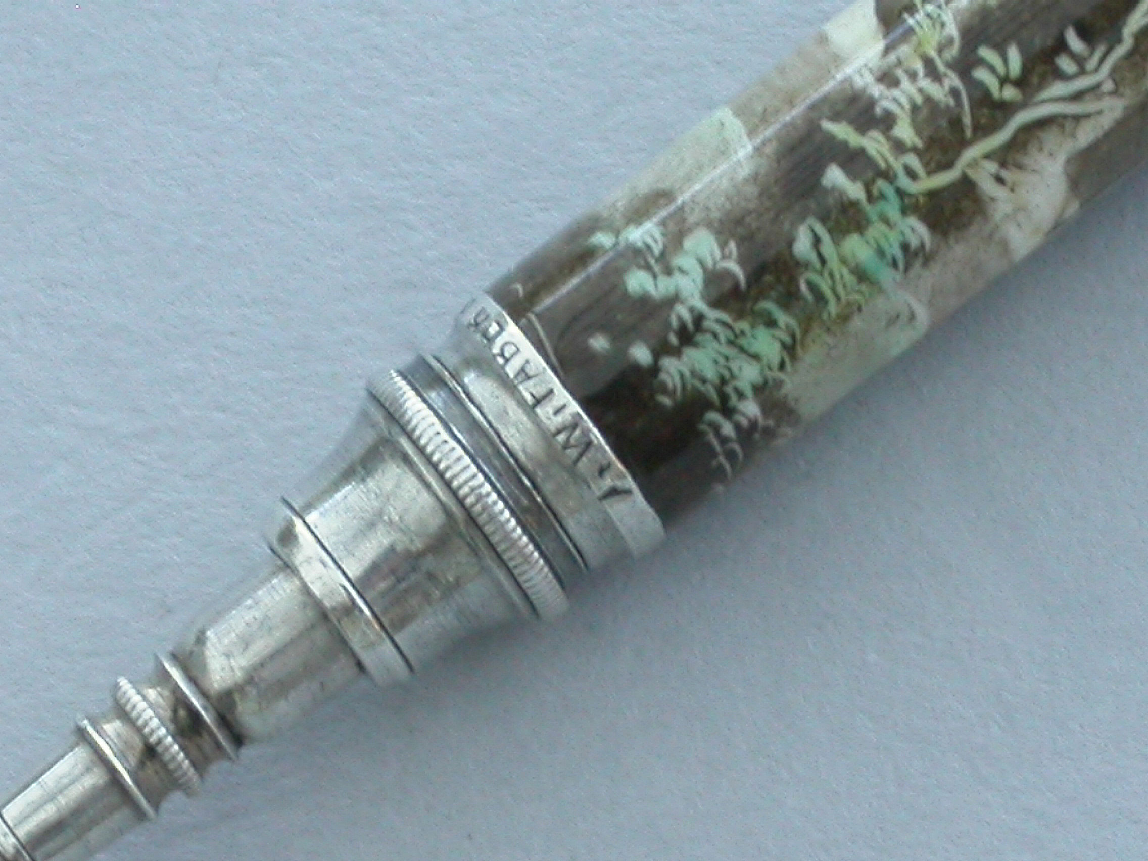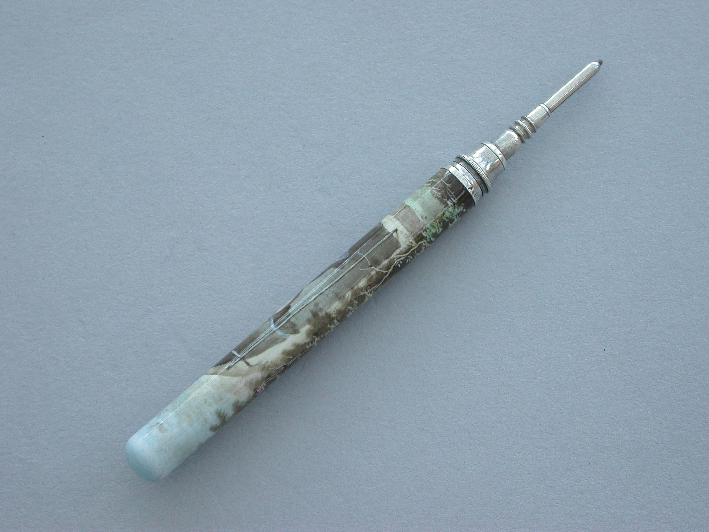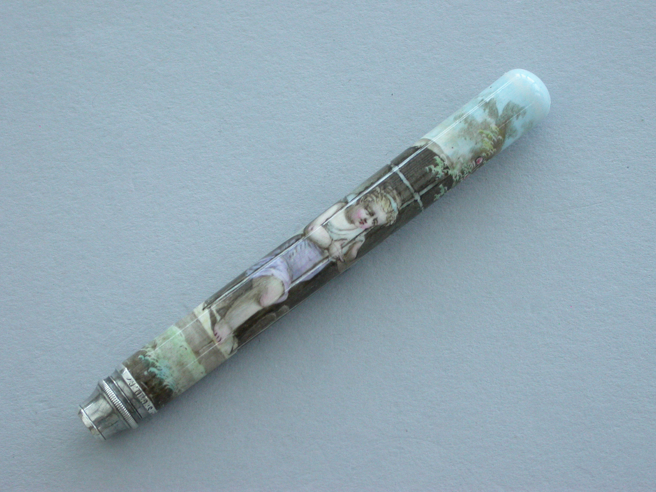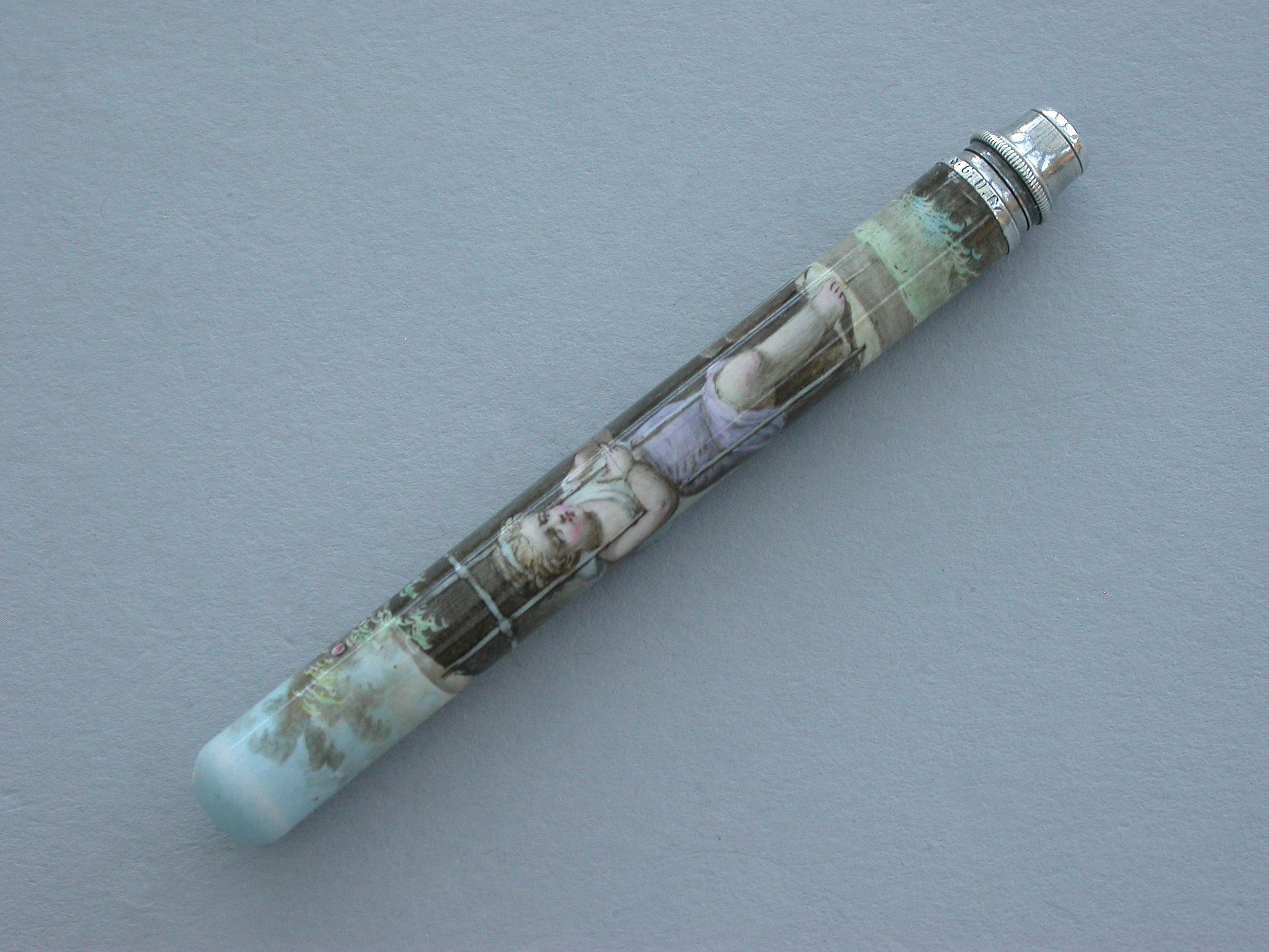 A fine quality late 19th century German silver and enamel Propelling Pencil, the plain cylindrical body fully enameled with a scene depicting a cherub looking out from a barred window onto a garden scene.