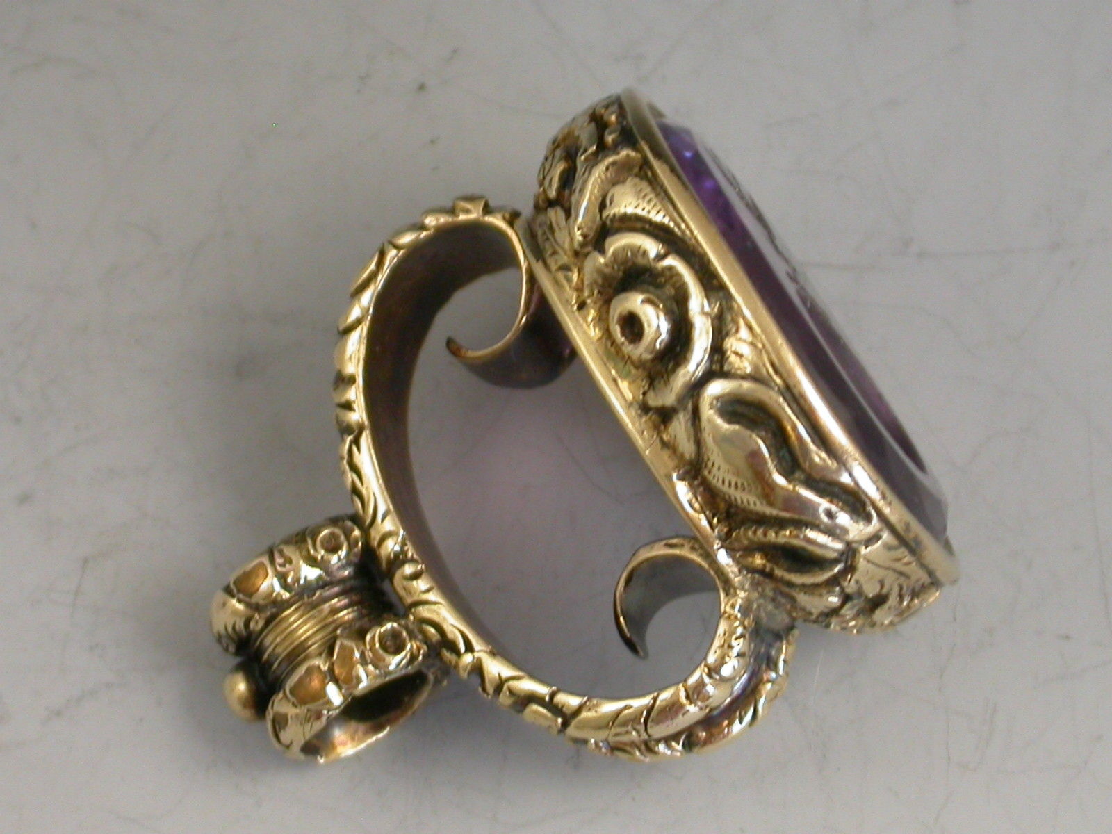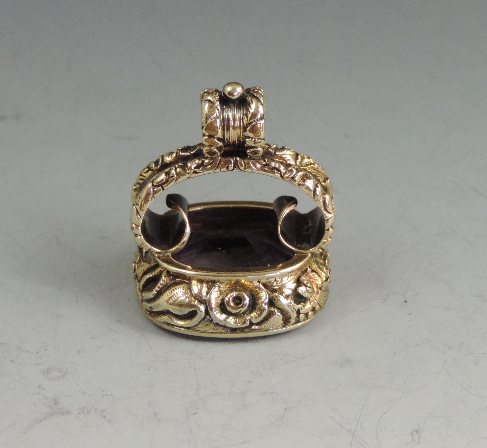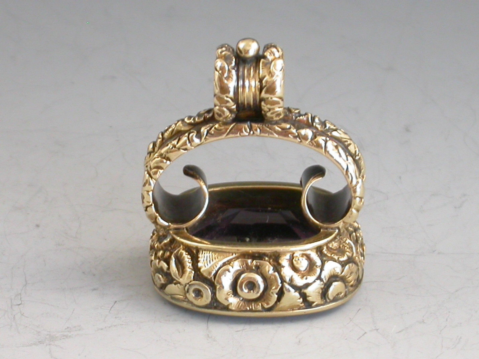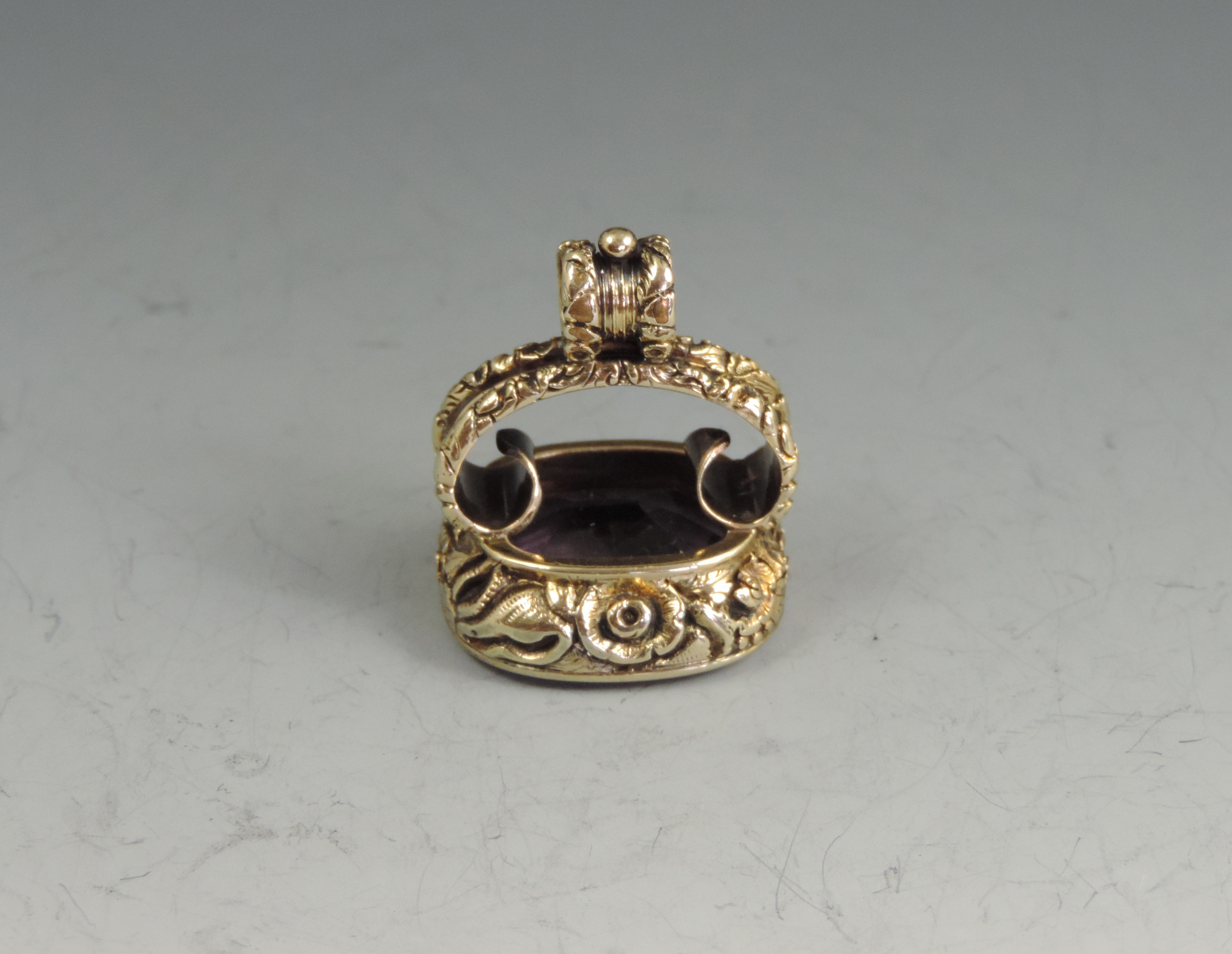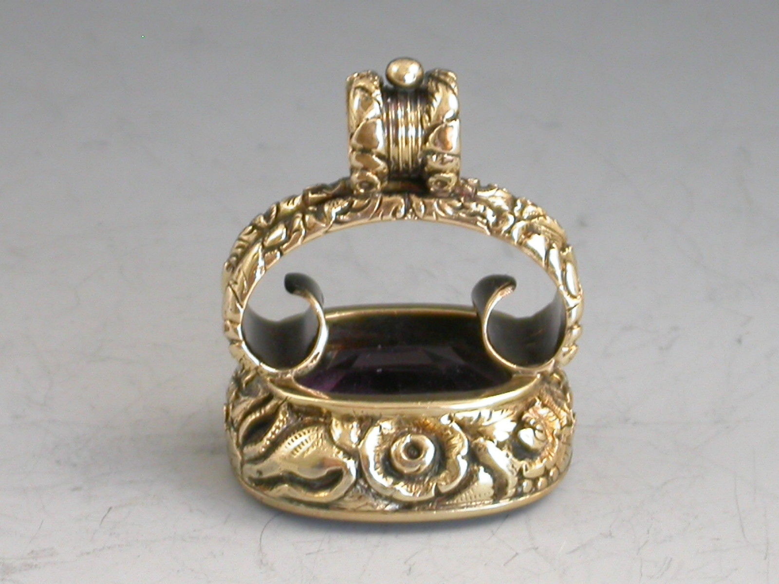 A good mid 19th century gold Fob Seal of stirrup form chased with flower heads and sea shells, set with an Amethyst matrix engraved with a crest of a double-headed eagle above a cartouche with the initials 'IH'.