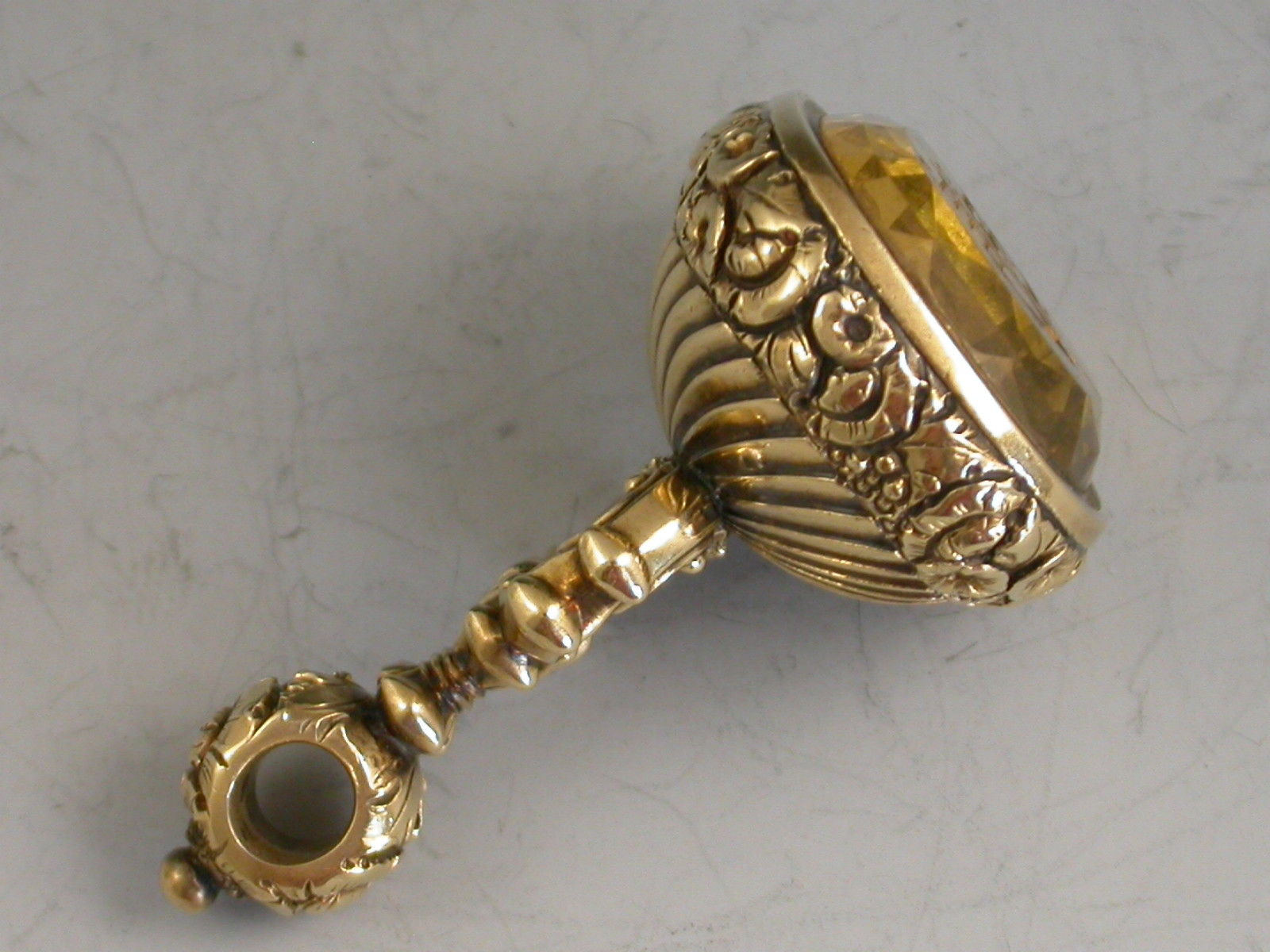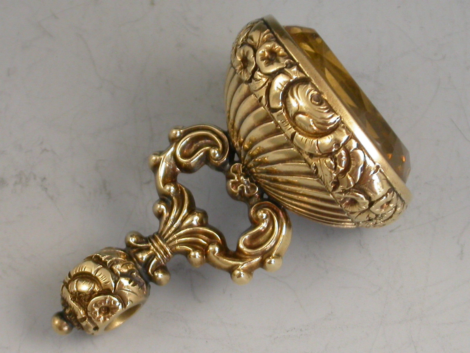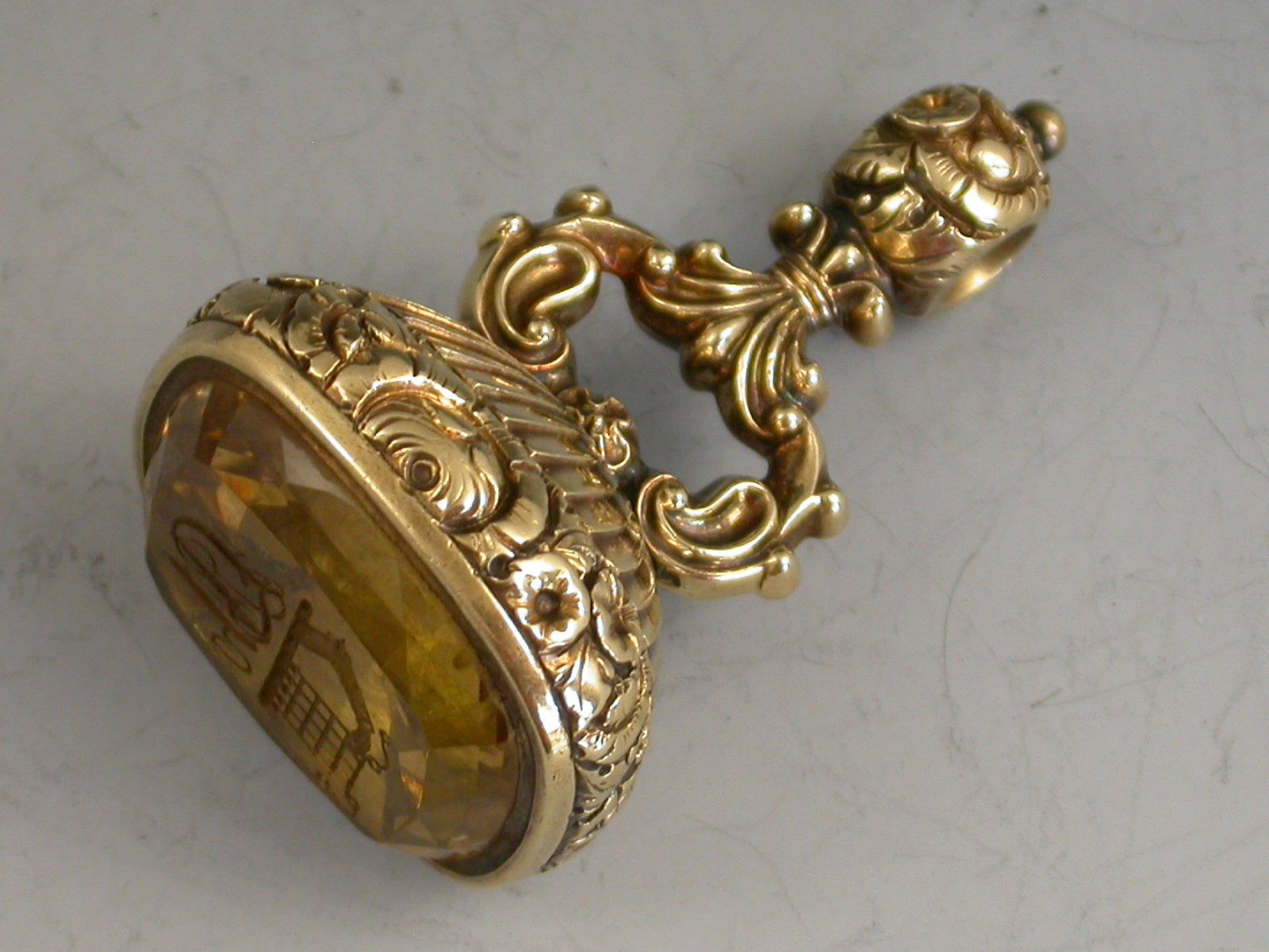 A good mid 19th century gold fob Seal, the body chased with flower heads, flutes and scrolls, the large oval-cut citrine matrix engraved with the crest of Firebrace (a dexter arm in armour embowed, supporting a portcullis chained and resting on a wreath), and the initials 'WF'.