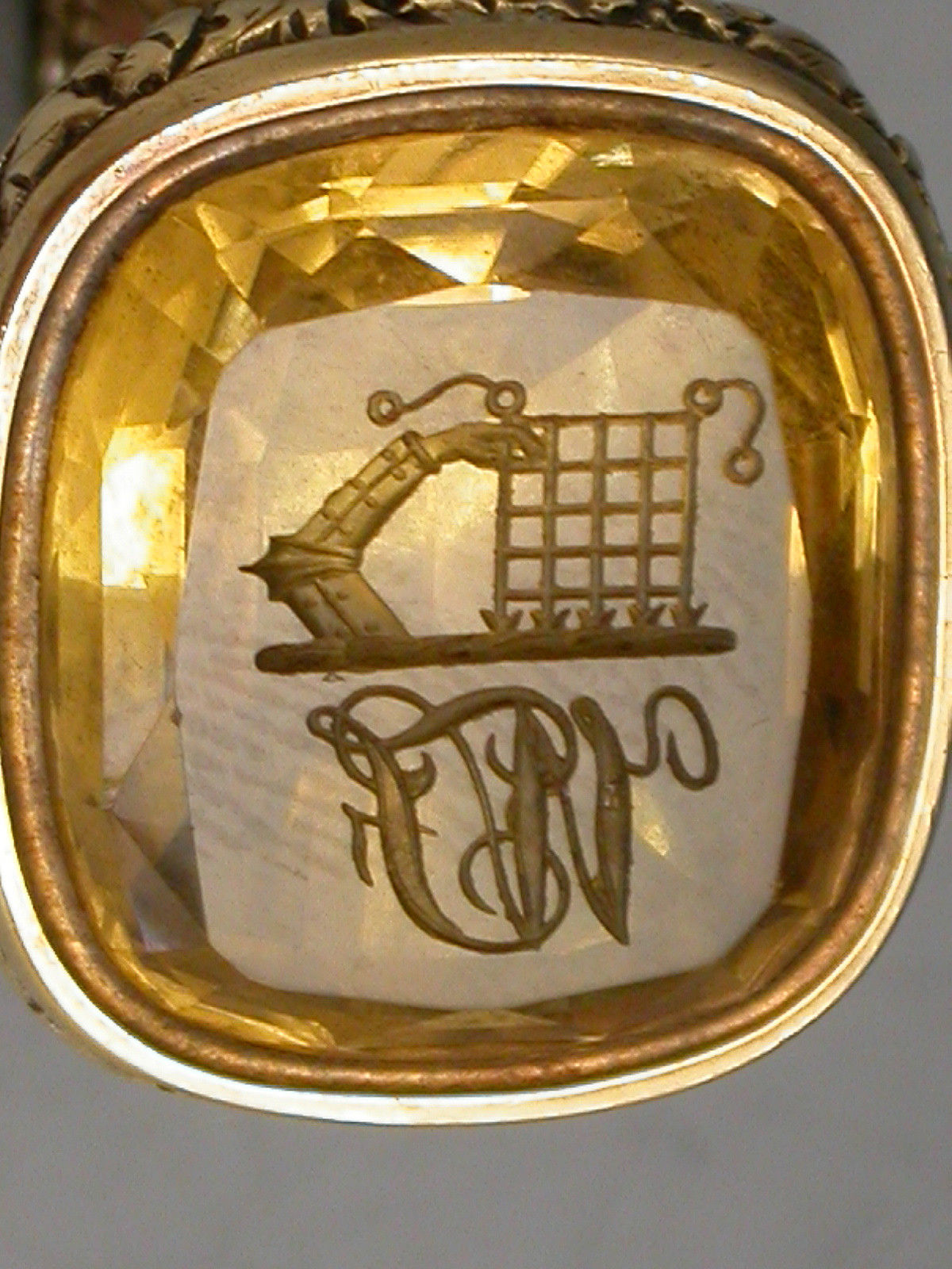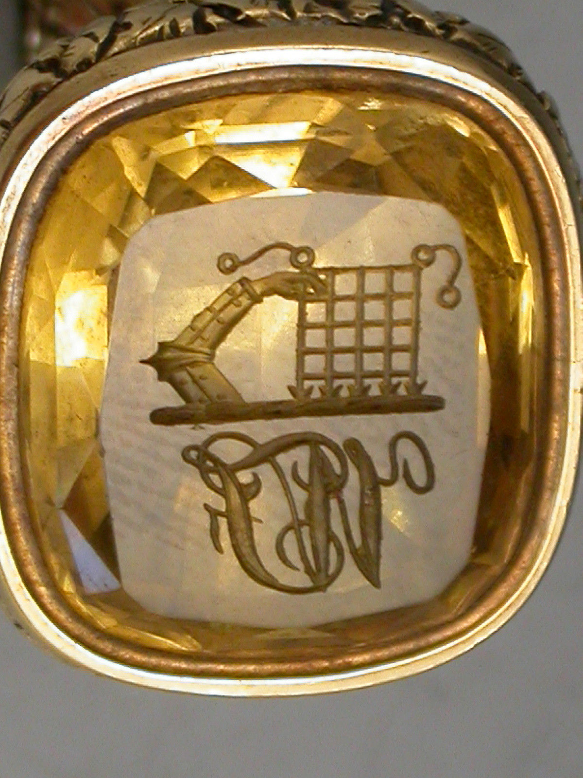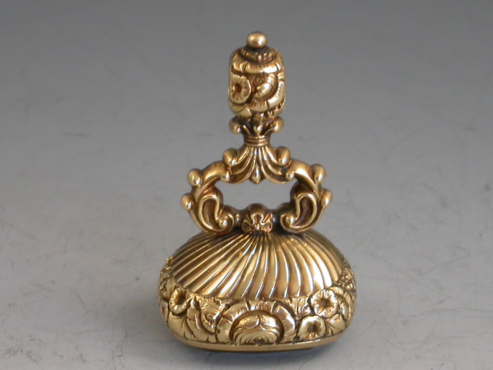 A good mid 19th century gold fob Seal, the body chased with flower heads, flutes and scrolls, the large oval-cut citrine matrix engraved with the crest of Firebrace (a dexter arm in armour embowed, supporting a portcullis chained and resting on a wreath), and the initials 'WF'.