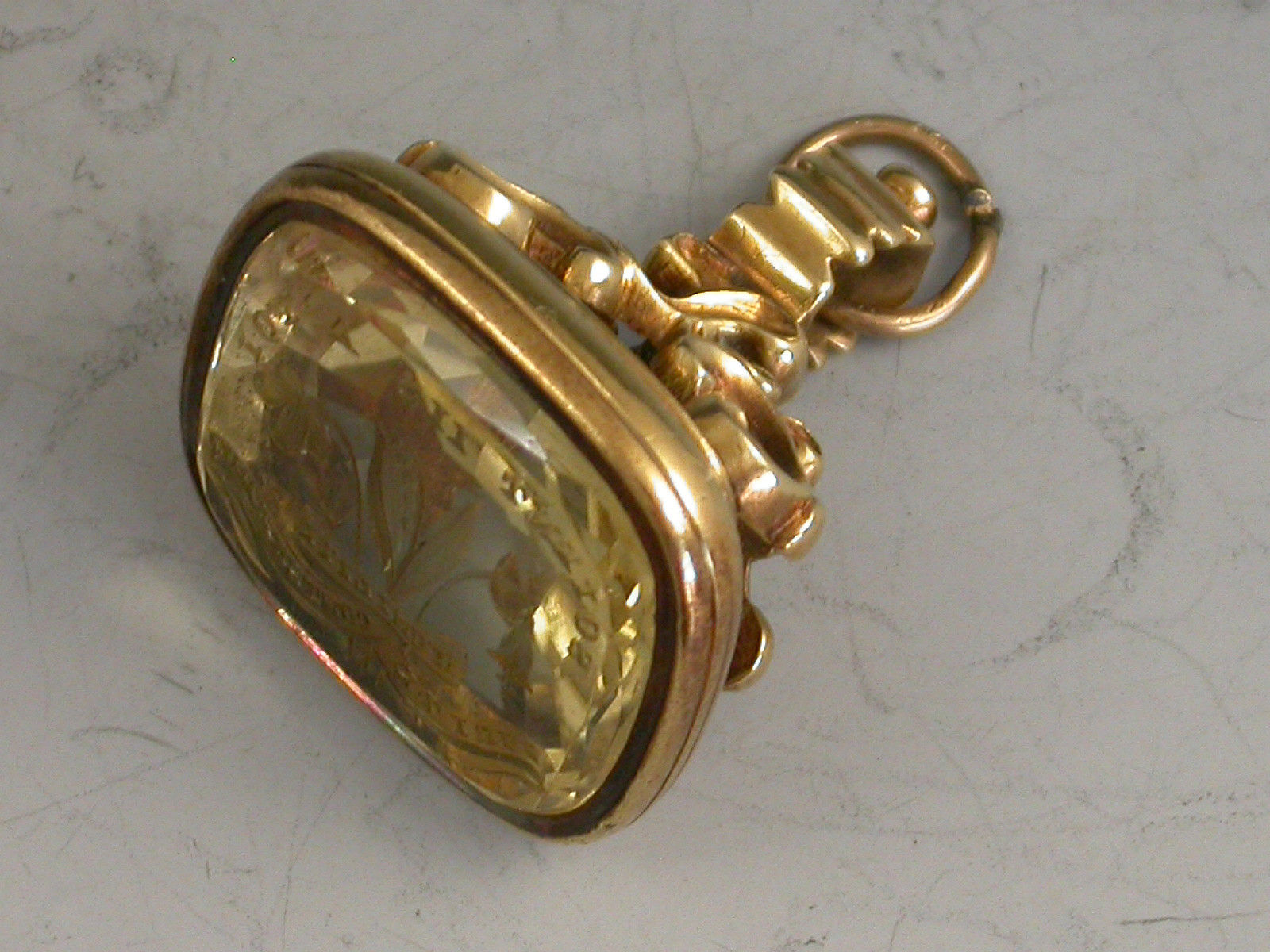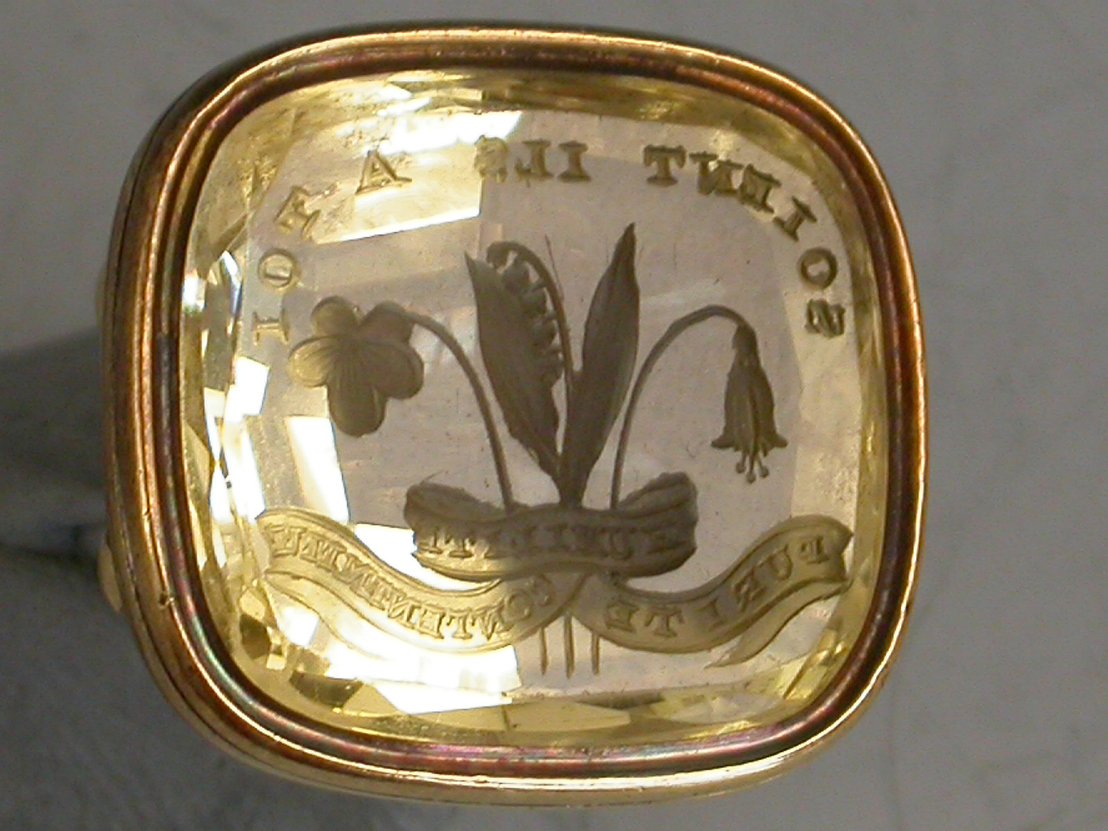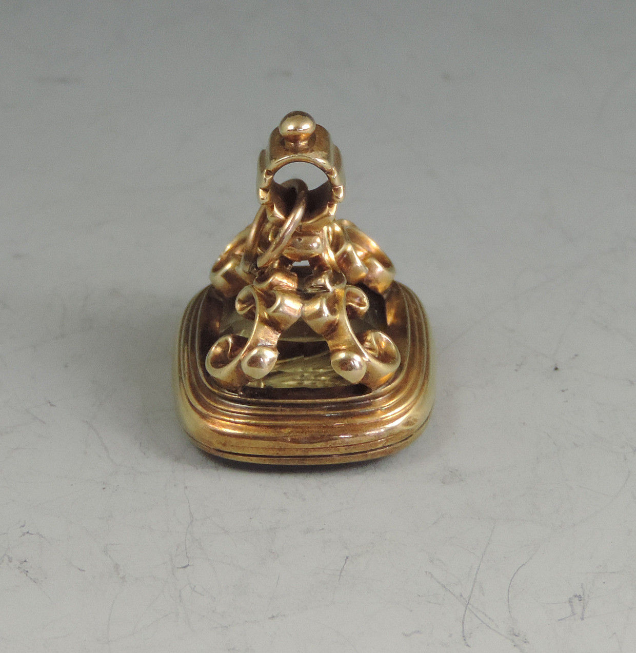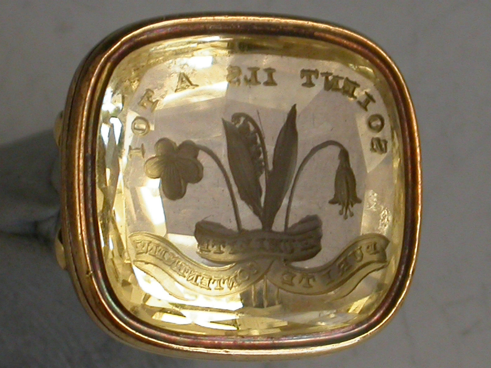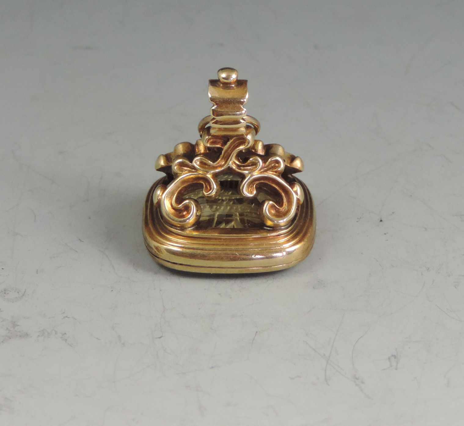A mid 19th century gold Fob Seal on four scroll supports, the rounded rectangular citrine matrix engraved with a crest depicting three different flowers below the motto 'Soient Ils A Toi' (They are Three), a scrolled banner also engraved with a motto representing - humility, purity and contentment ?