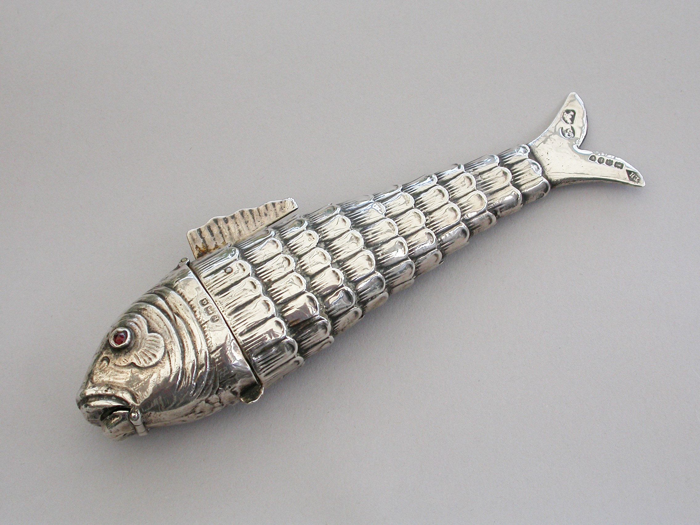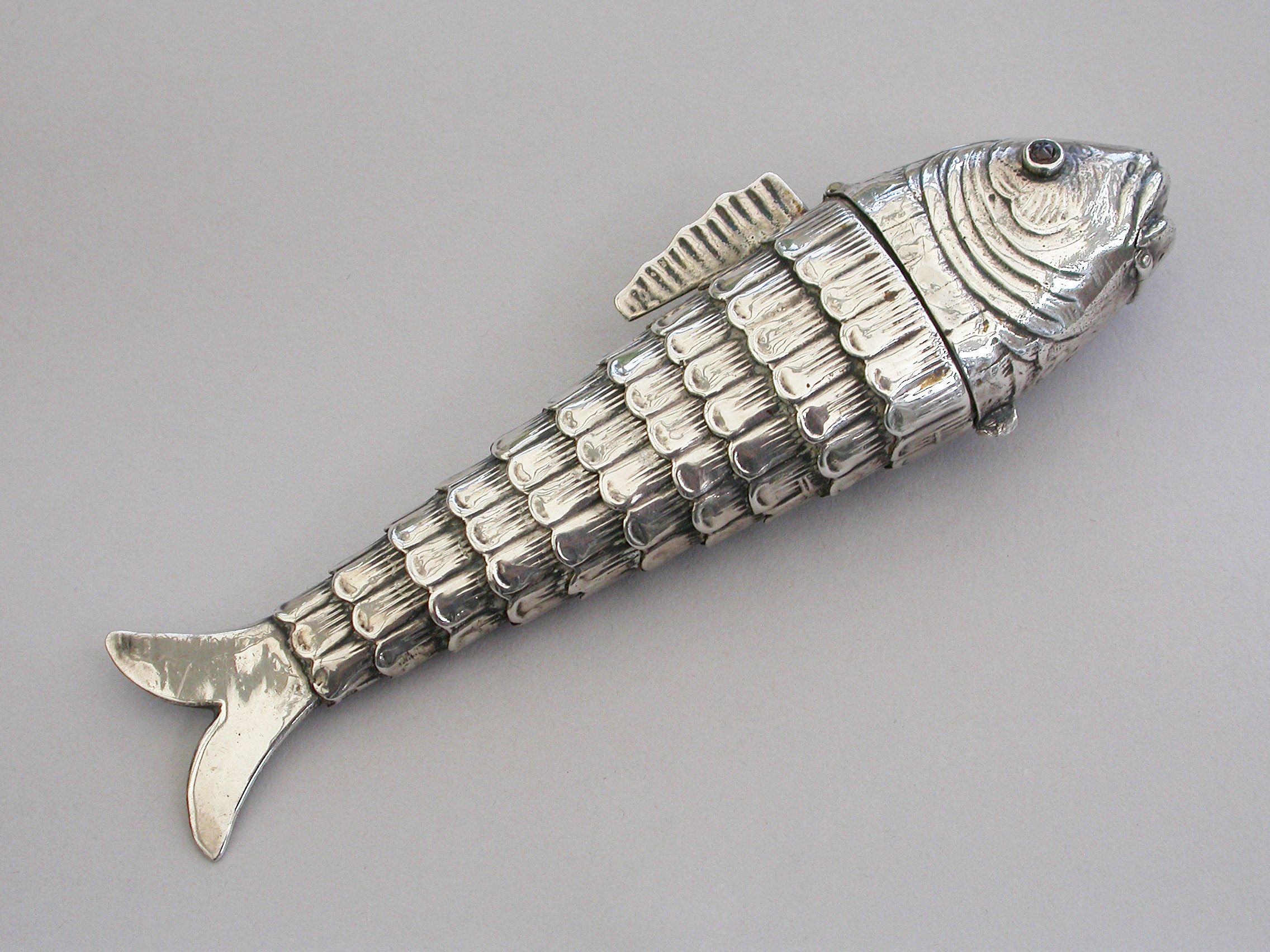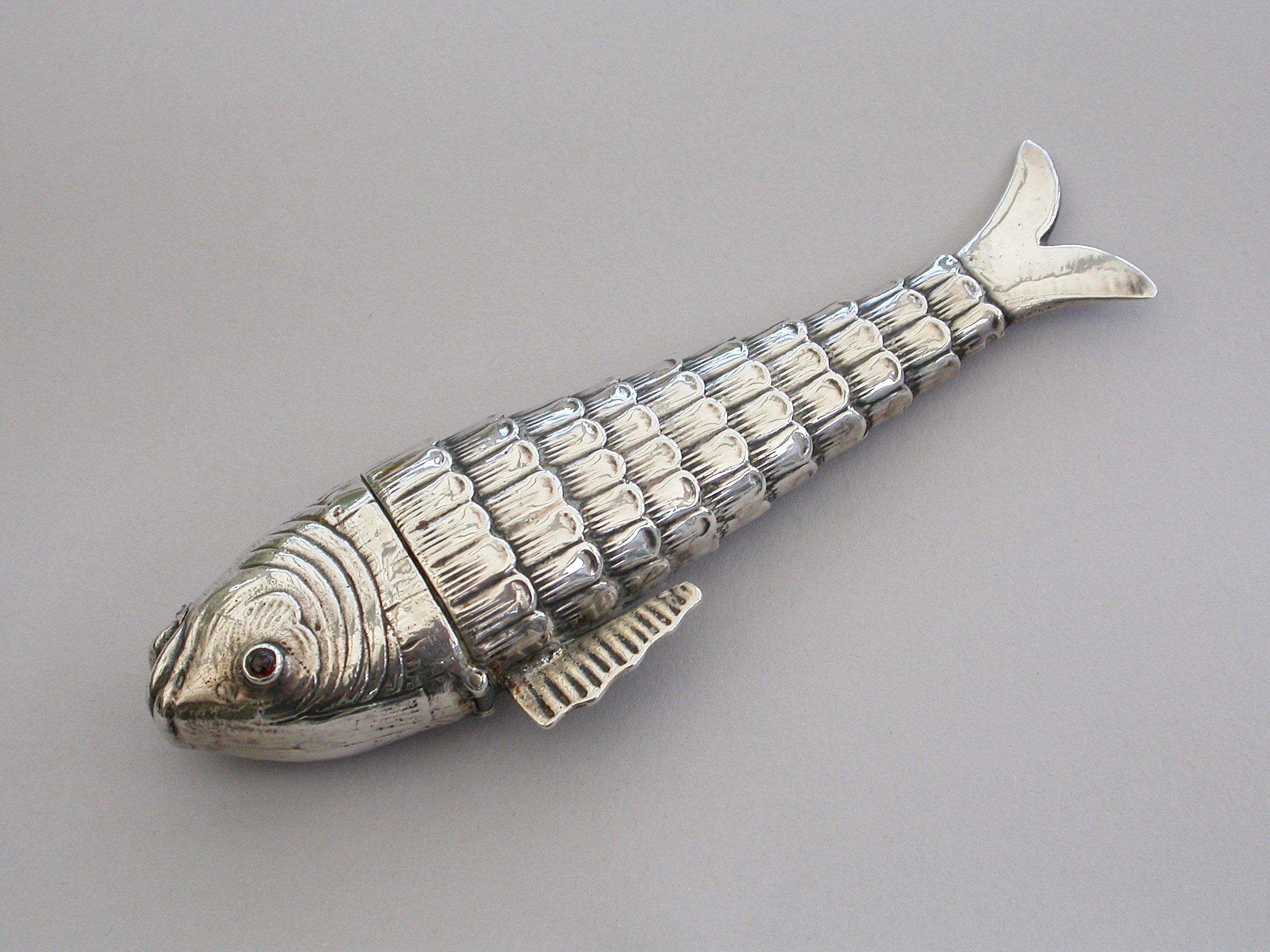 A late 19th century German novelty silver Spice Box, made in the form of a fish with multi-section articulated body and hinged lid to the head, with red glass eyes. The articulated body with realistically engraved fins and scales.