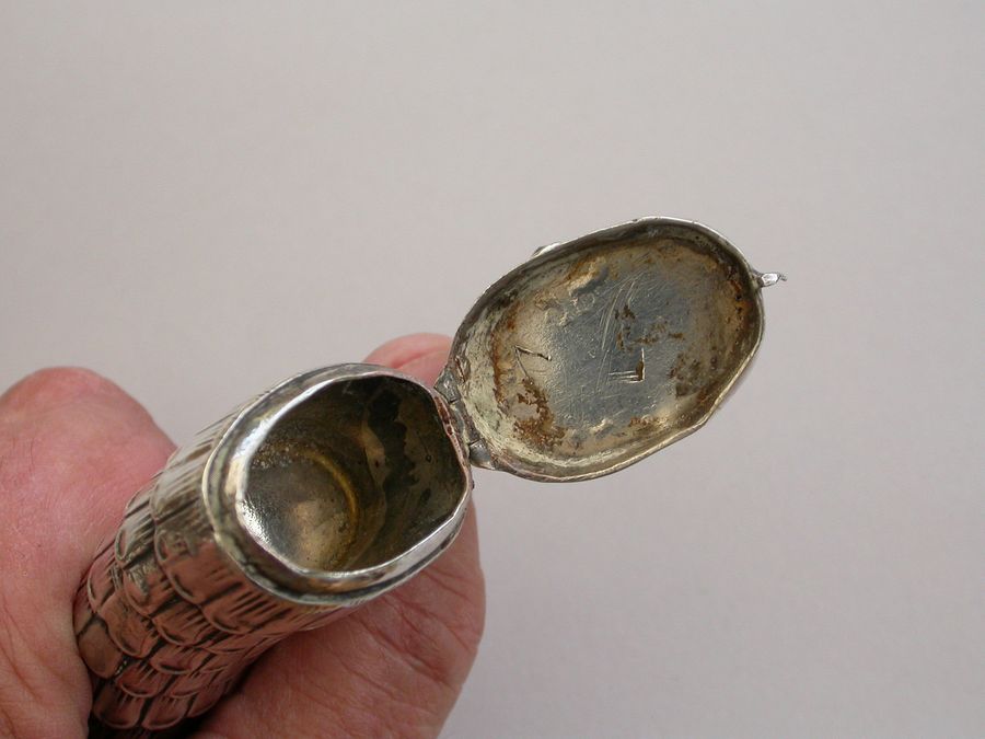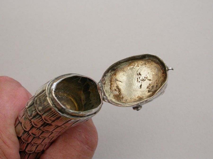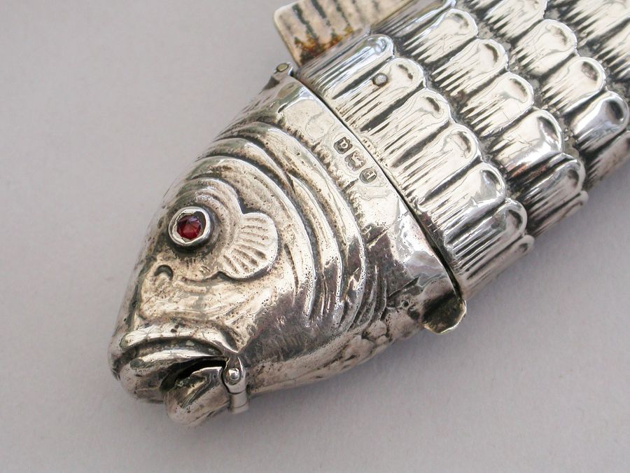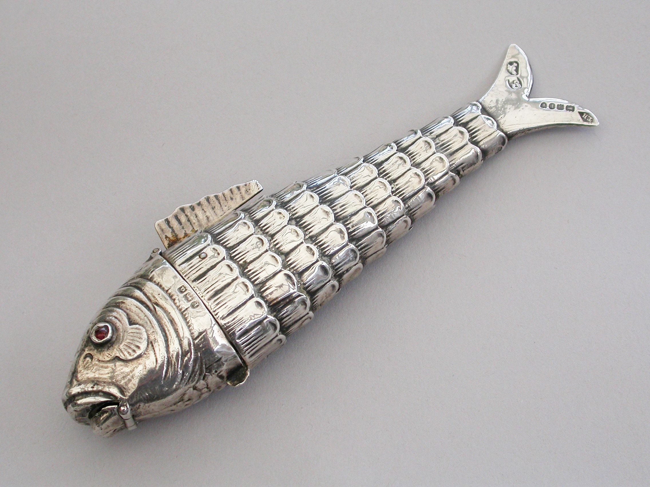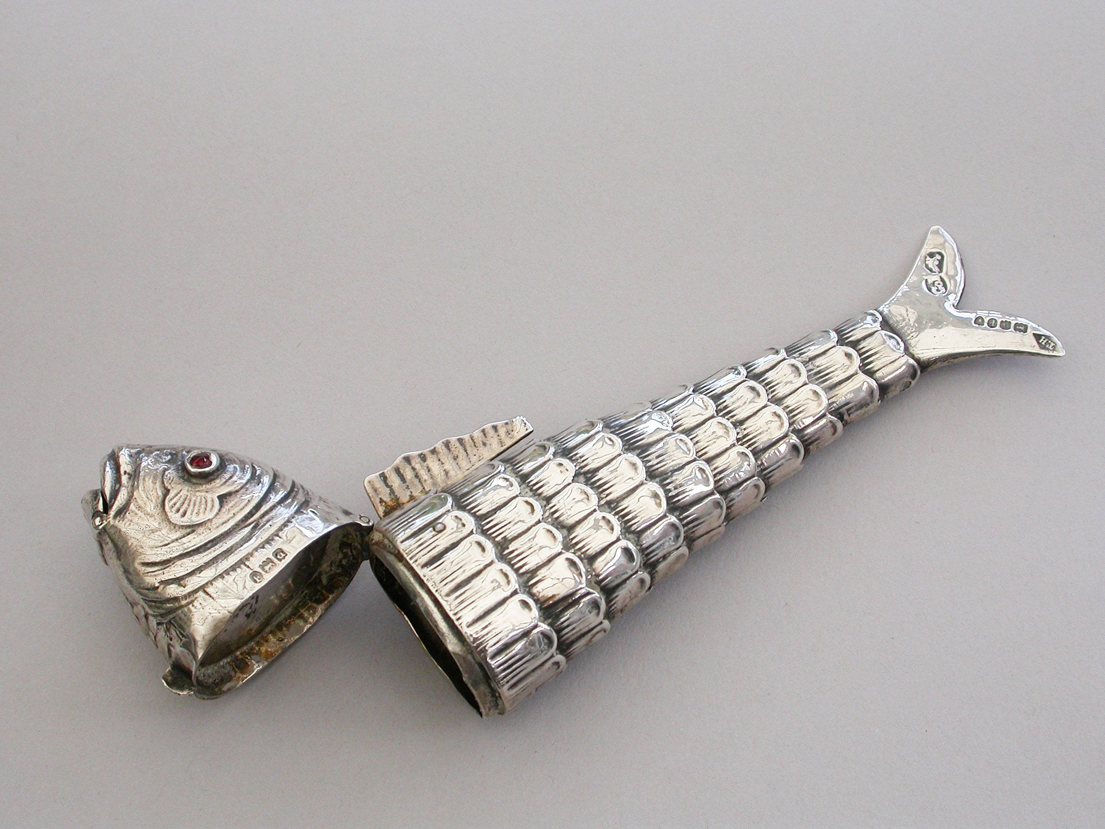 A late 19th century German novelty silver Spice Box, made in the form of a fish with multi-section articulated body and hinged lid to the head, with red glass eyes. The articulated body with realistically engraved fins and scales.