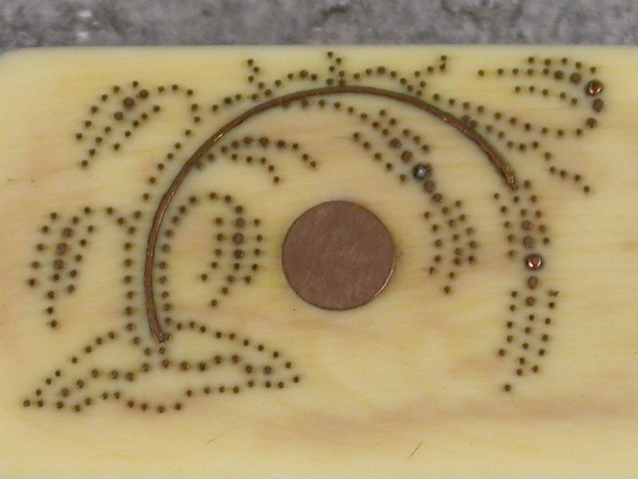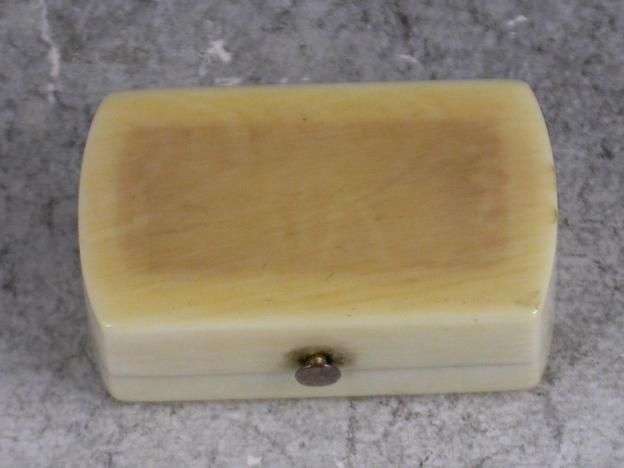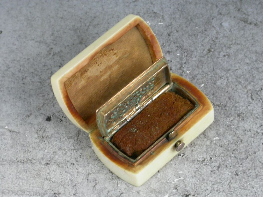 A rare mid 19th century ivory Vinaigrette of rounded rectangular form, the lid inset with gold pique work depicting a fern and a vacant circular cartouche, the interior with hinged grille pierced with a fern pattern and complete with original sponge.