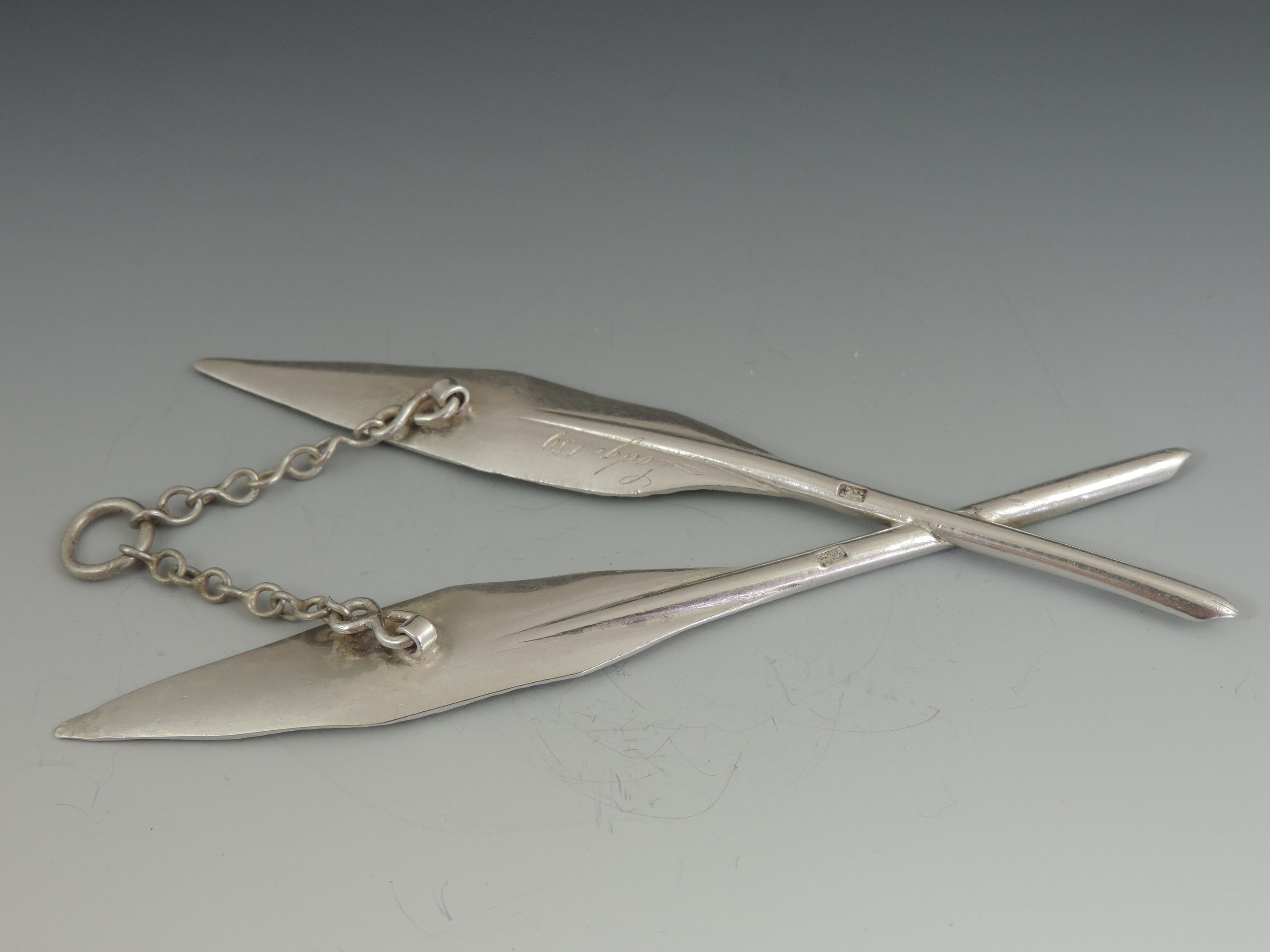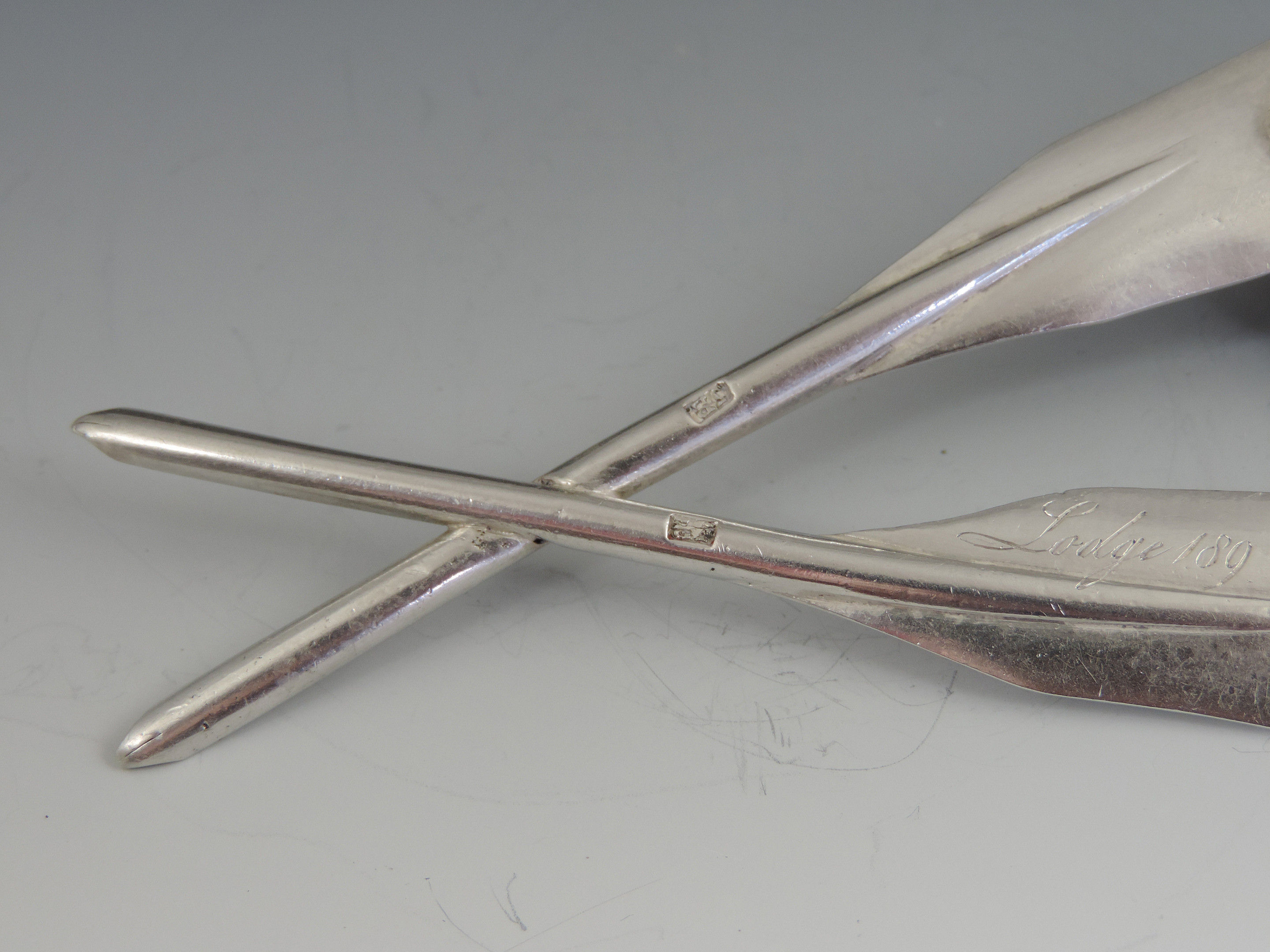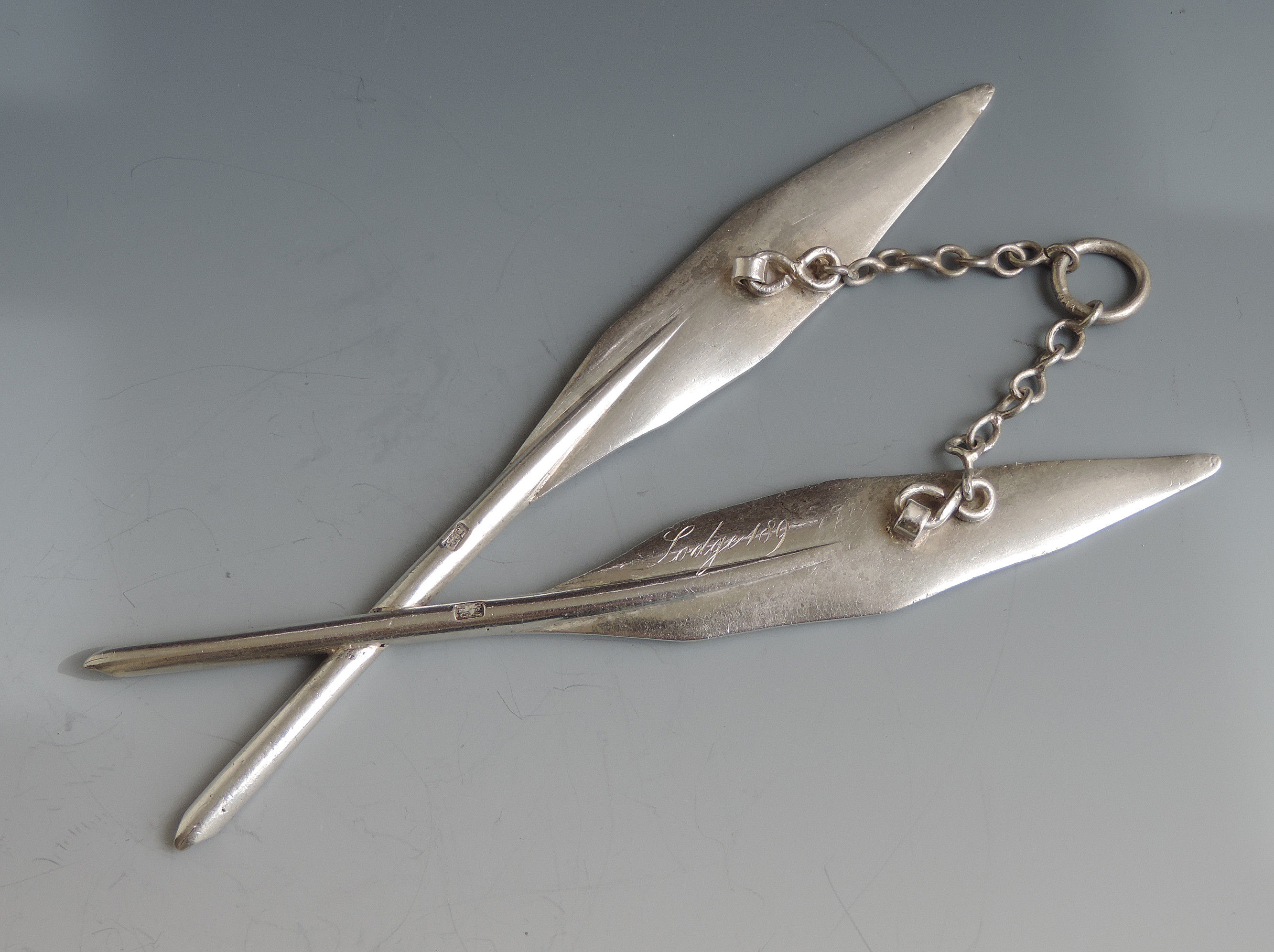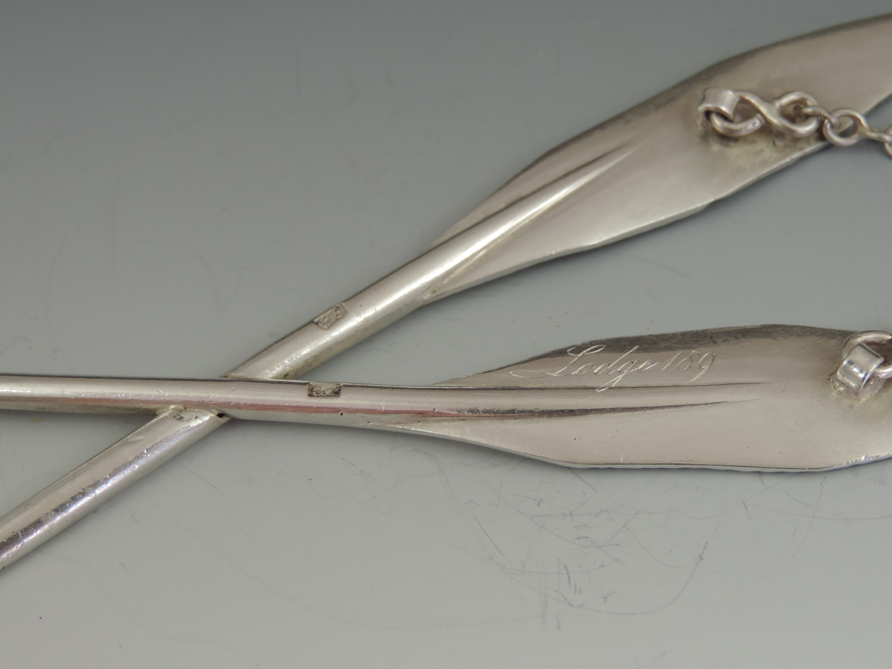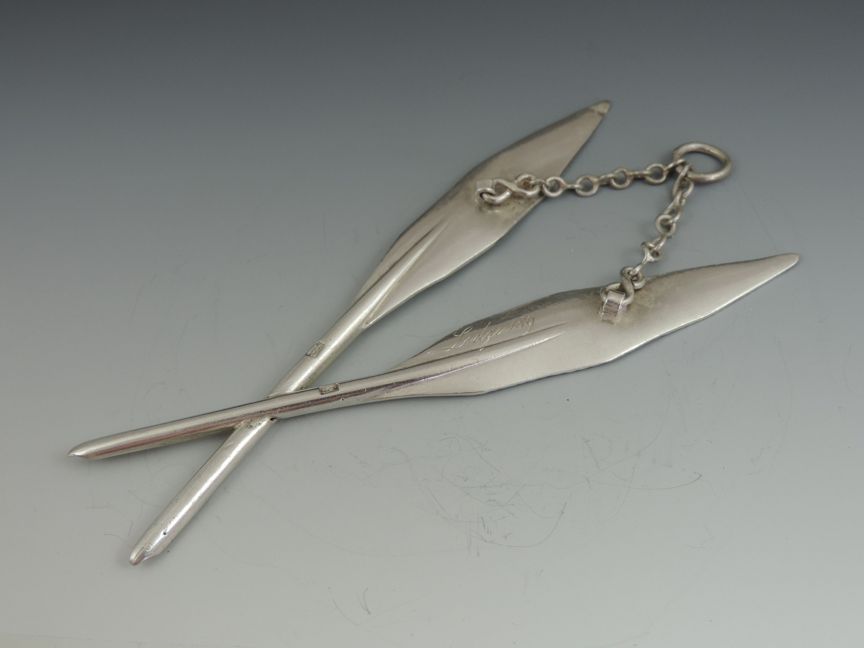 A 19th century Masonic silver Secretaries Jewel formed as two crossed Quill Pens, complete with suspension chain, the reverse engraved Lodge 189.