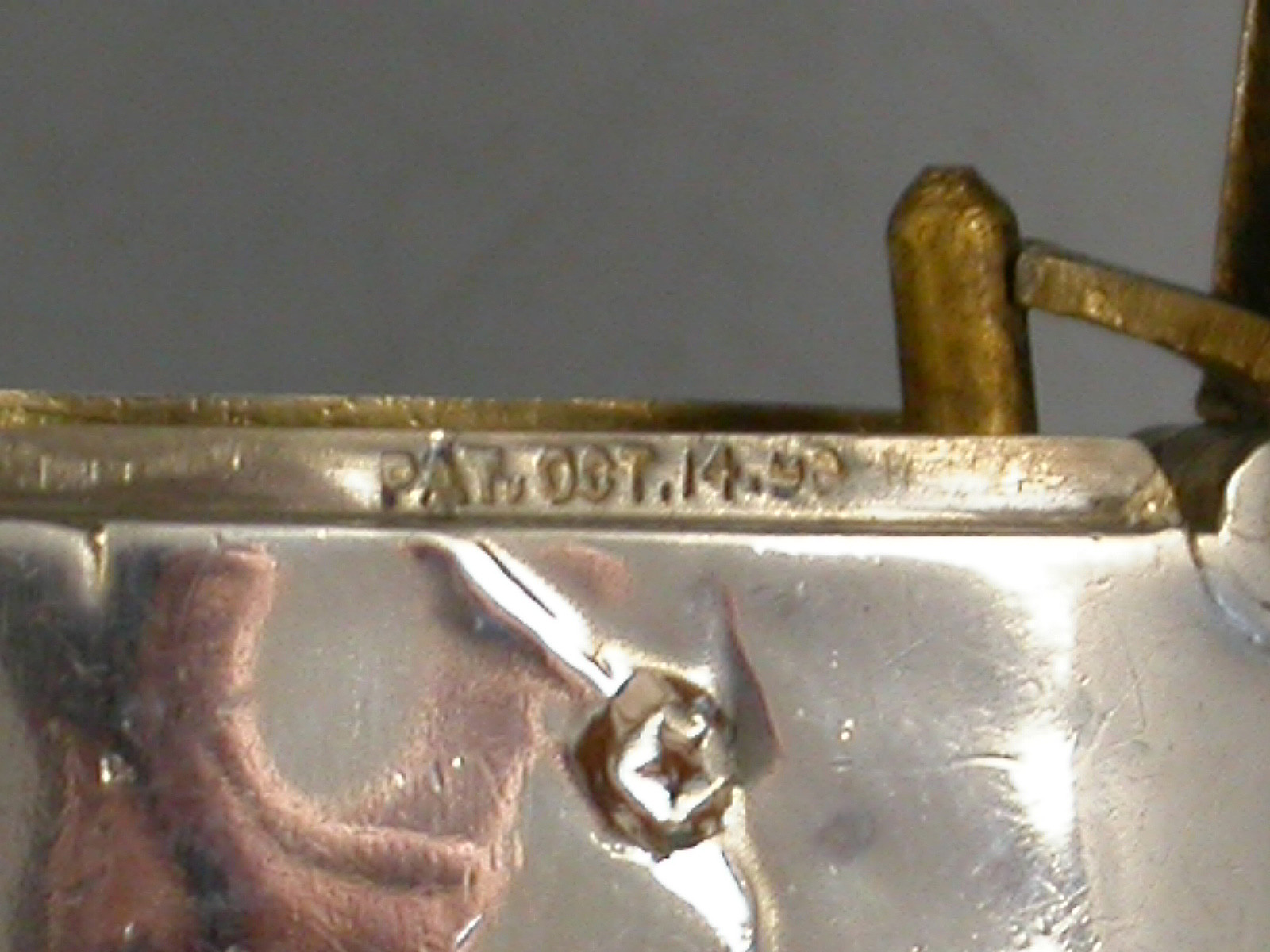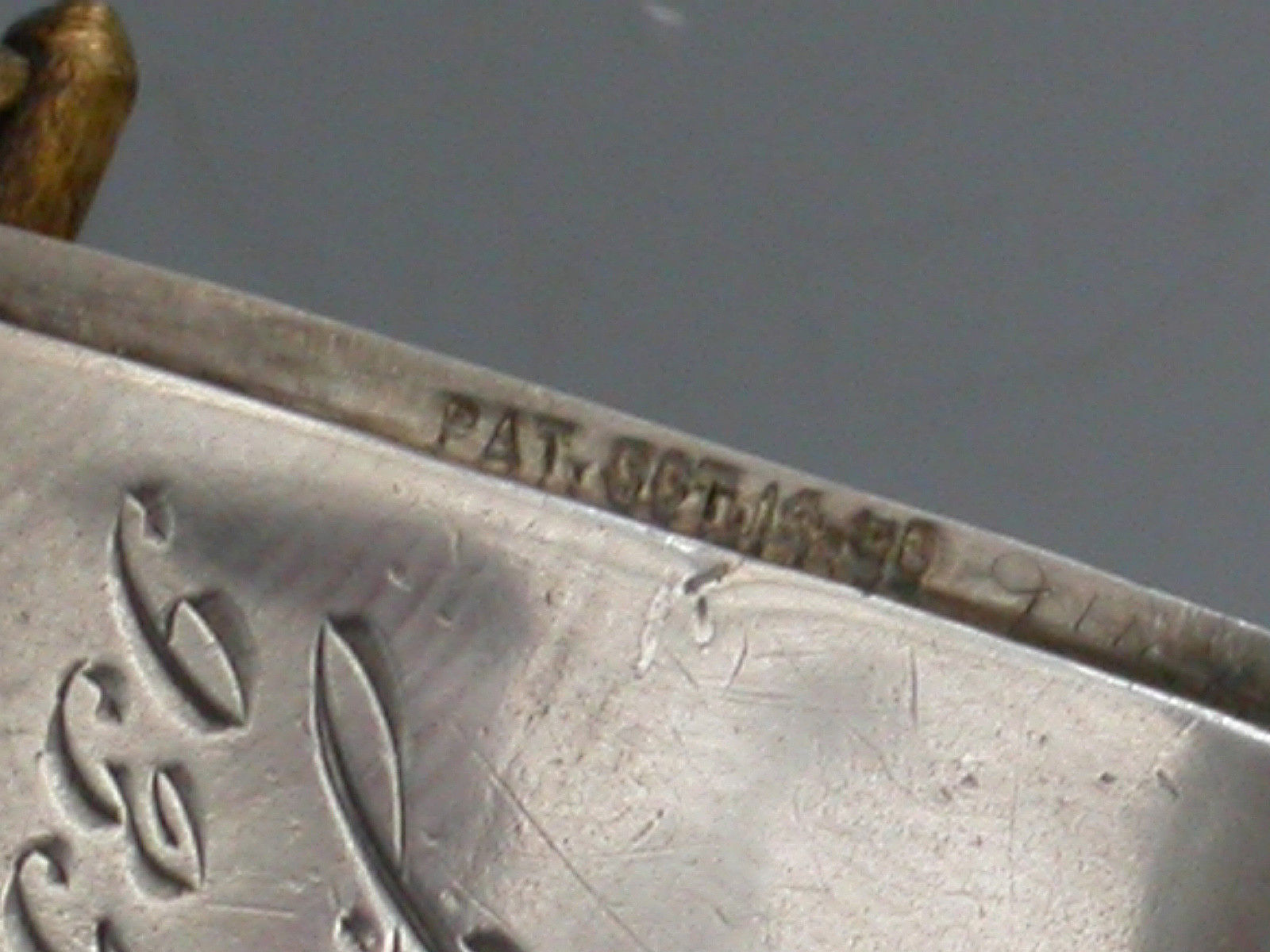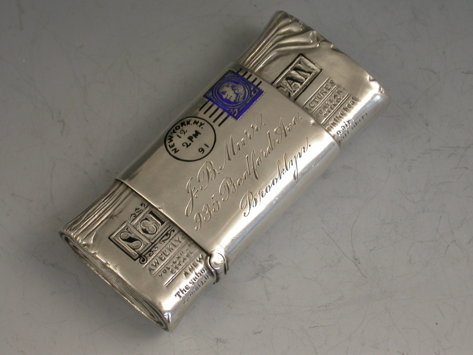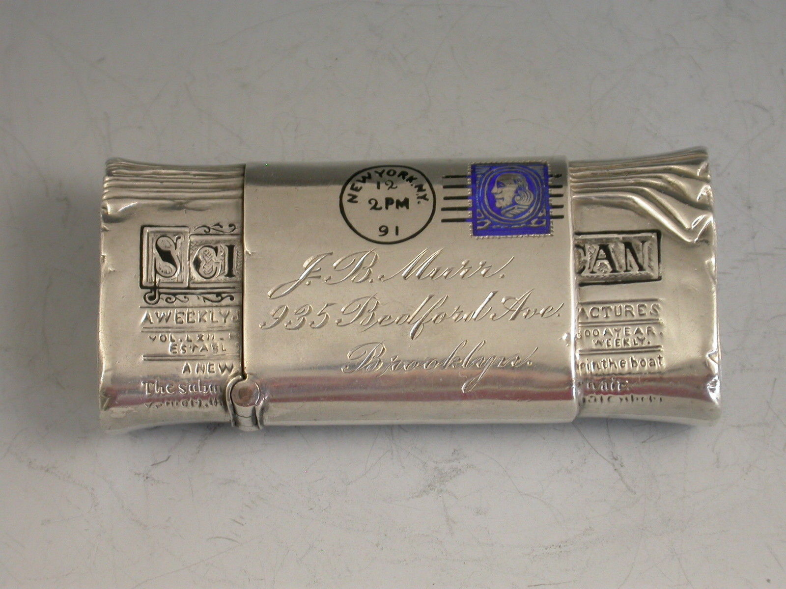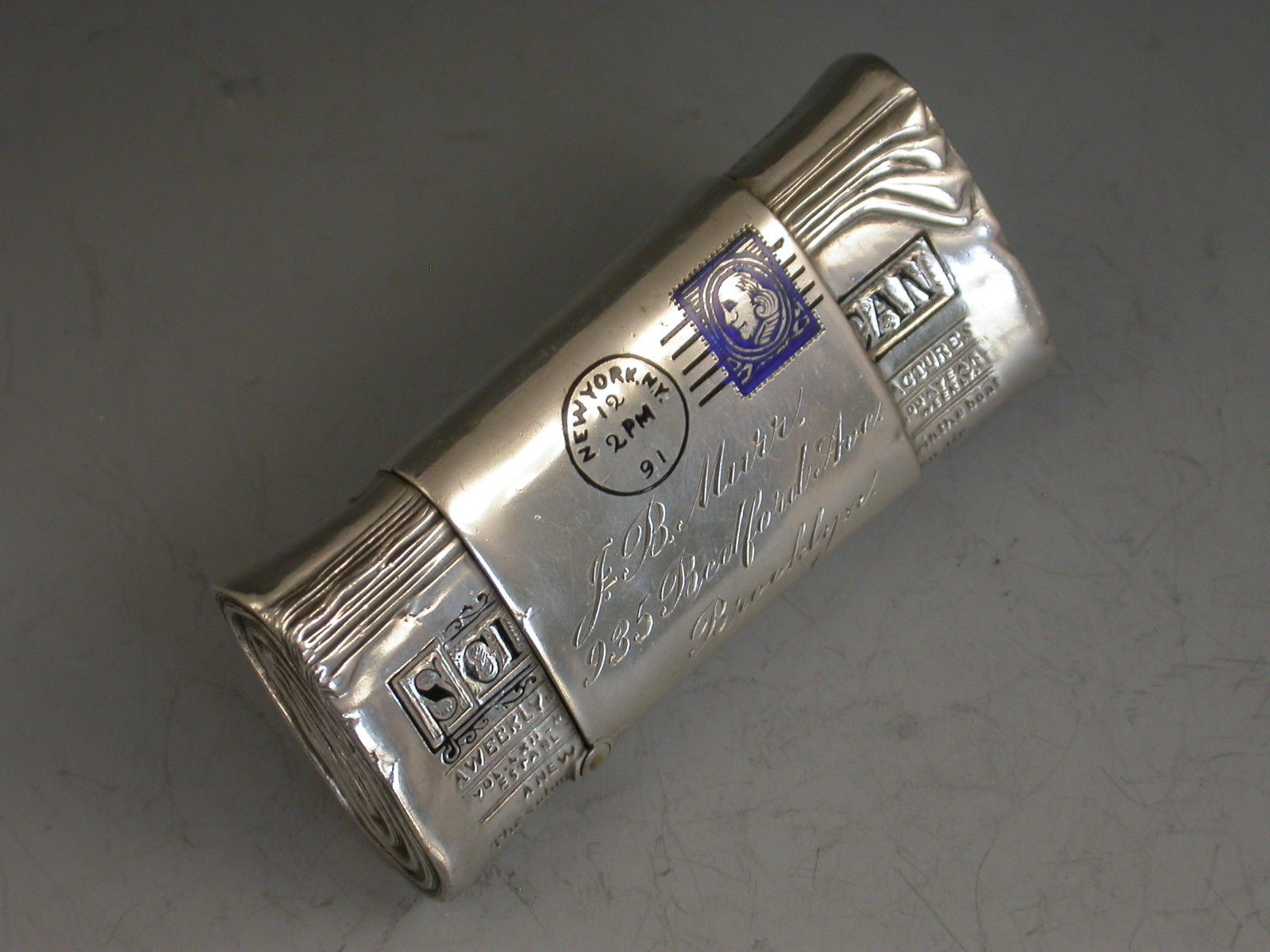 A fine and rare 19th century sterling silver and enamel Vesta Case made in the form of rolled up copy of the Scientific American Newspaper wrapped with an address label complete with enamel stamp and post mark. The reverse enamelled with three red dots to simulate sealing wax. The inner lip with patent registration date - October 14th 1890.