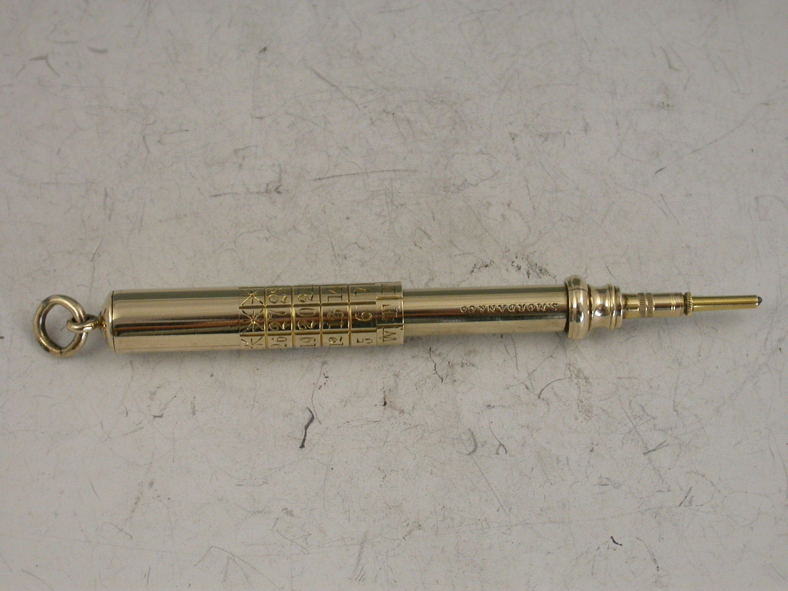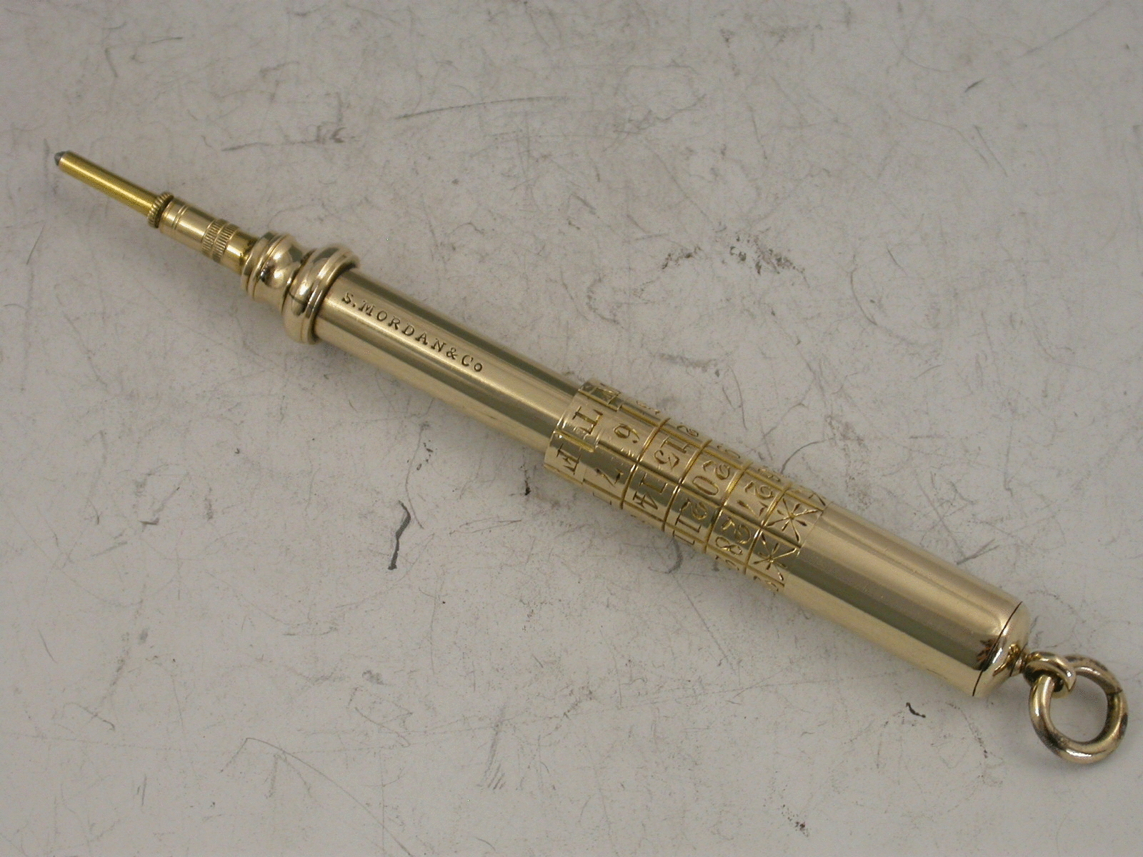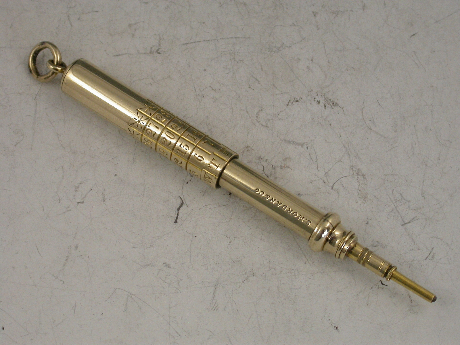 A good Victorian gold telescopic Pencil, the handle engraved with a perpetual calendar. The barrel stamped S Mordan & Co and with the distinctive 'Mordan Arrow' mark indicating 10 carat gold.