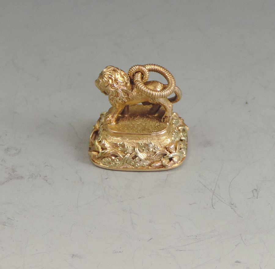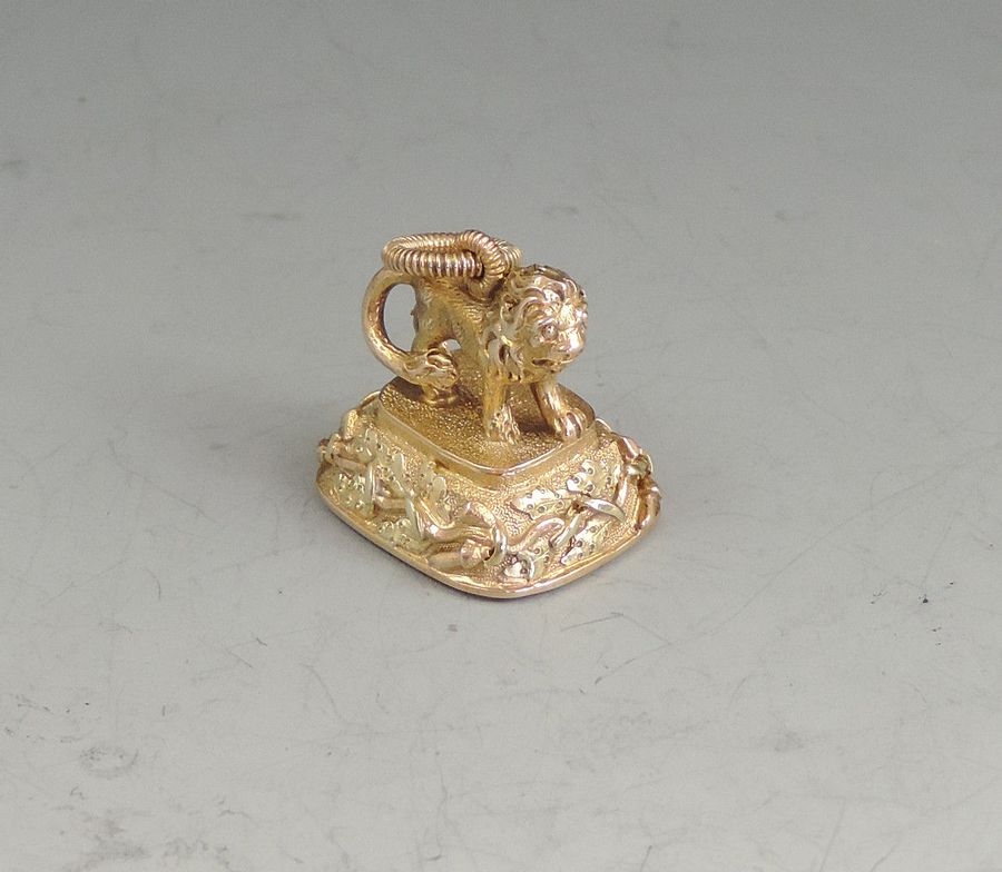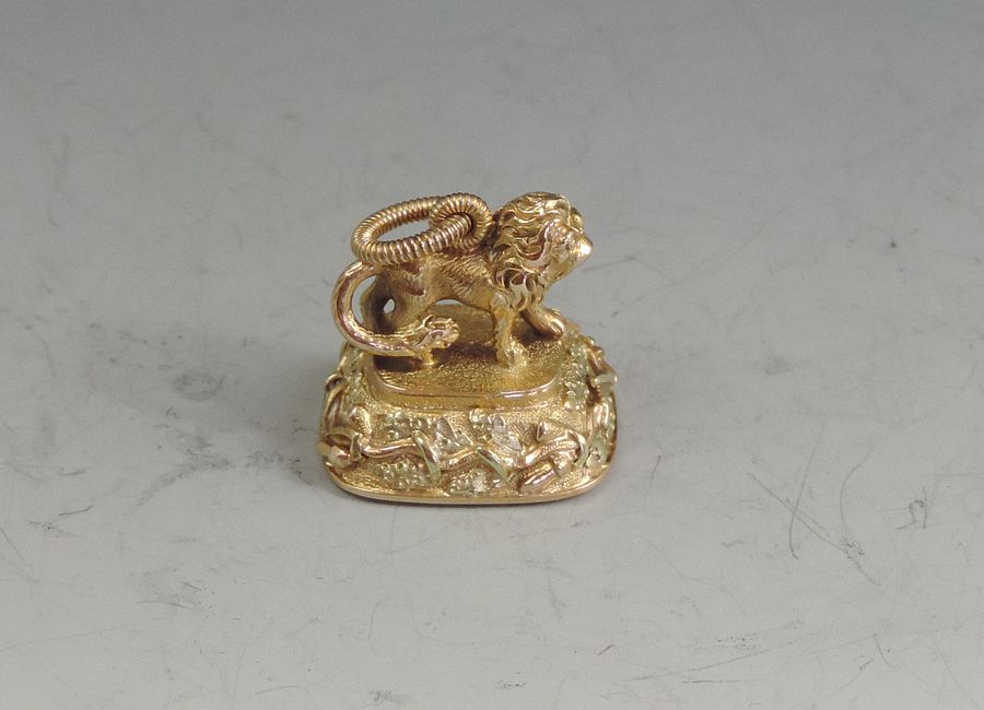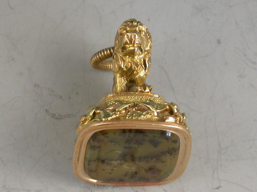 A good mid 19th century three colour gold Fob Seal of rectangular cushion form chased in high relief with a band of oak leaves and acorns and surmounted by a figure of a male lion, with attached suspension ring. The rectangular moss agate matrix engraved with the crest of a goat below the motto 'Cymru Dros Byth' (Wales Forever).