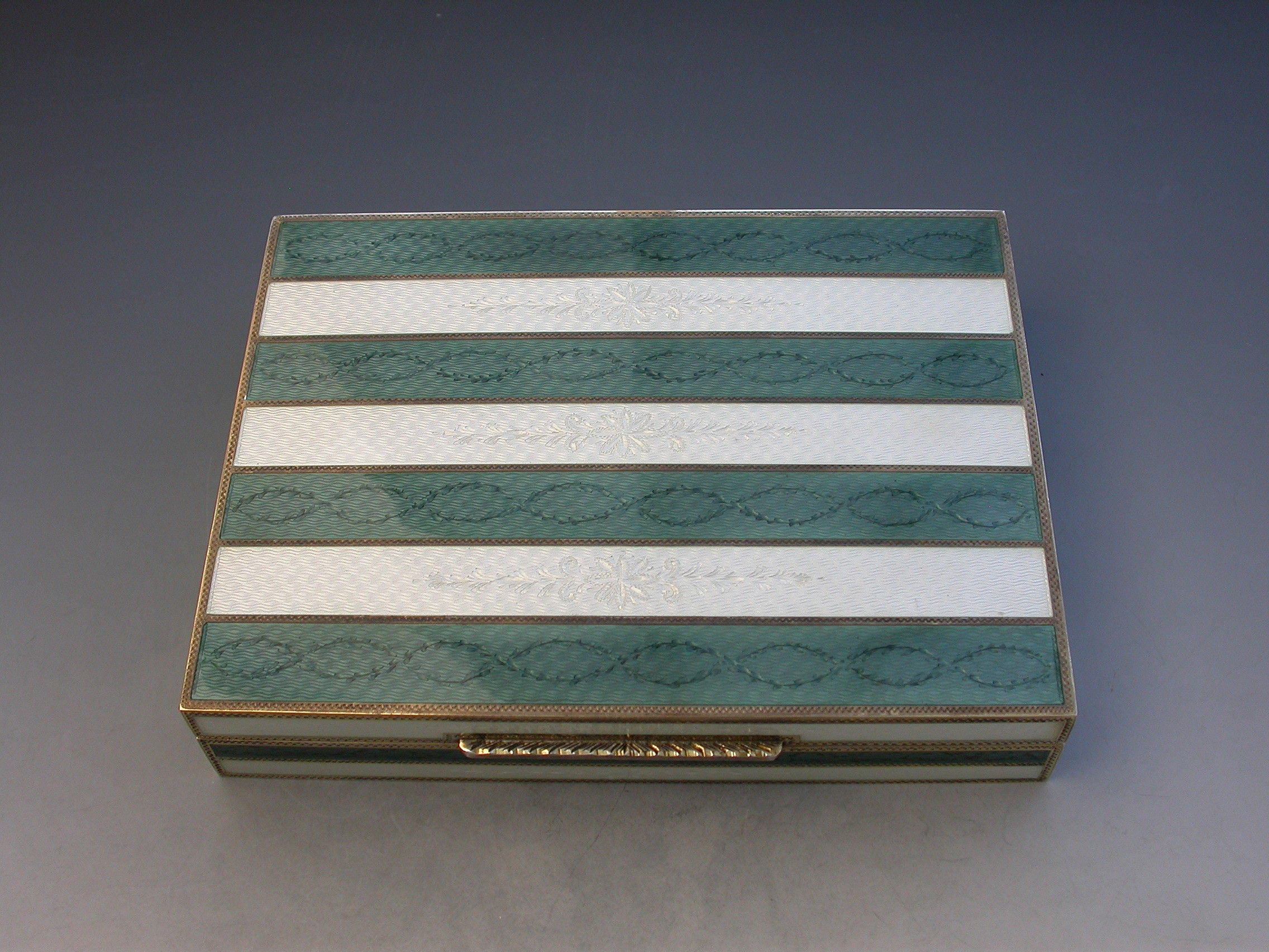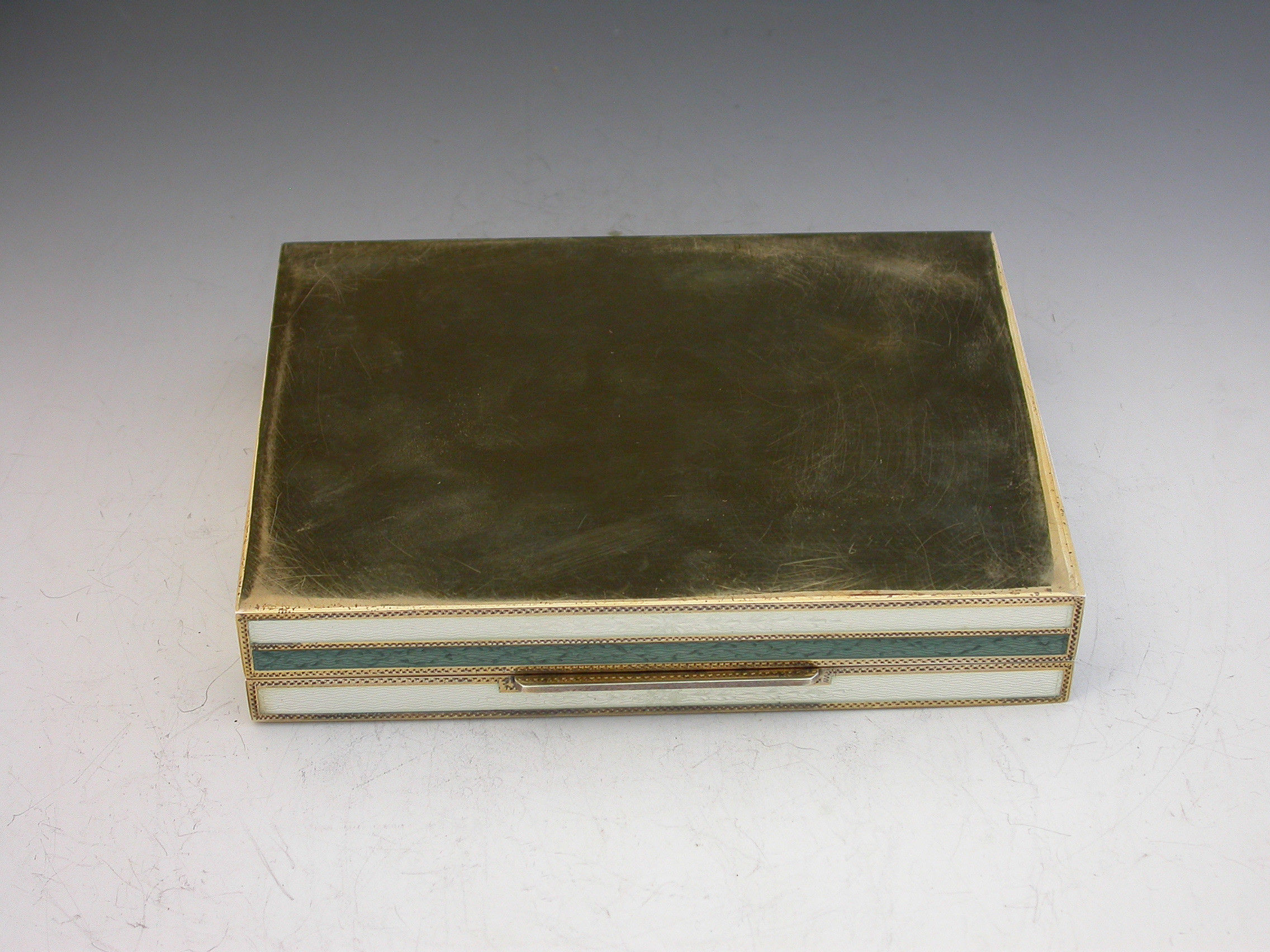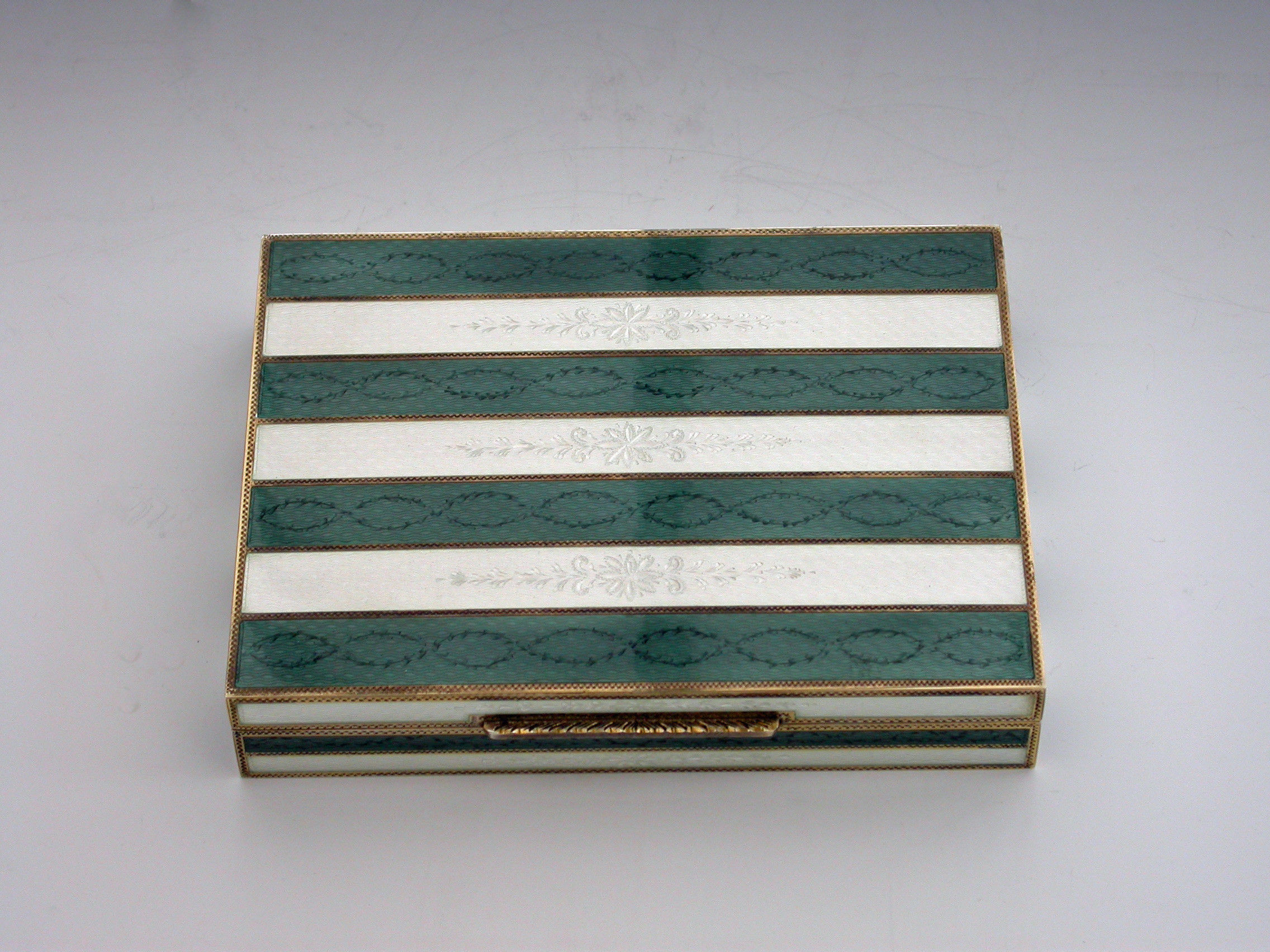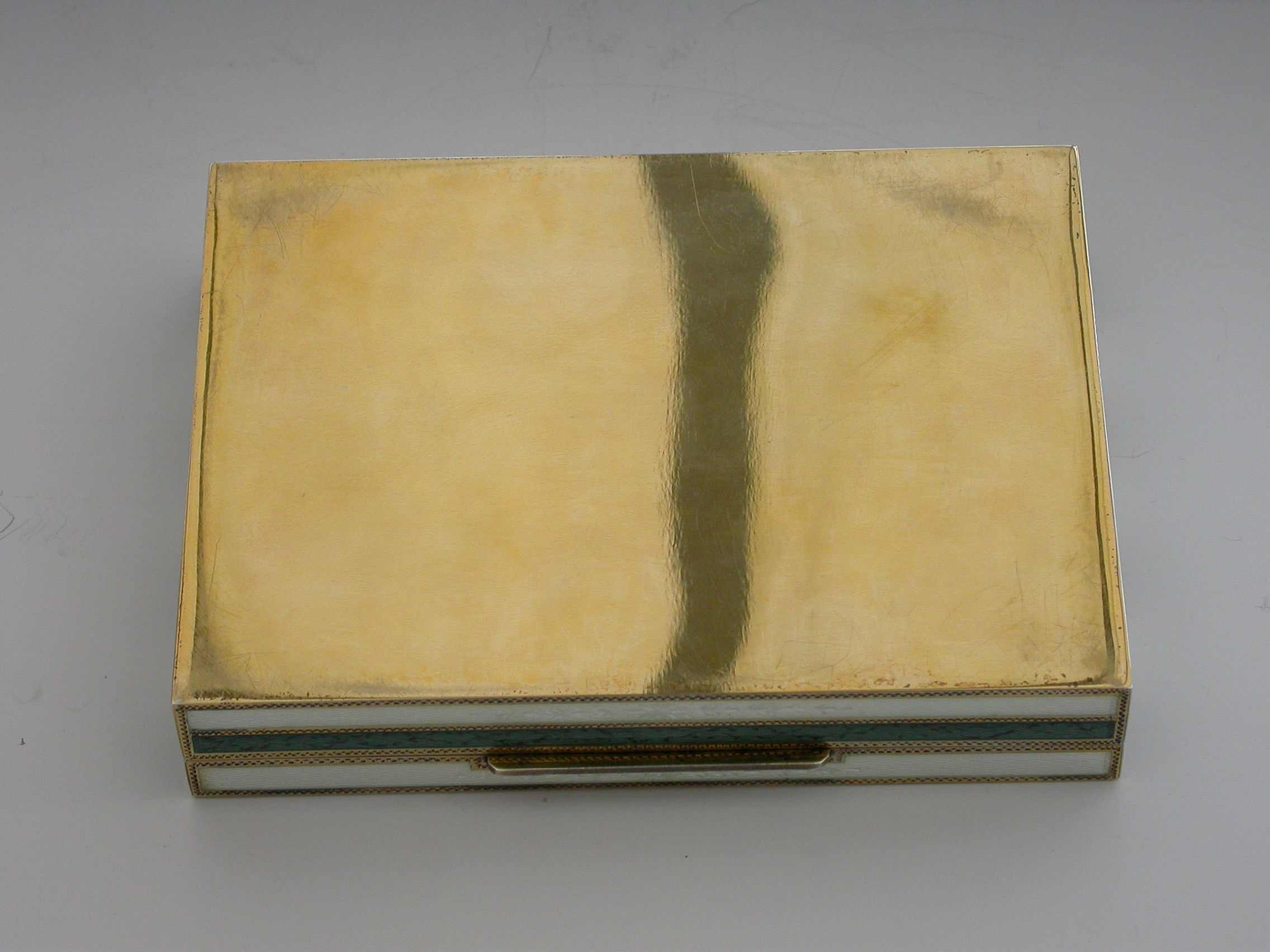An extremely heavy quality late 20th century silver gilt, sage green and pearl guilloche enamel Cigar Box with alternating bands of enamel decoration set between silver gilt borders, hinged lid and silver gilt interior.