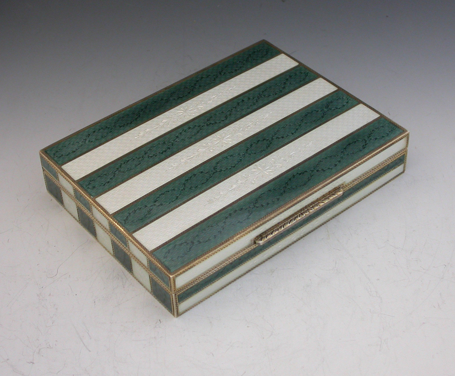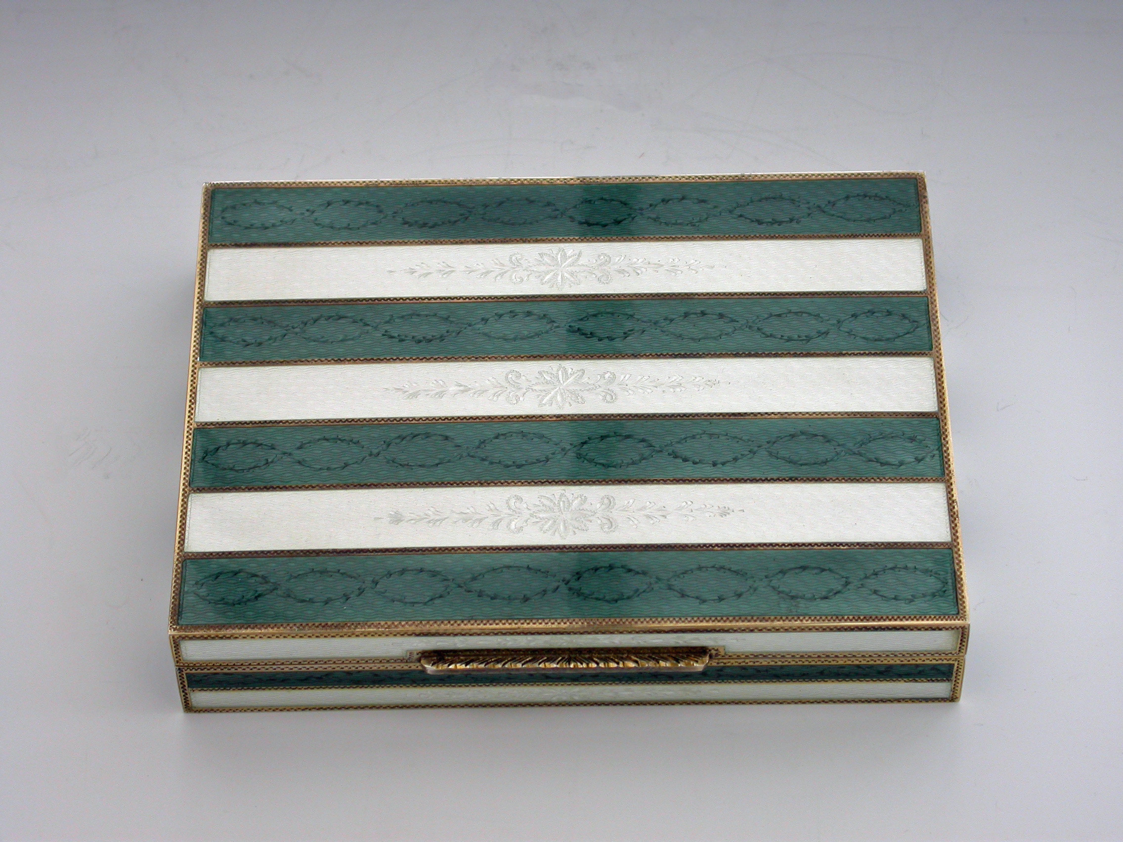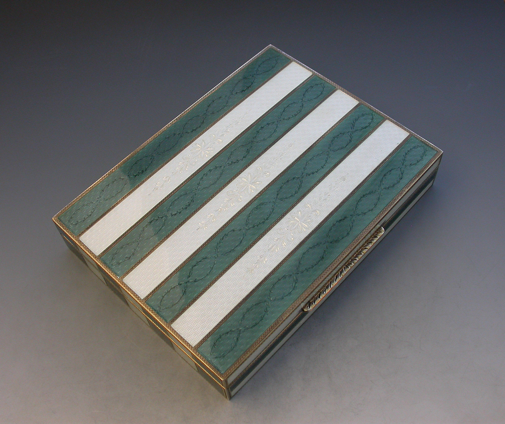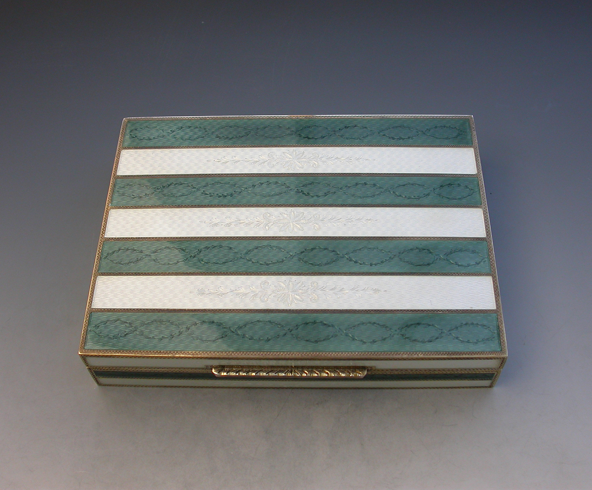 An extremely heavy quality late 20th century silver gilt, sage green and pearl guilloche enamel Cigar Box with alternating bands of enamel decoration set between silver gilt borders, hinged lid and silver gilt interior.
