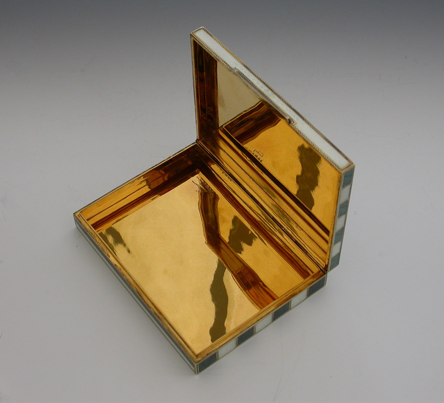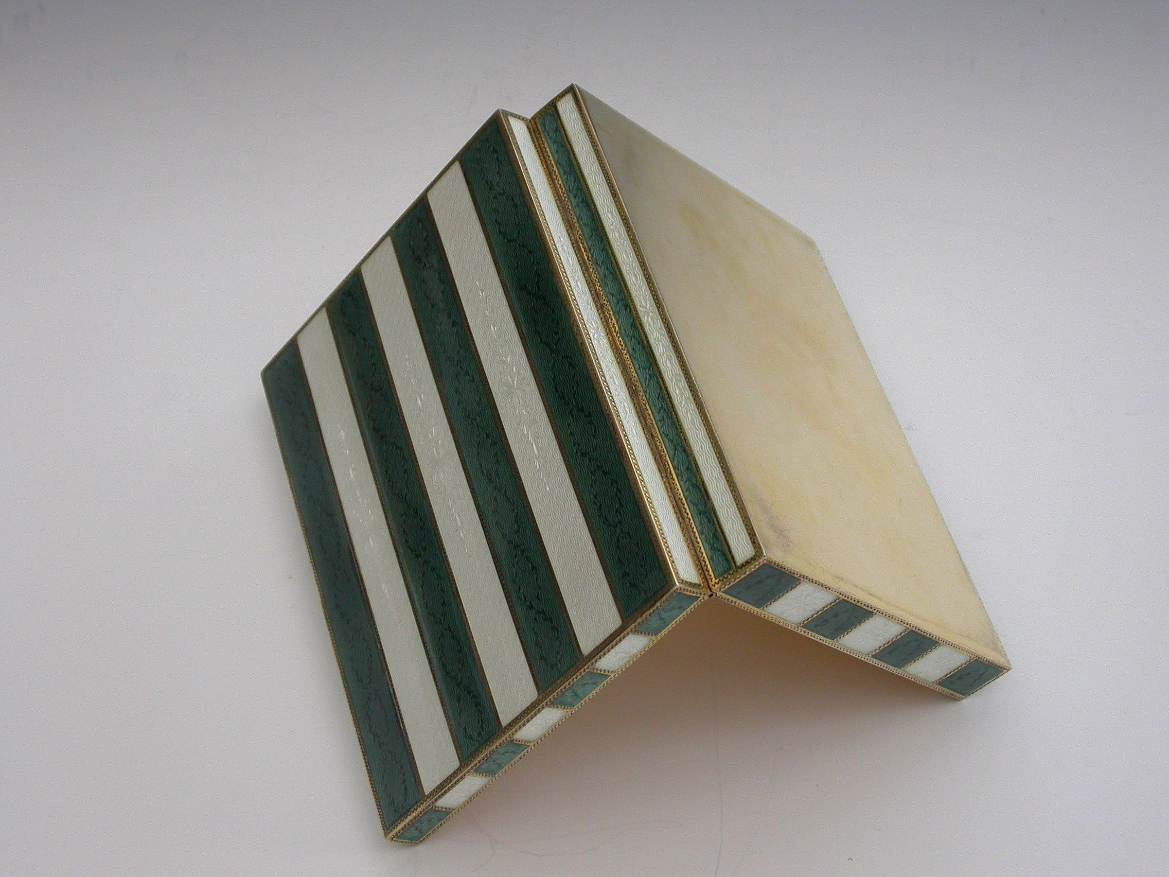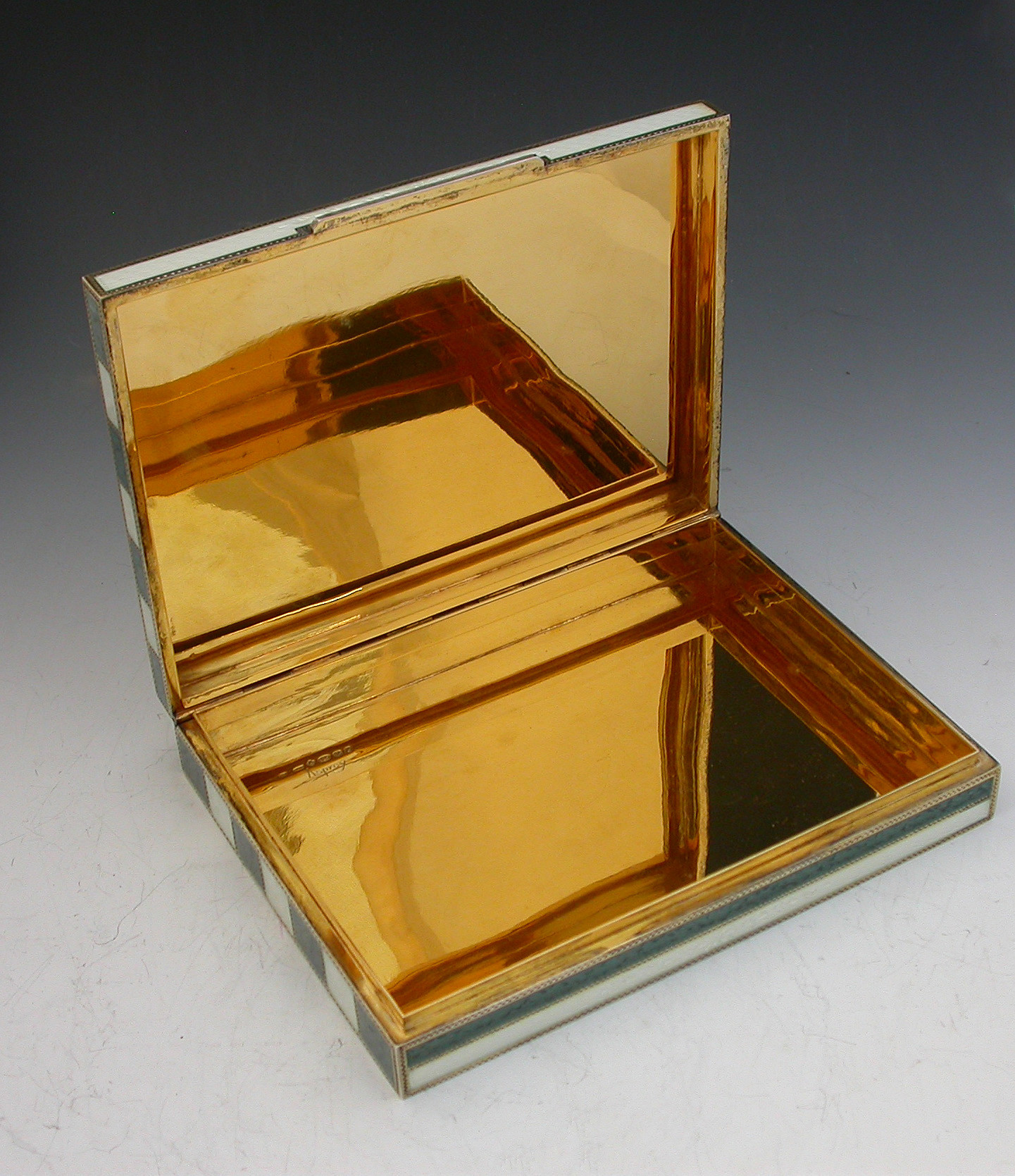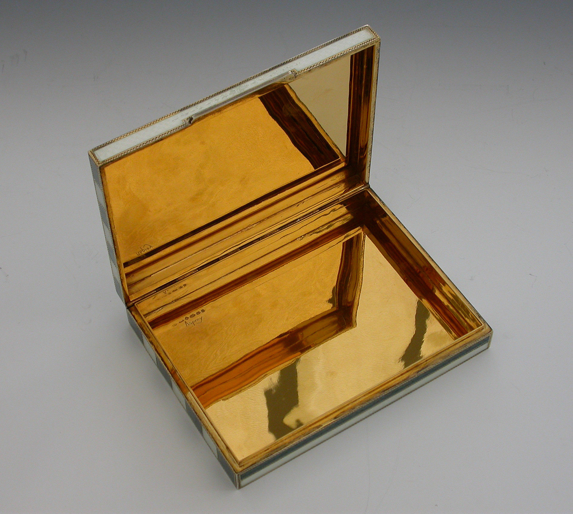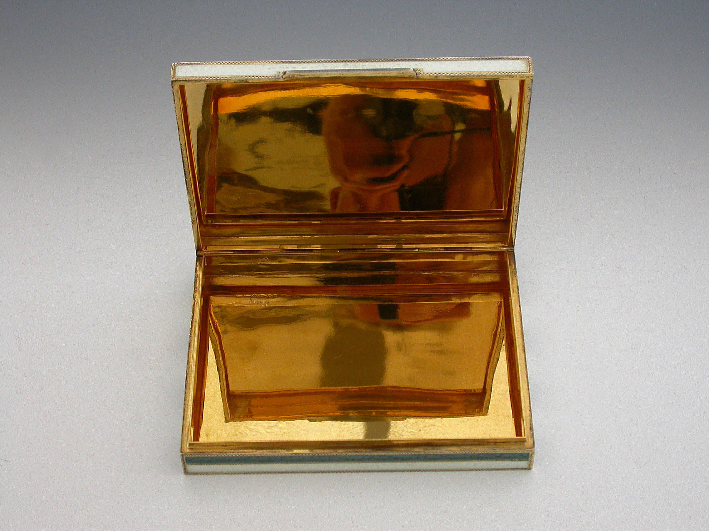 An extremely heavy quality late 20th century silver gilt, sage green and pearl guilloche enamel Cigar Box with alternating bands of enamel decoration set between silver gilt borders, hinged lid and silver gilt interior.