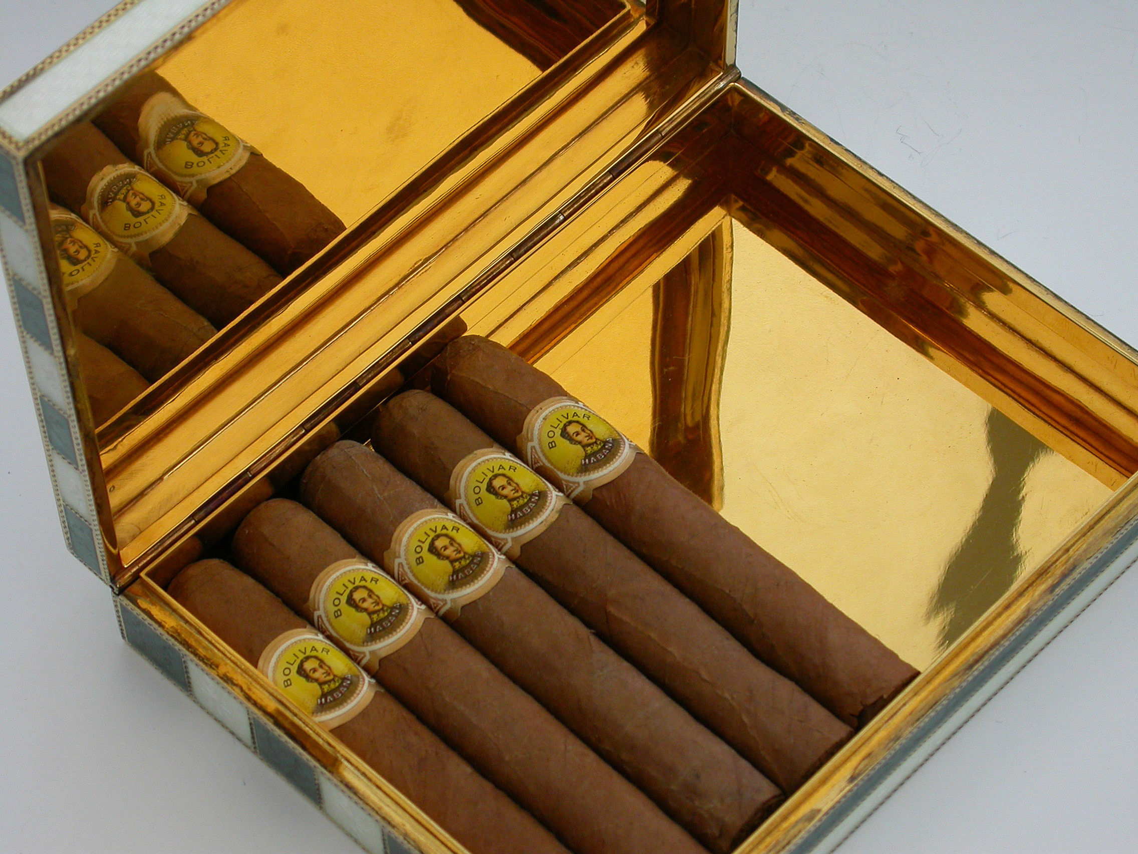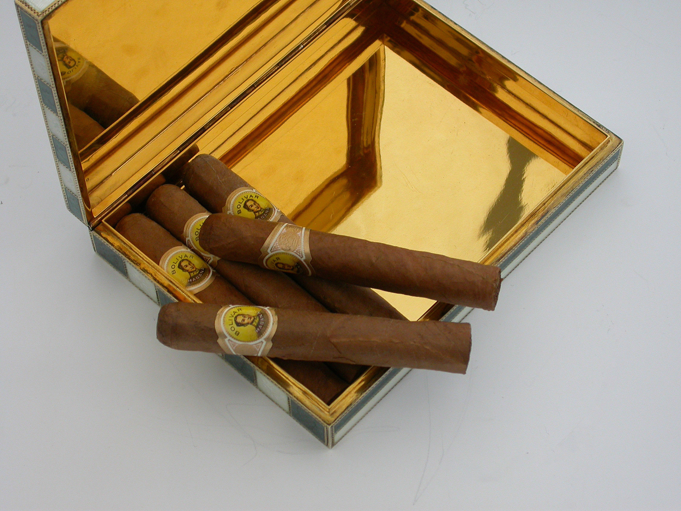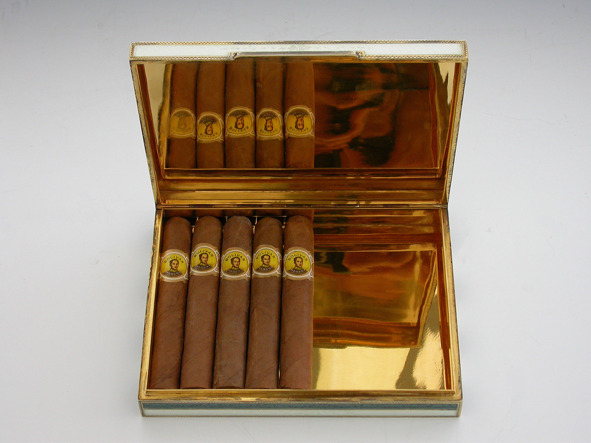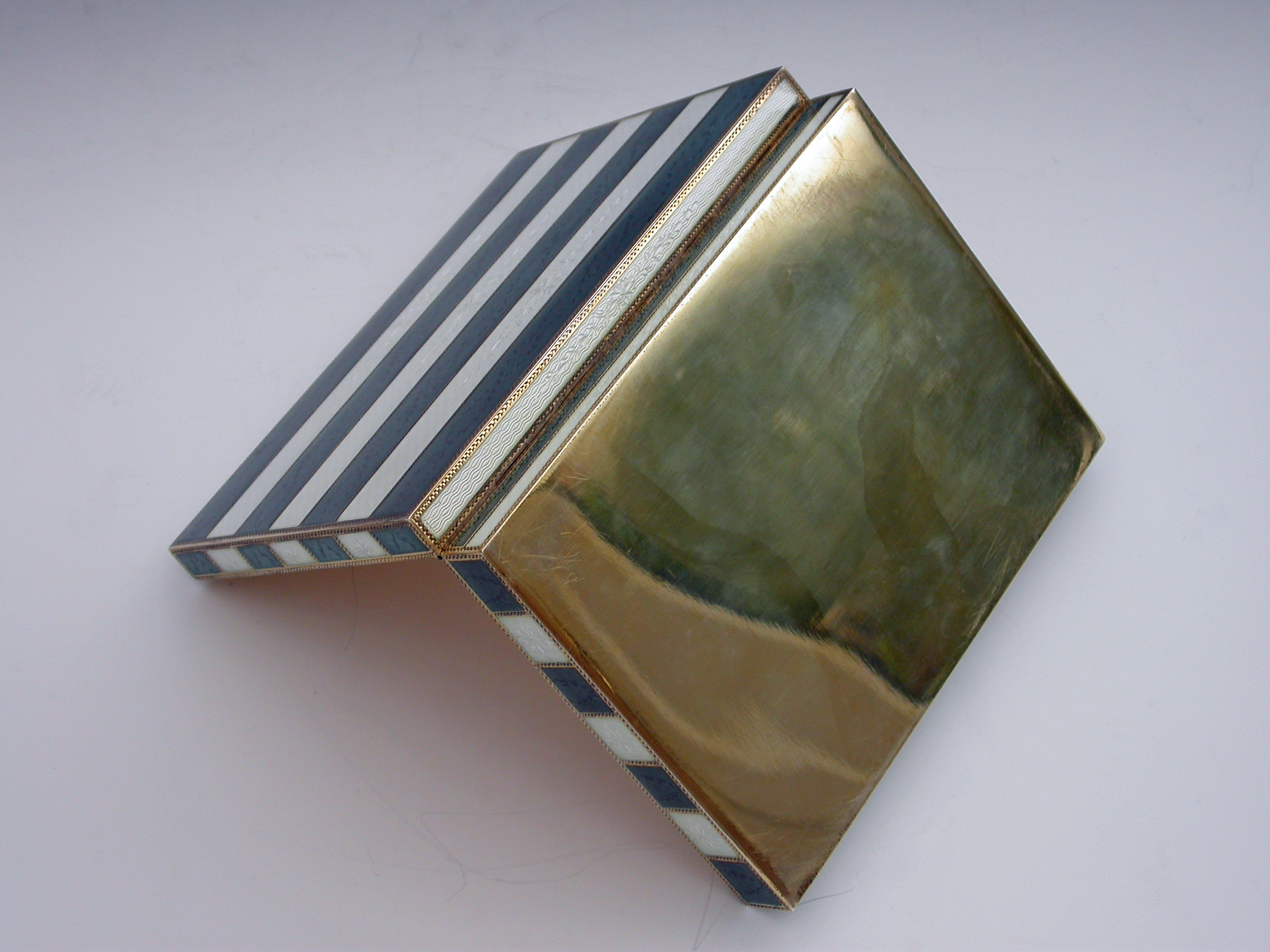 An extremely heavy quality late 20th century silver gilt, sage green and pearl guilloche enamel Cigar Box with alternating bands of enamel decoration set between silver gilt borders, hinged lid and silver gilt interior.