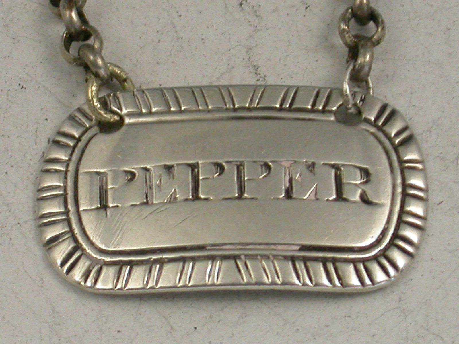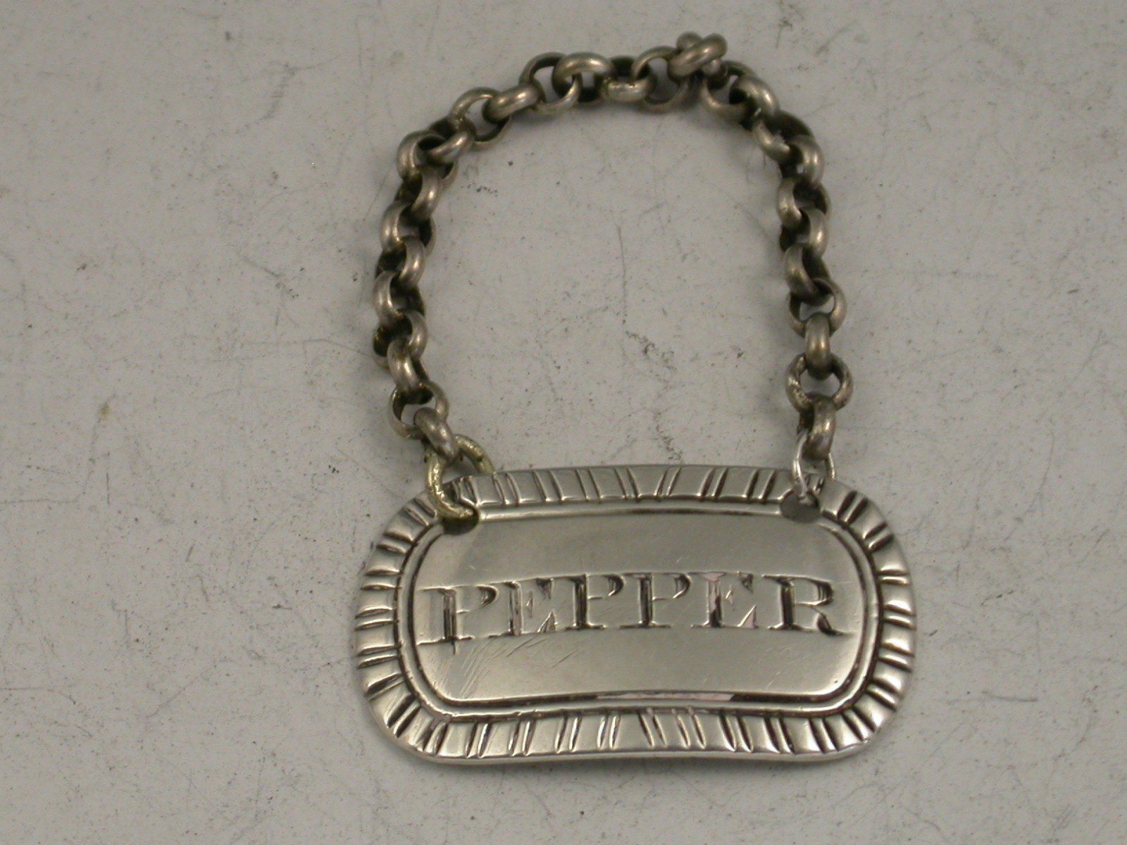 A rare George IV silver Sauce Label of rounded rectangular form with gadrooned border, incised for Pepper (a rare title).