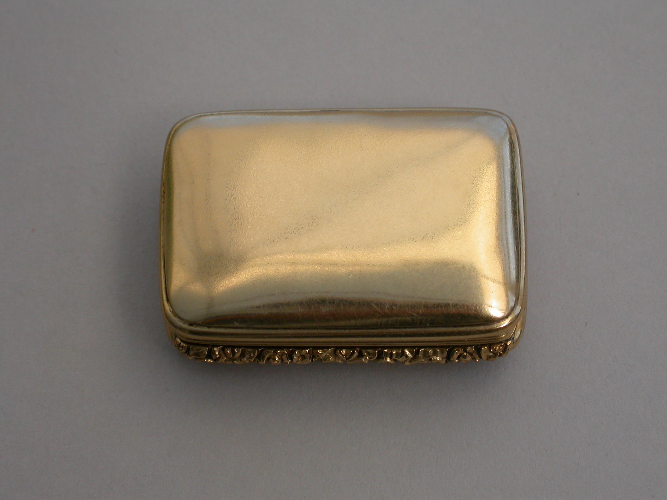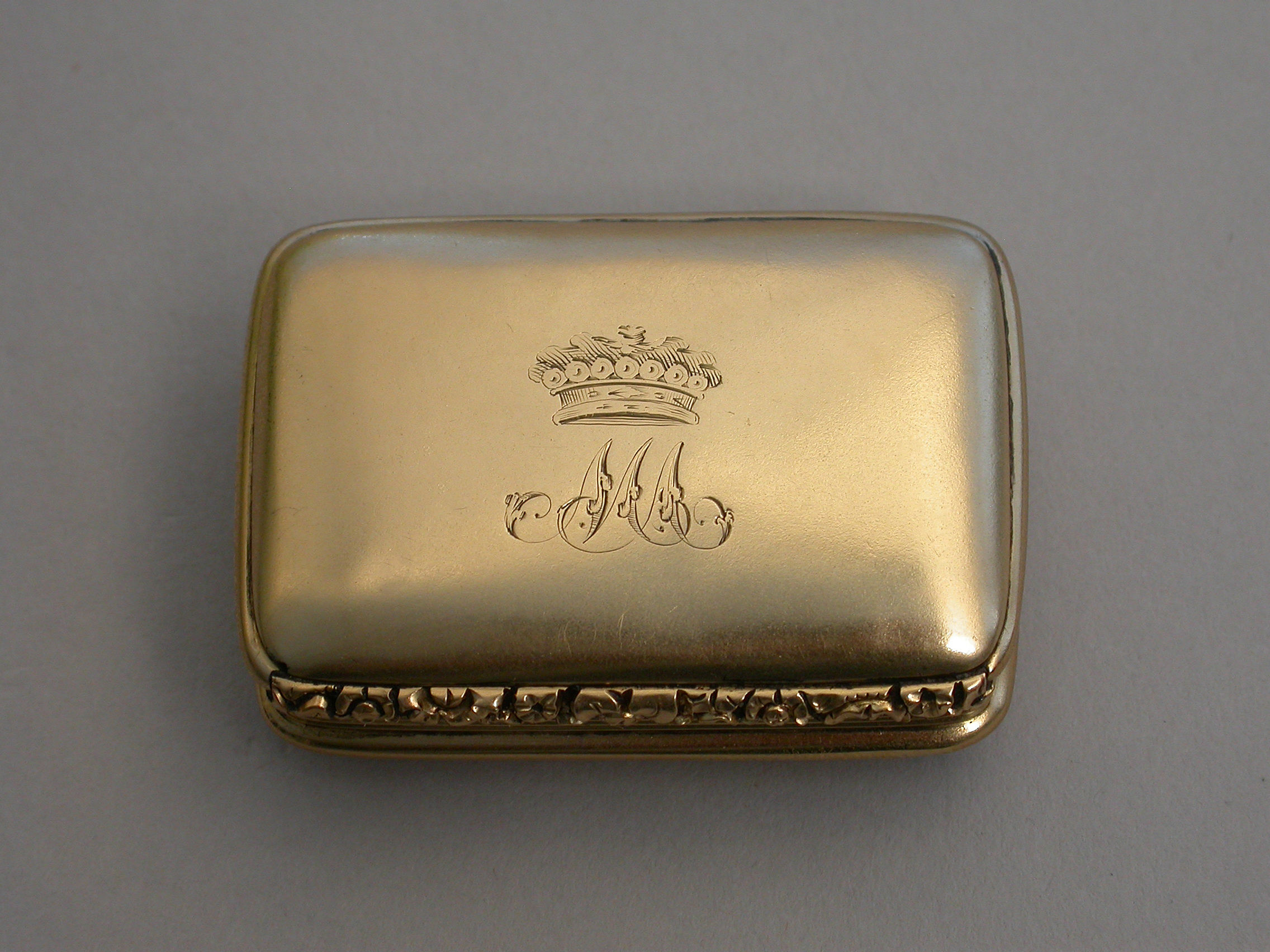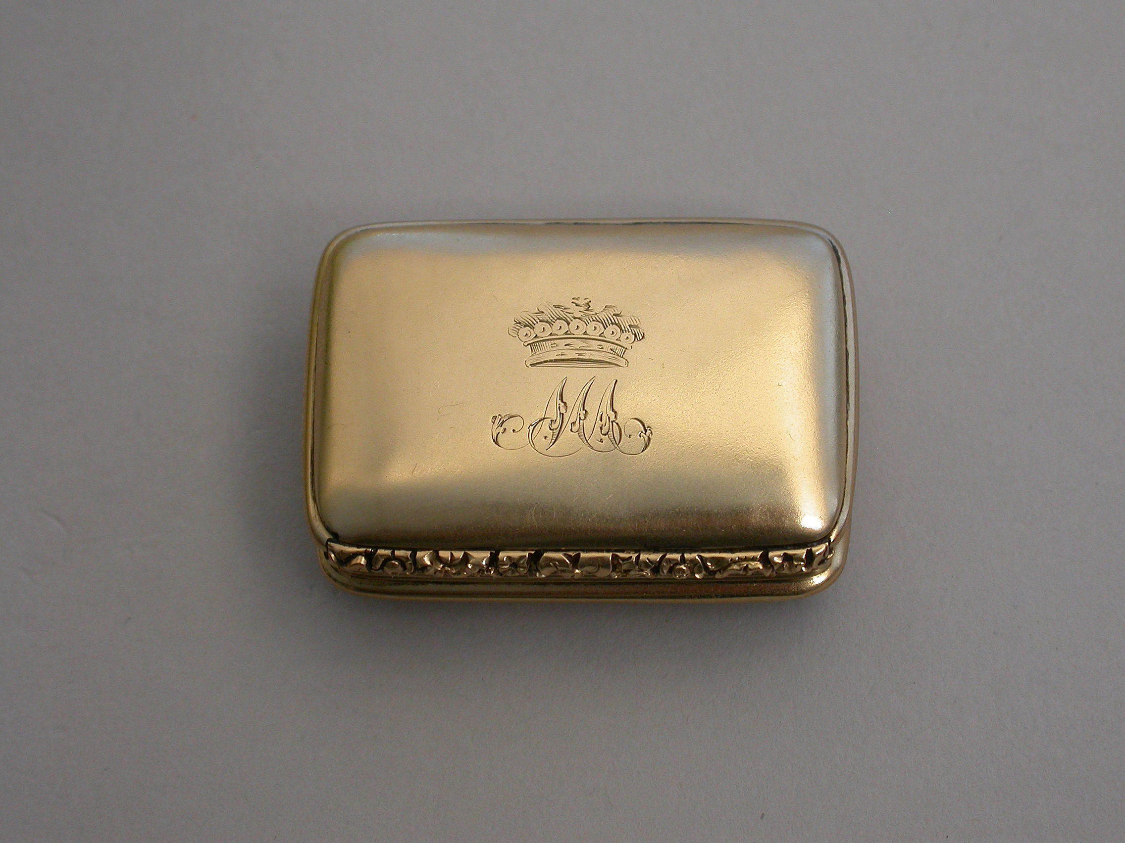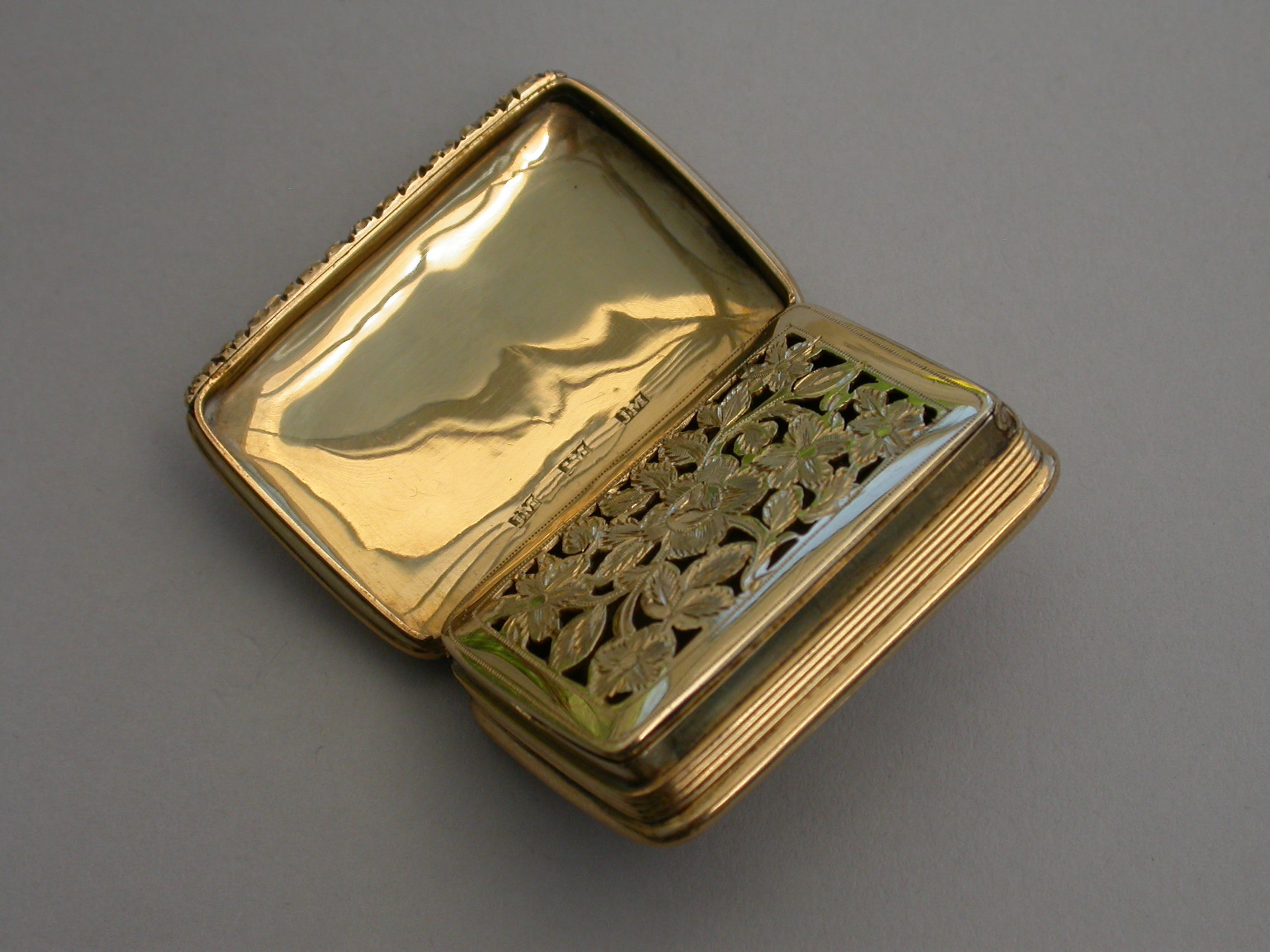 A rare George IV / William IV Scottish Provincial Gold Vinaigrette of rounded oblong form with reeded sides & a chased floral thumb piece, plain domed base & cover, initialled ""MA"" below a coronet*, the grille pierced & engraved with a rose flower.