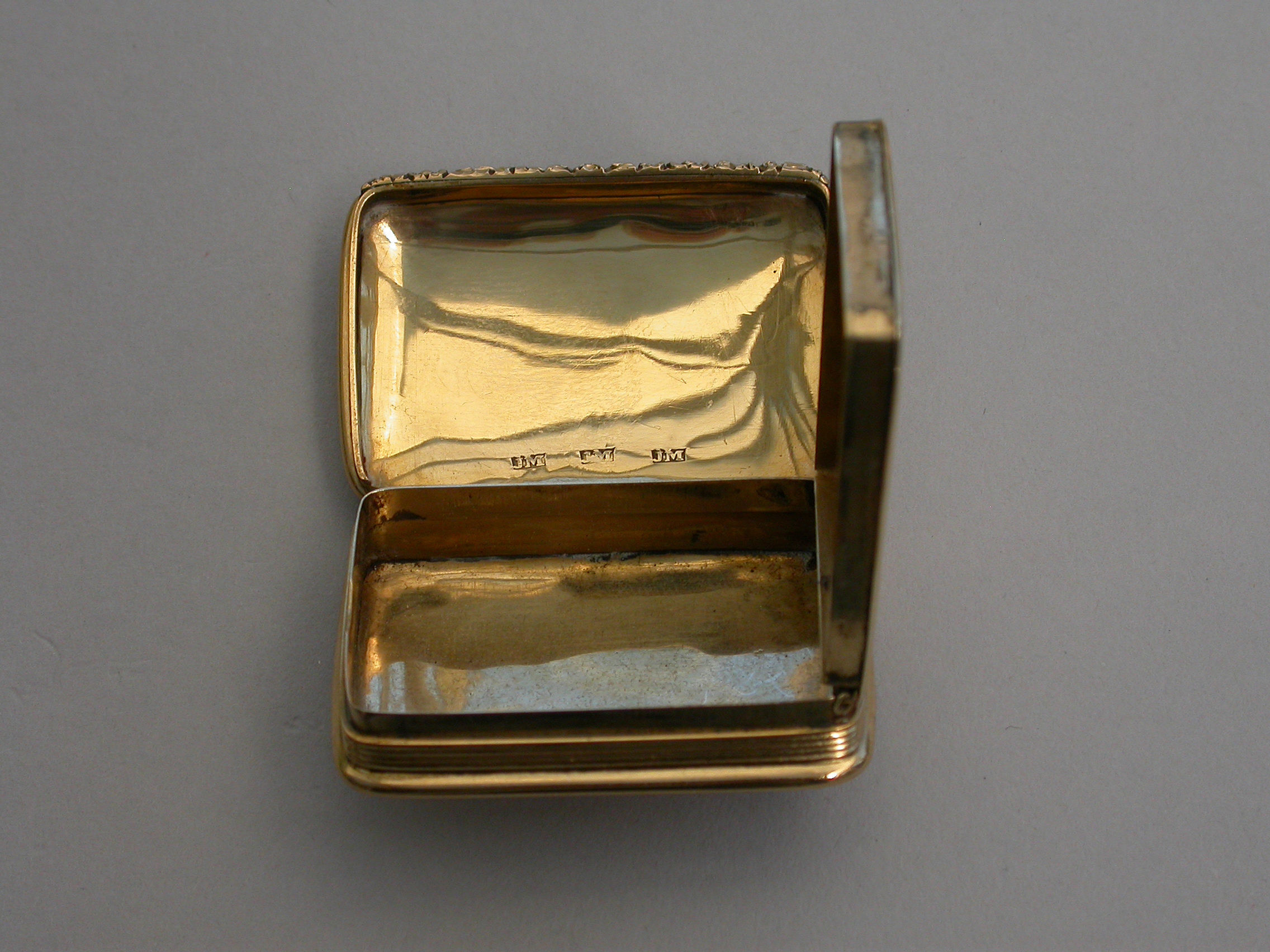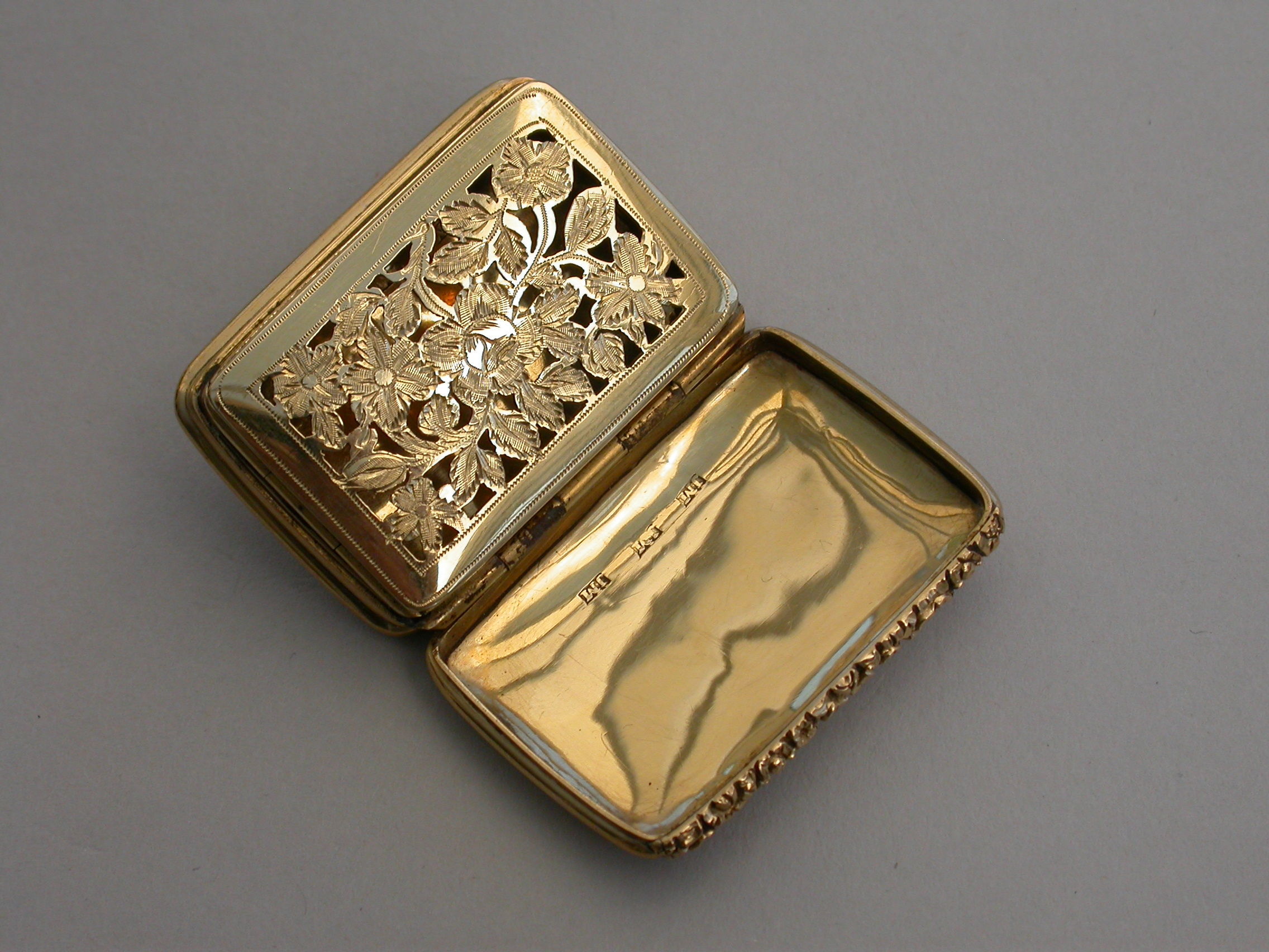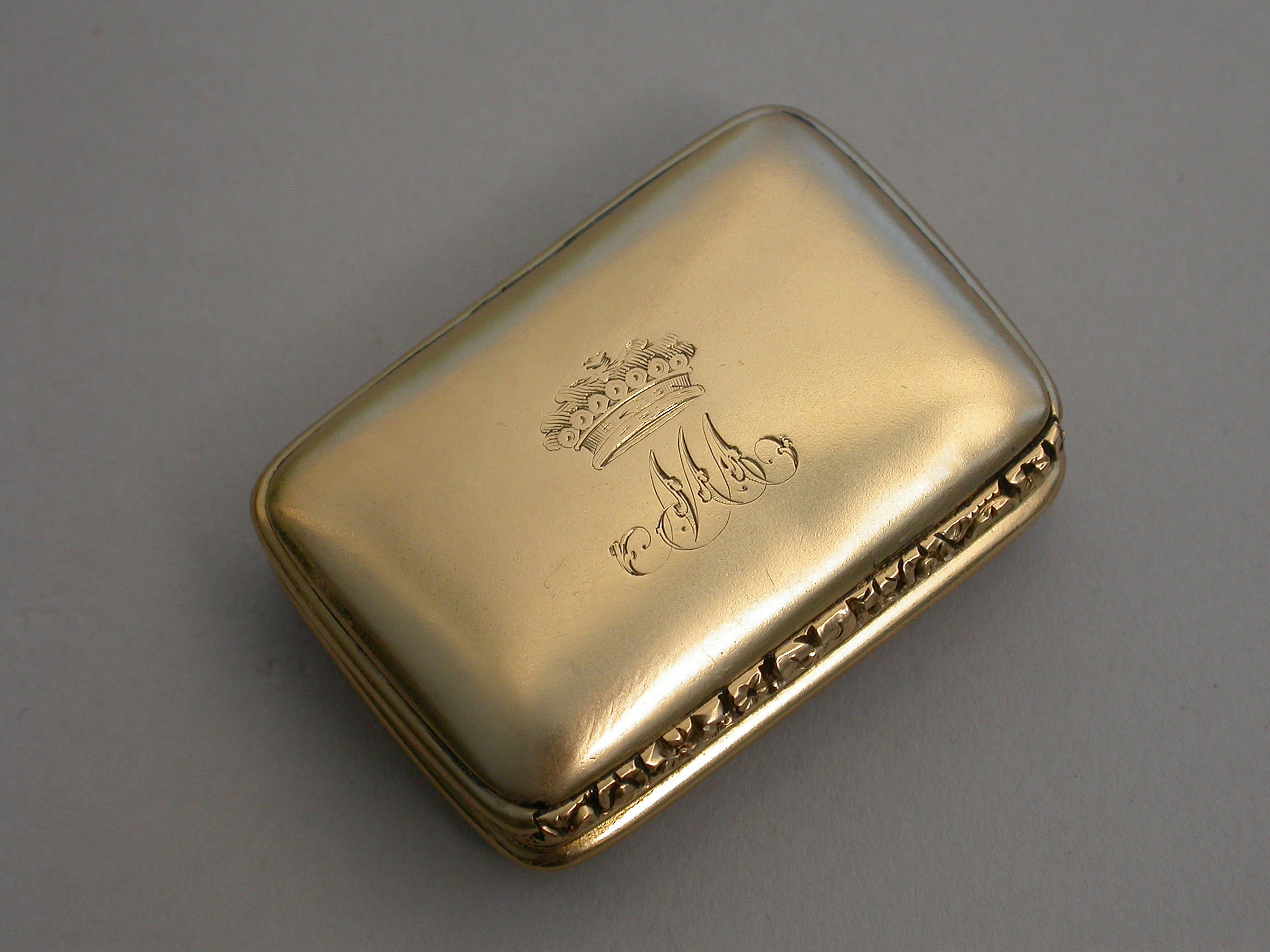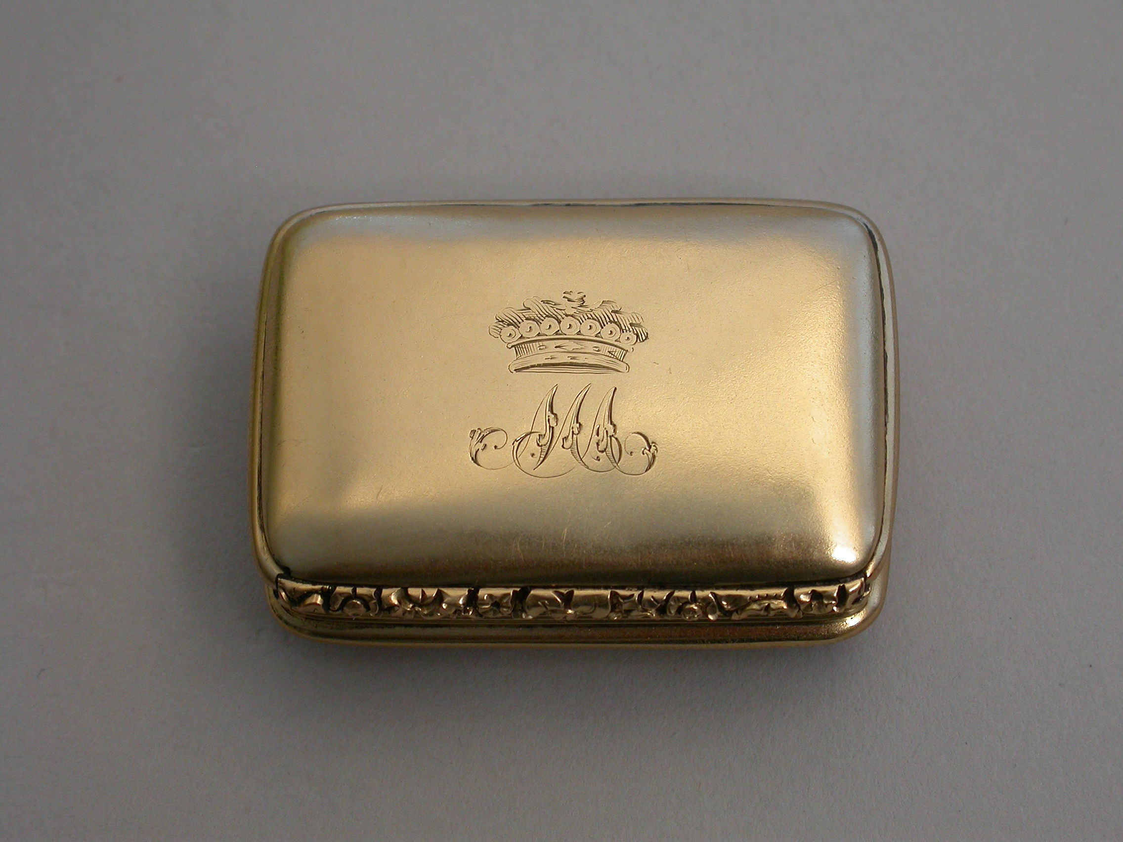 A rare George IV / William IV Scottish Provincial Gold Vinaigrette of rounded oblong form with reeded sides & a chased floral thumb piece, plain domed base & cover, initialled ""MA"" below a coronet*, the grille pierced & engraved with a rose flower.