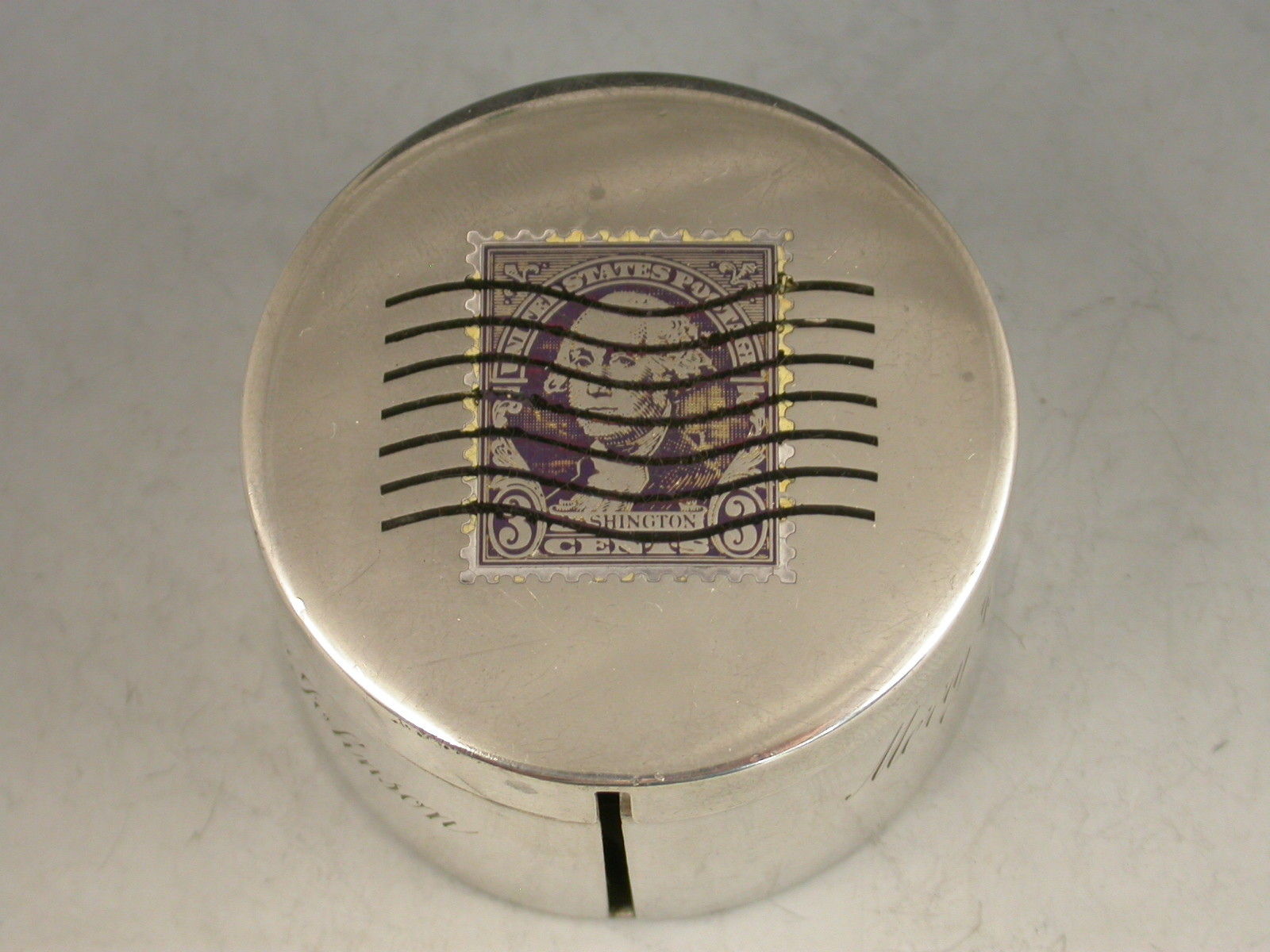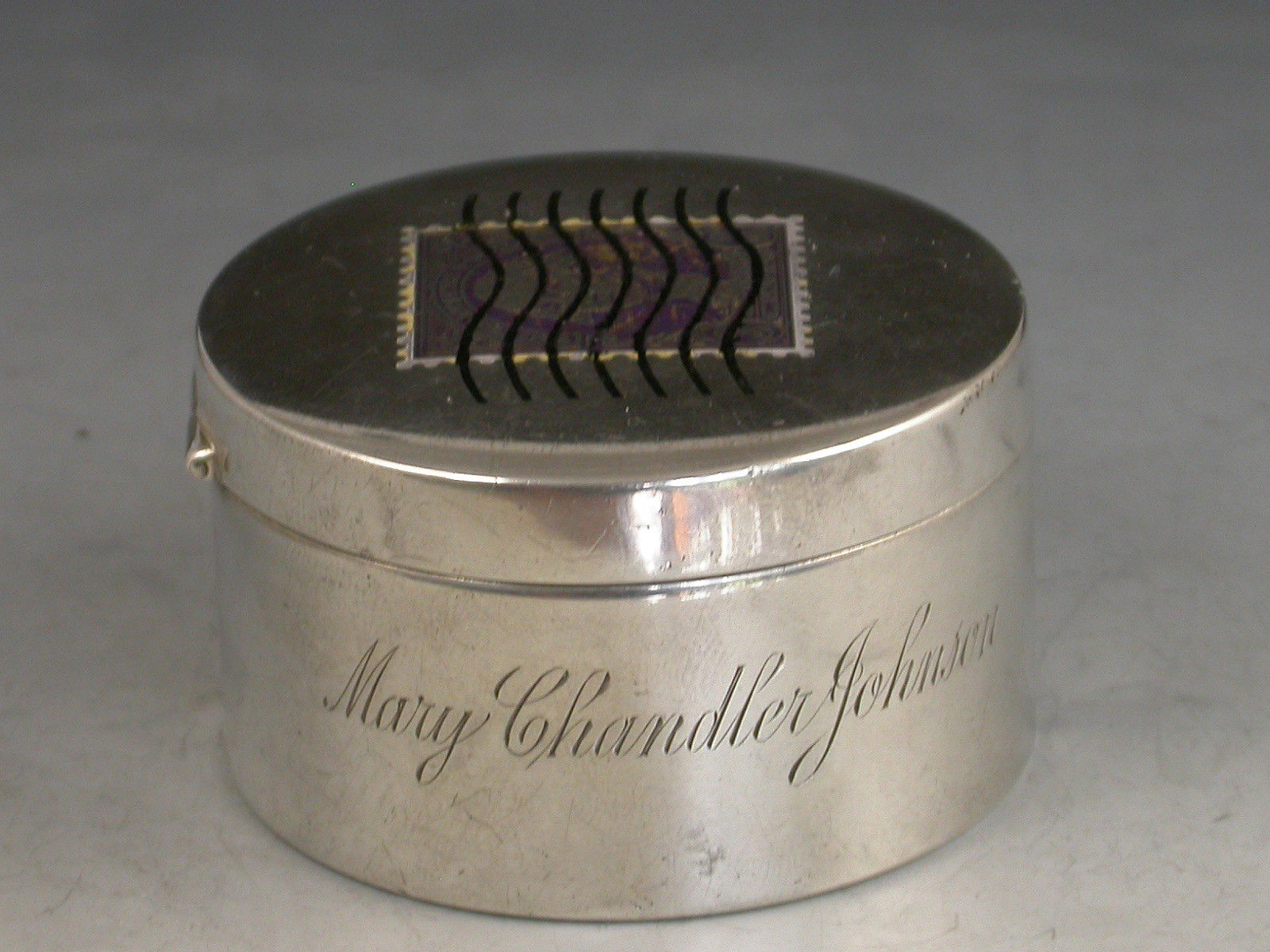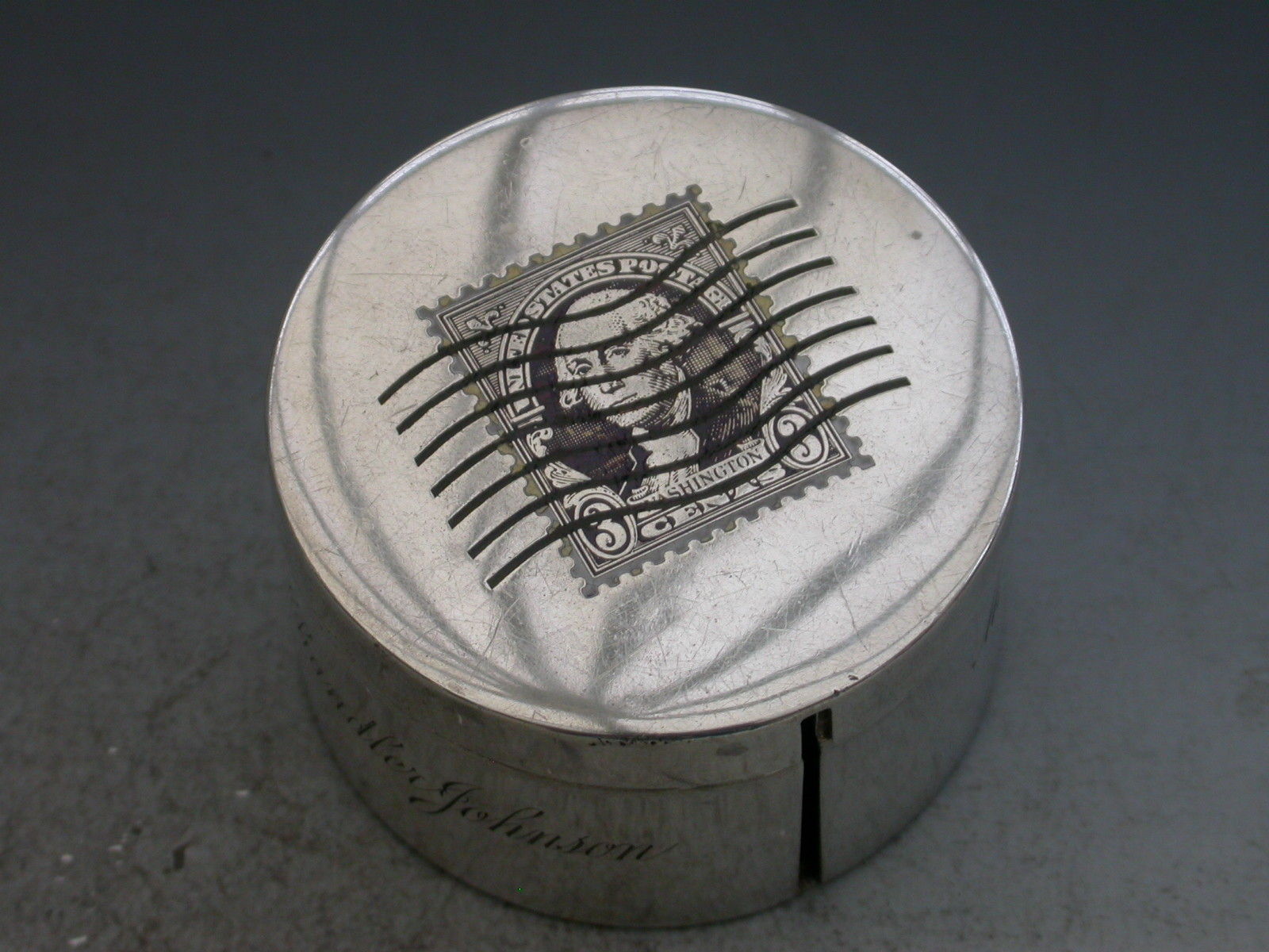 A good early 20th century American sterling silver Stamp Box of circular form with hinged lid set with enamelled 3 cent lilac stamp depicting George Washington, complete with central spindle to hold a roll of stamps dispensed through a slot in the side of the box.