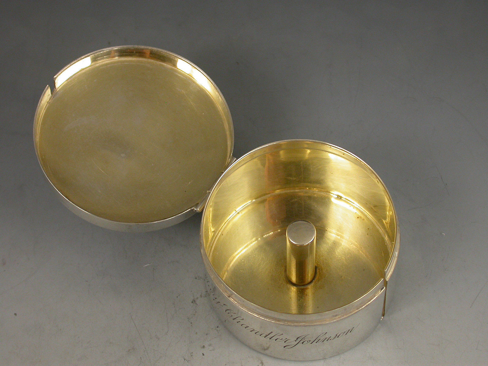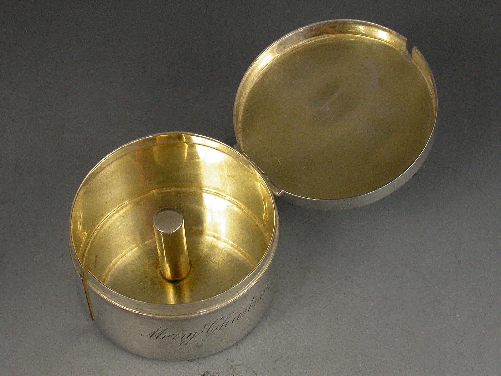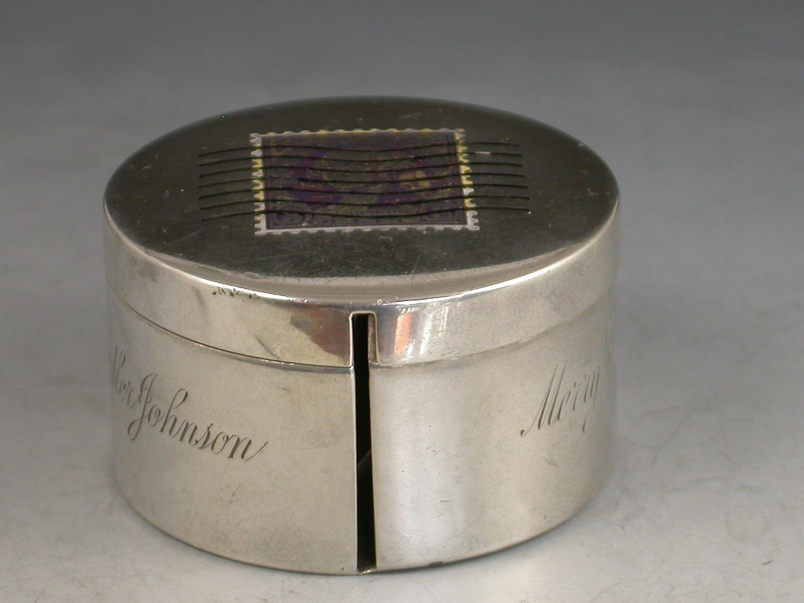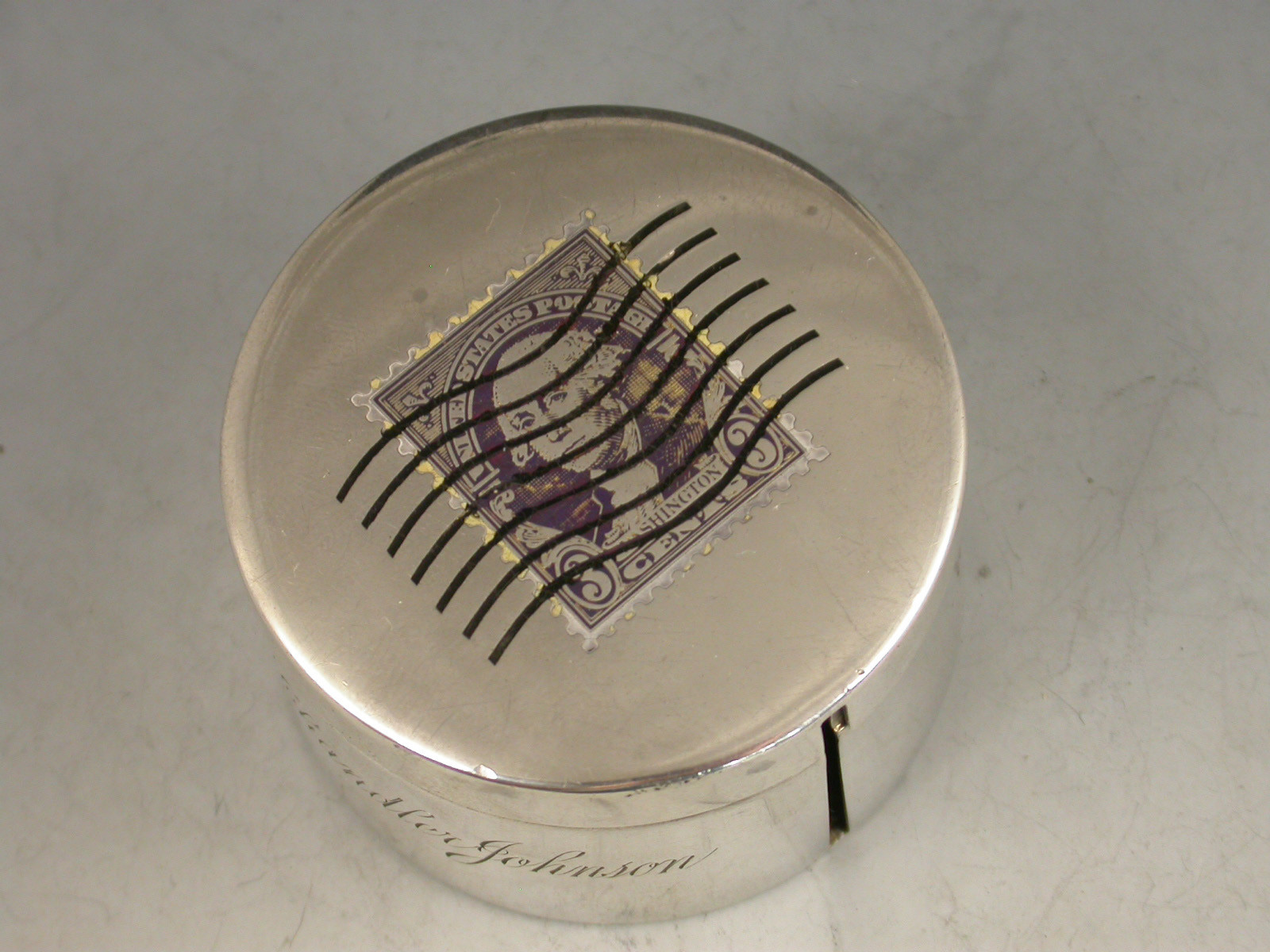 A good early 20th century American sterling silver Stamp Box of circular form with hinged lid set with enamelled 3 cent lilac stamp depicting George Washington, complete with central spindle to hold a roll of stamps dispensed through a slot in the side of the box.