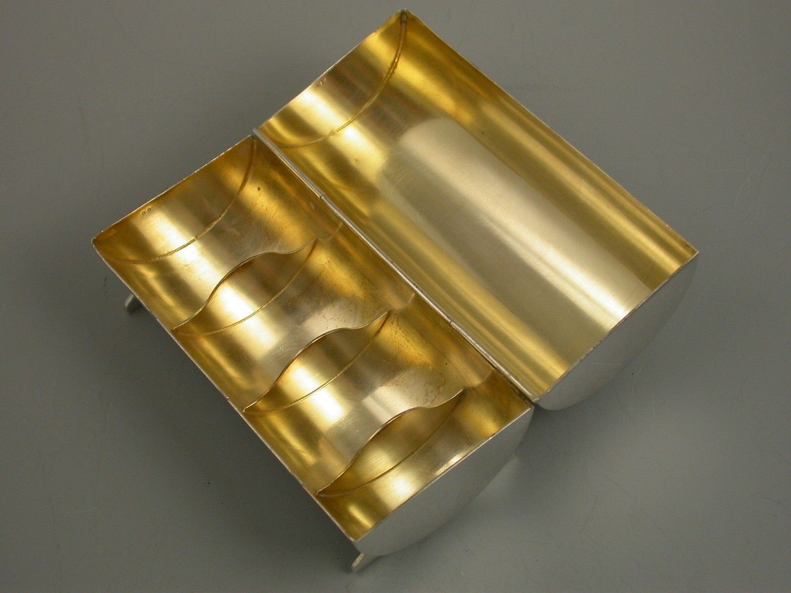 A very rare early 20th century American Sterling silver and enamel four compartment Stamp Roll Dispenser, the cylindrical body standing on two panel feet, the four section dispenser with silver gilt interior and enamelled above the four slits in blue and red for 2c, 3c, 6c and Via Airmail. This combination of rates was only in force between December 15th 1918 and June 30th 1919. So this box must have been one of the earliest to include a compartment for Airmail labels, the official US Airmail service having been inaugurated on May 15th 1918.