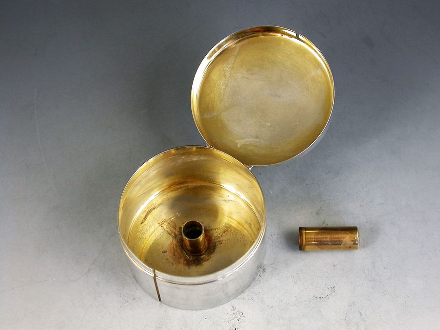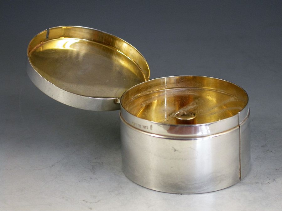 A good early 20th century sterling silver Stamp Box of circular form, the hinged lid enamelled with a flying Mallard Duck, the silver gilt interior complete with central spindle to hold a roll of stamps dispensed through a slot in the side of the box.
