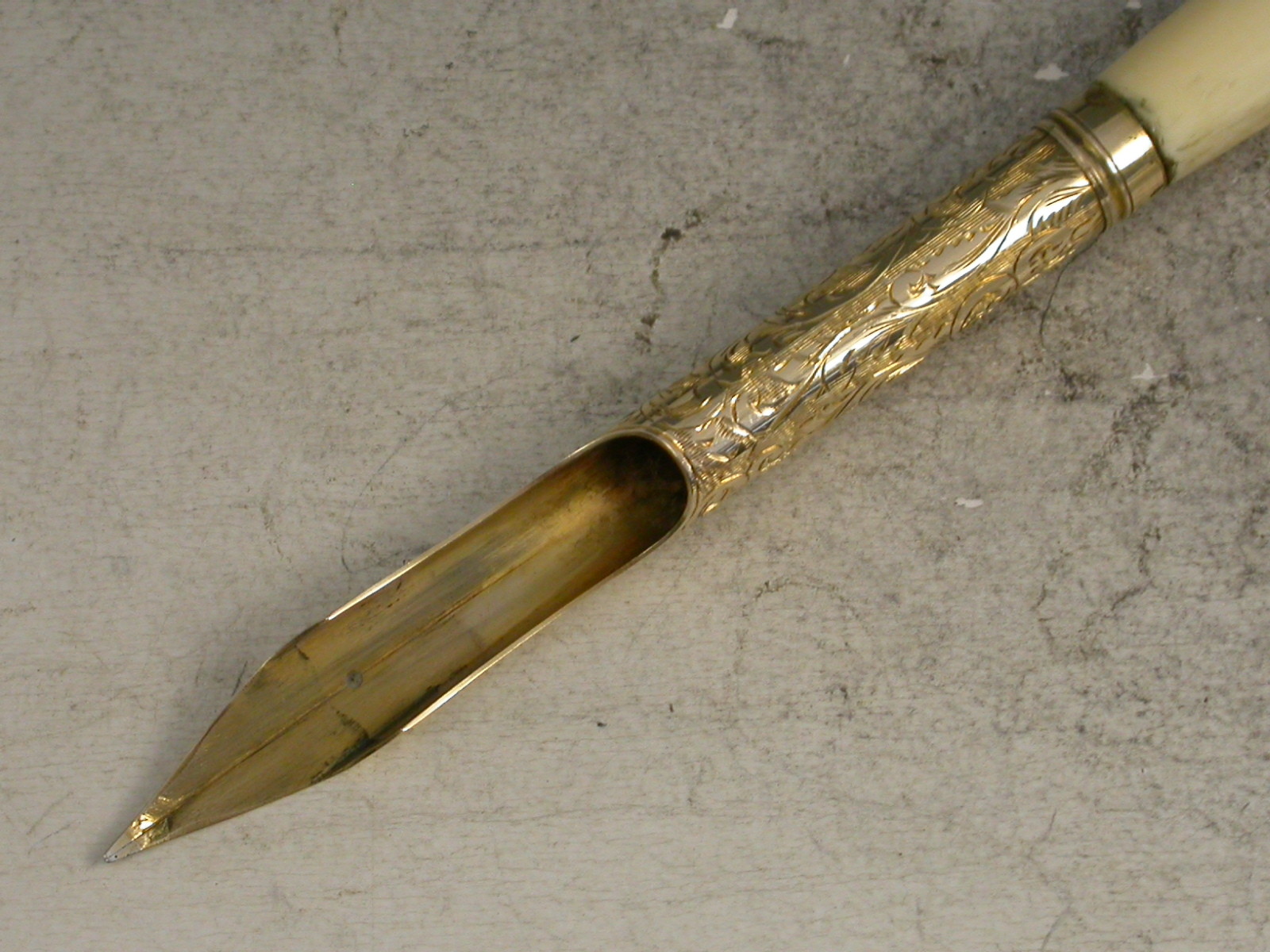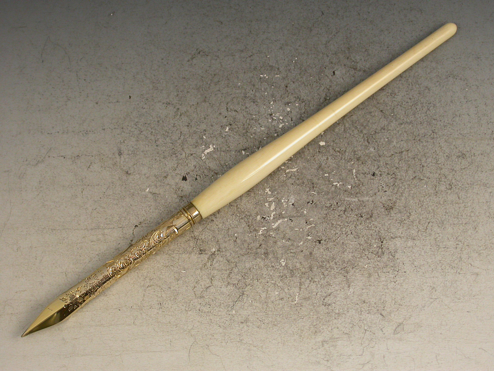 An extremely fine and rare Victorian gold Dip Pen with shaped ivory shaft and large magnum bonham barrel type gold nib finely engraved with foliate scrolls.