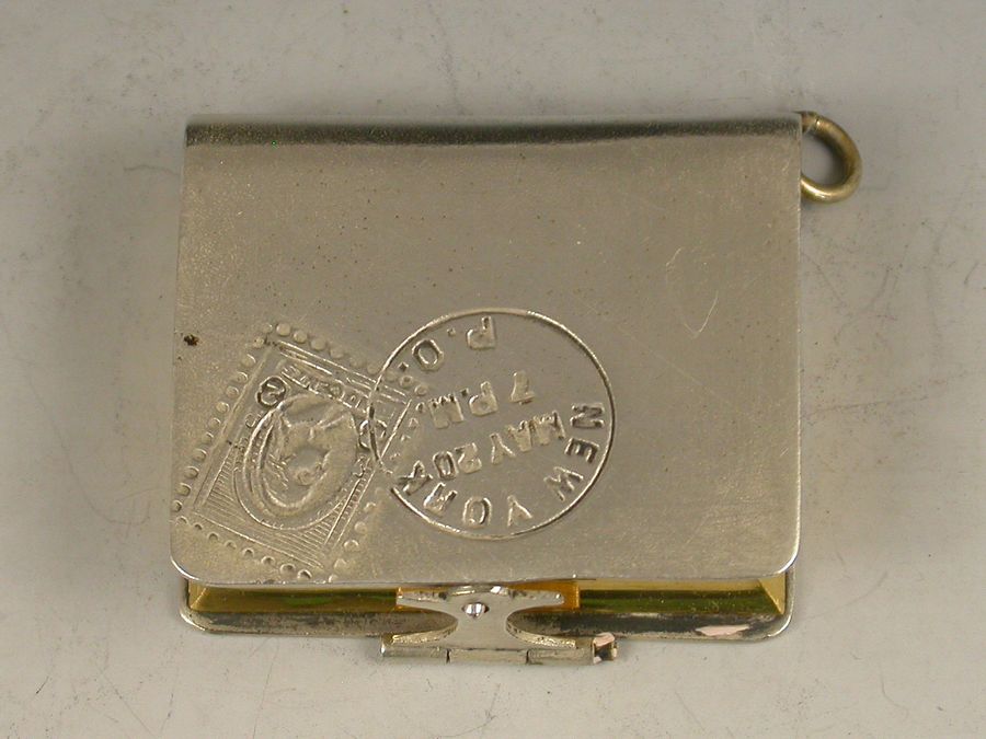 A late 19th century American novelty silver plated Stamp Case of hinged book form with hinged clasp to close, the cover embossed with a 2 cent stamp and a New York postmark, with sloping silver gilded interior and sides.