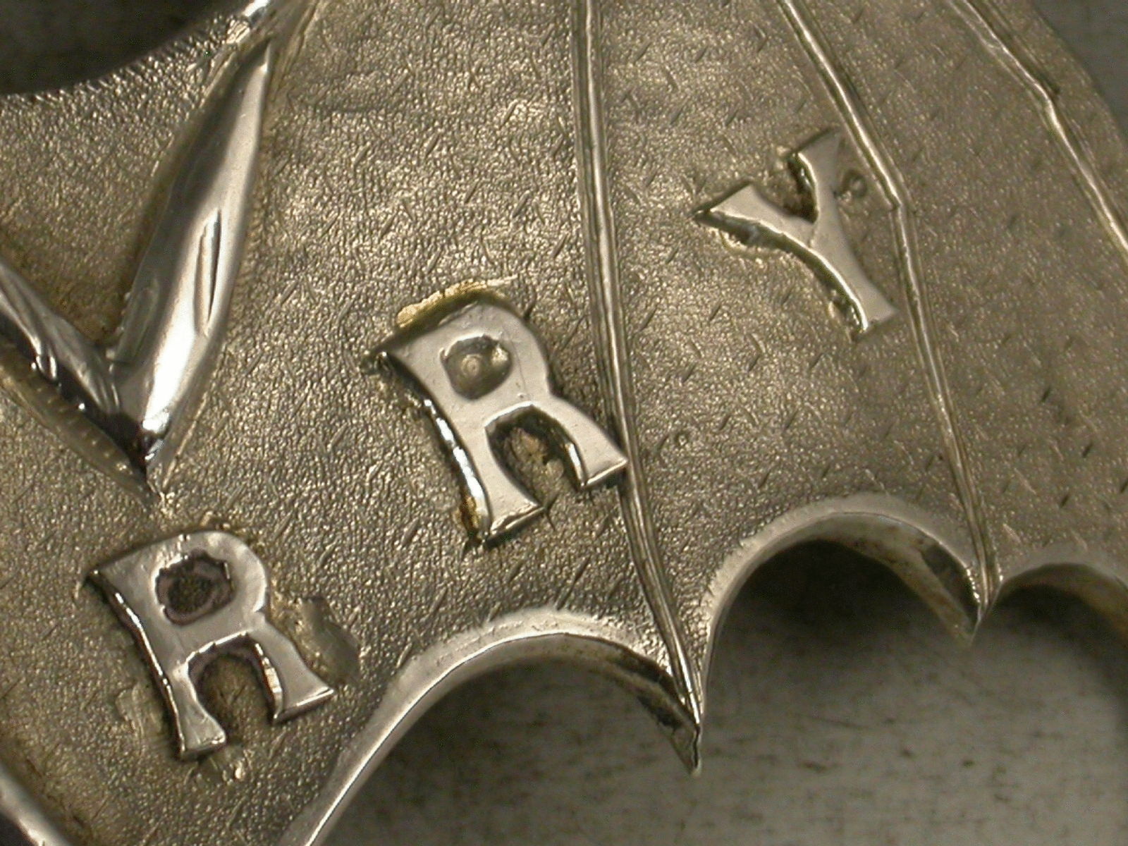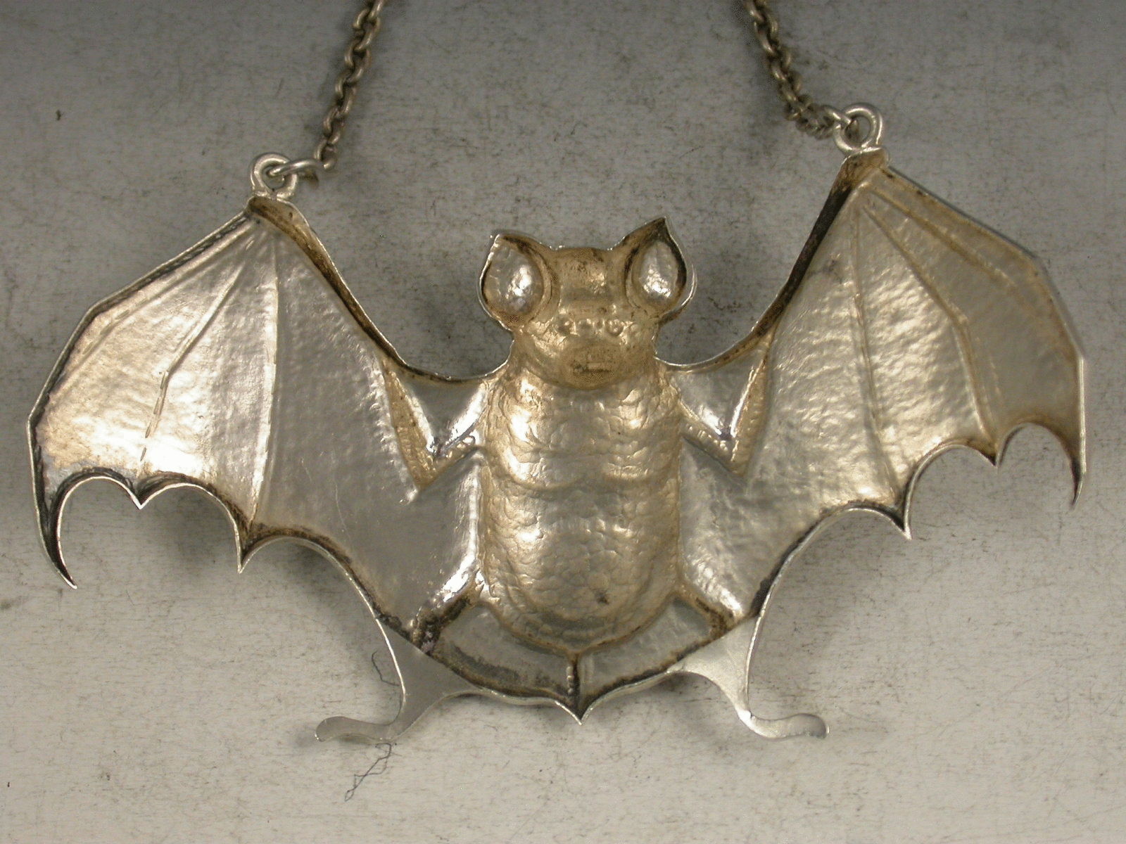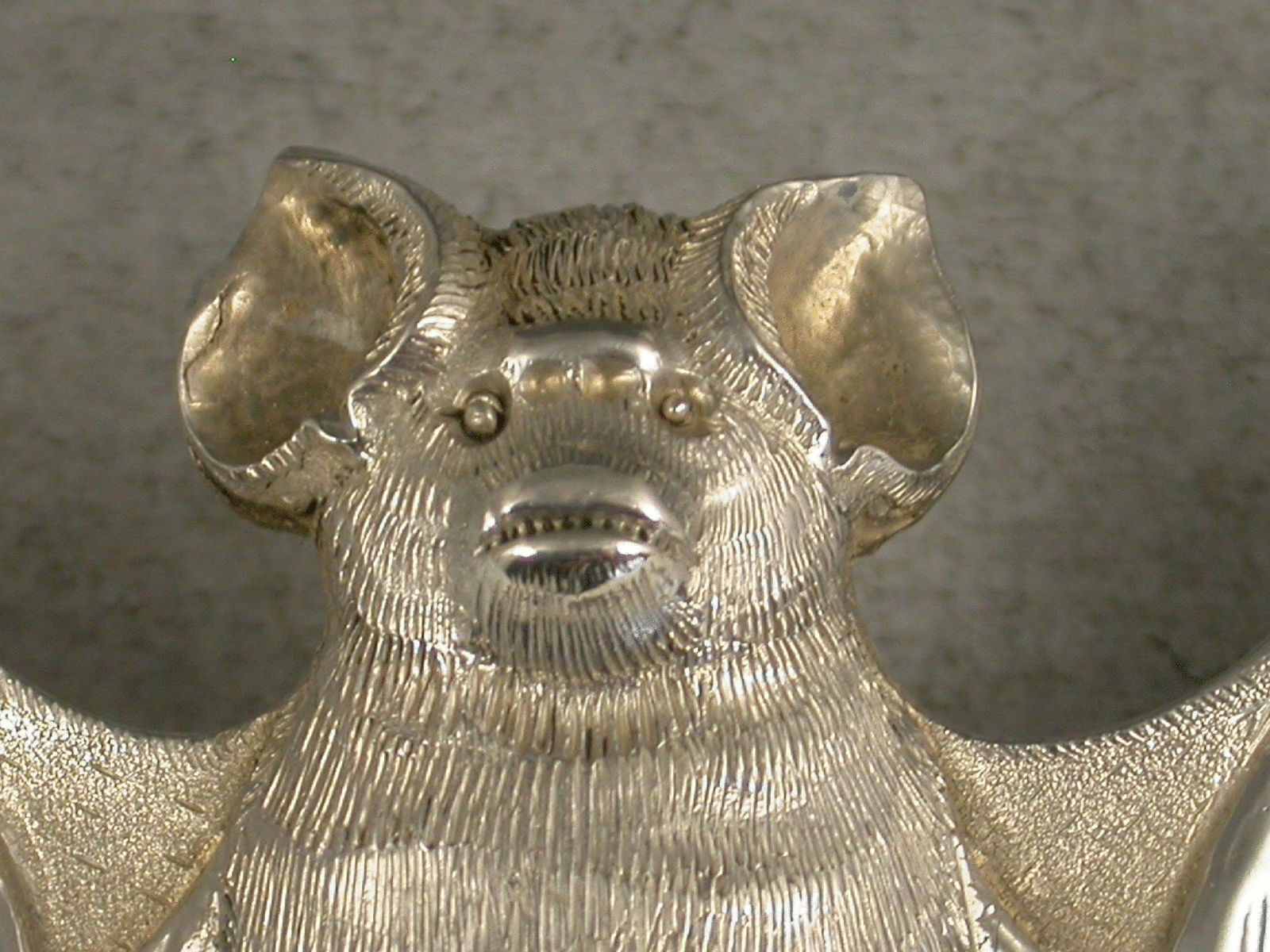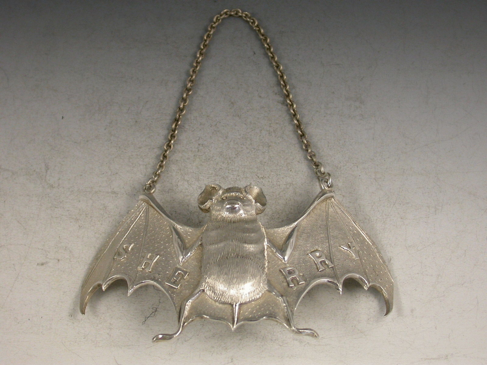 A large 19th century unmarked Chinese silver Wine Label, made in the form of a fruit bat with out-stretched wings, finely tooled to resemble fur and with an engraved matt ground to the wings and applied letters for Sherry.