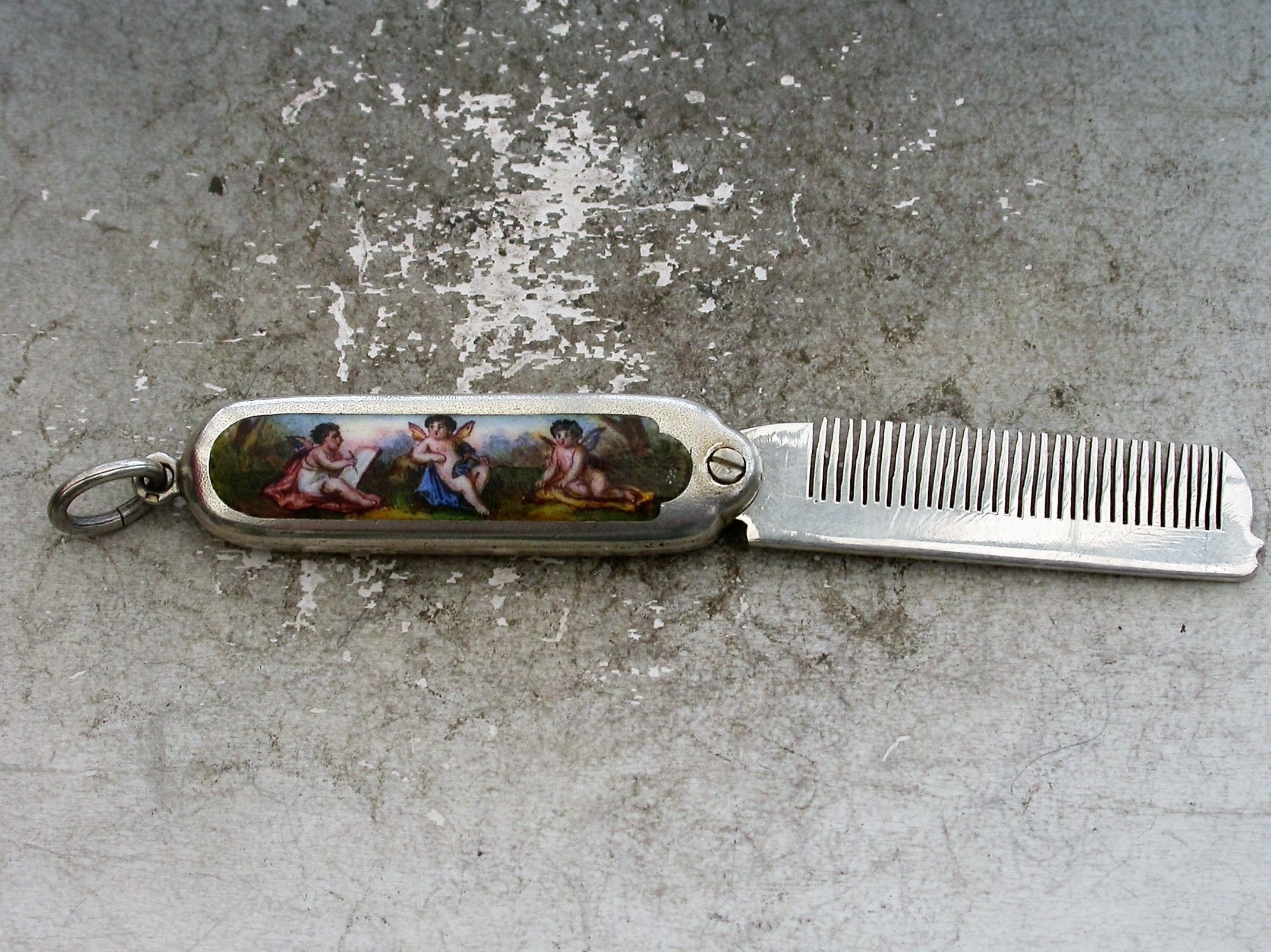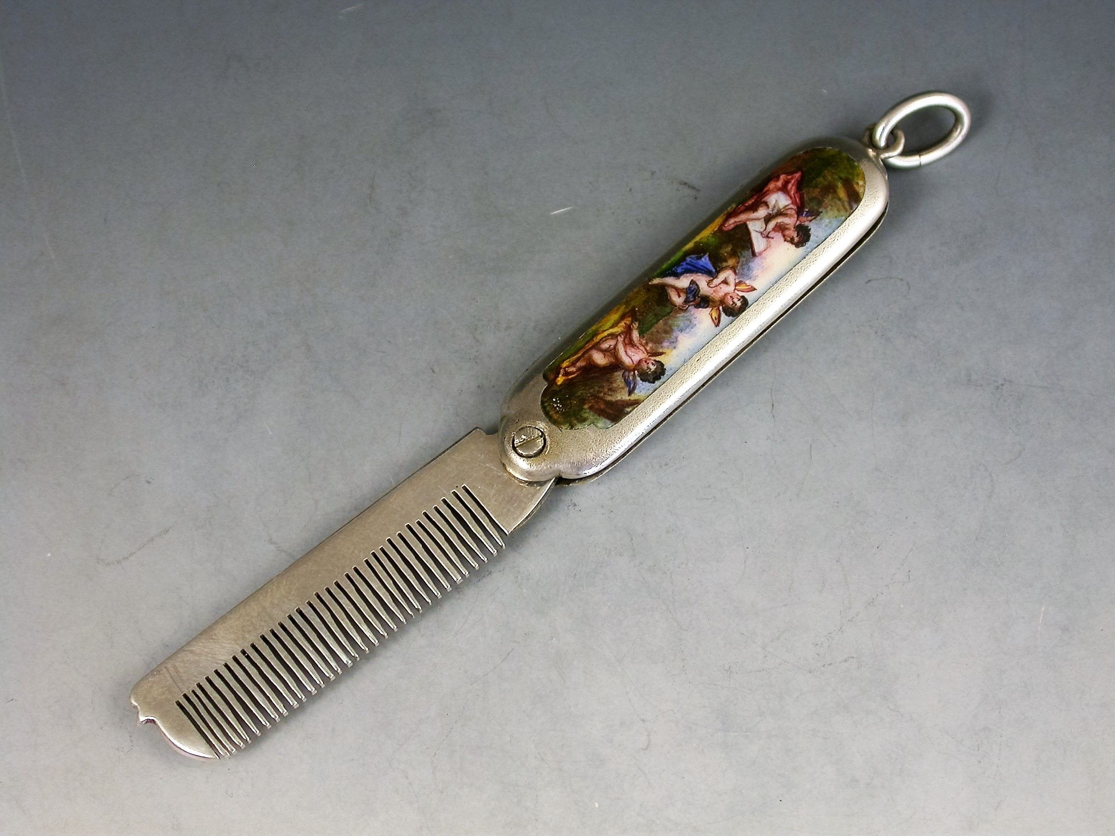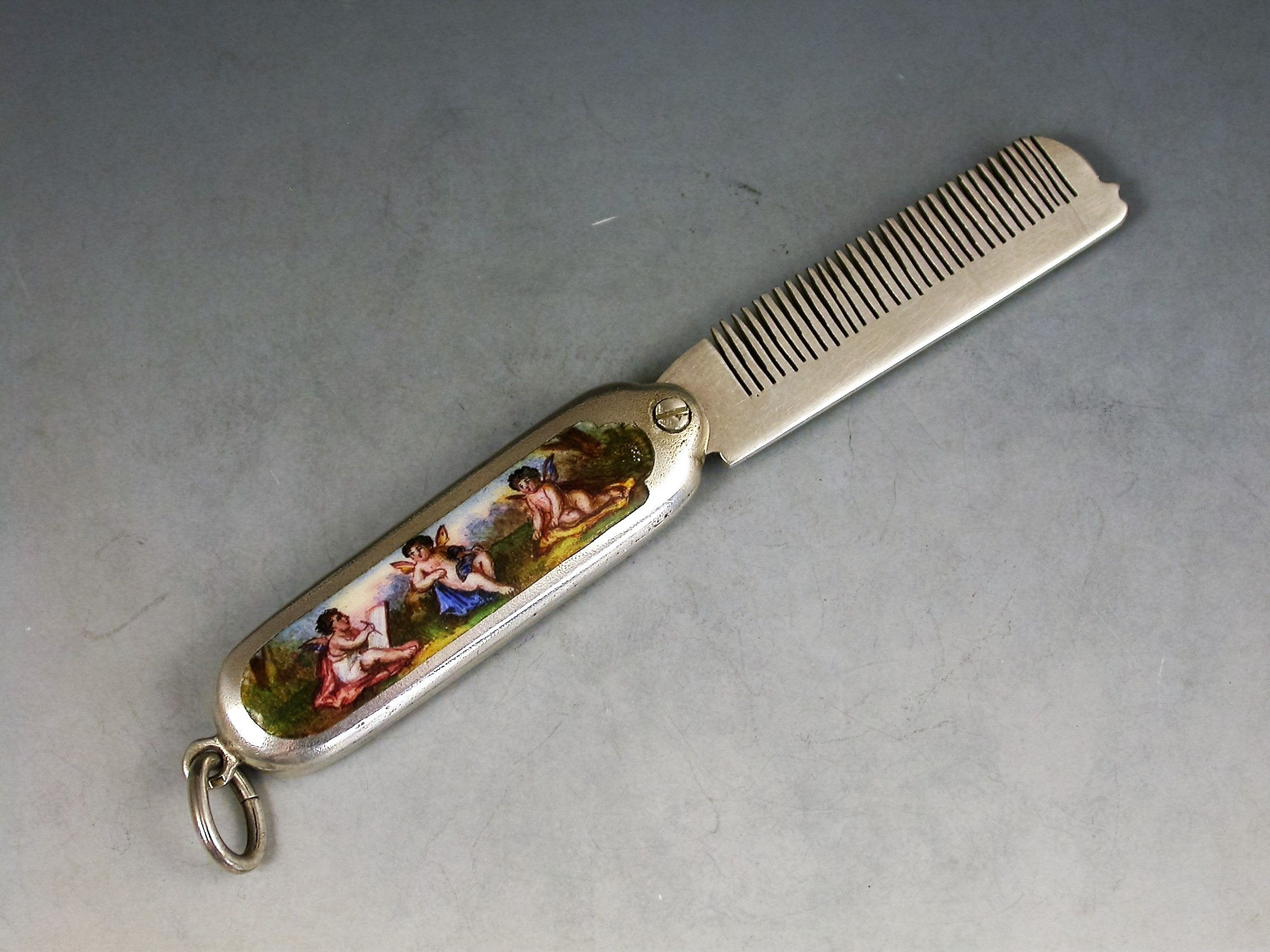 A good quality Continental silver and enamel miniature Moustache Comb with attached suspension ring with swiveling hinge to open the comb, the handle inset with an enamel panel depicting three winged cherubs, one painting the other two.