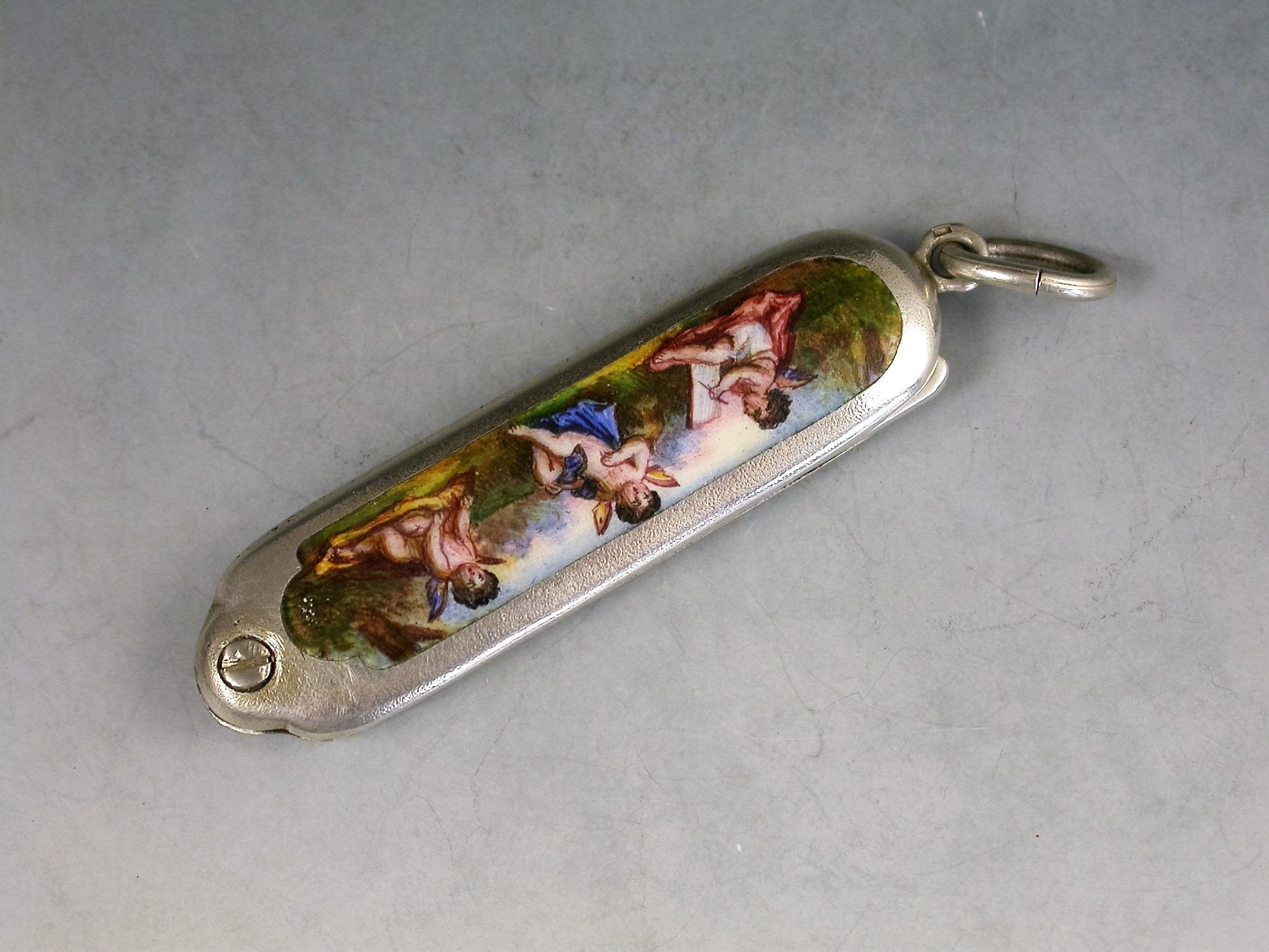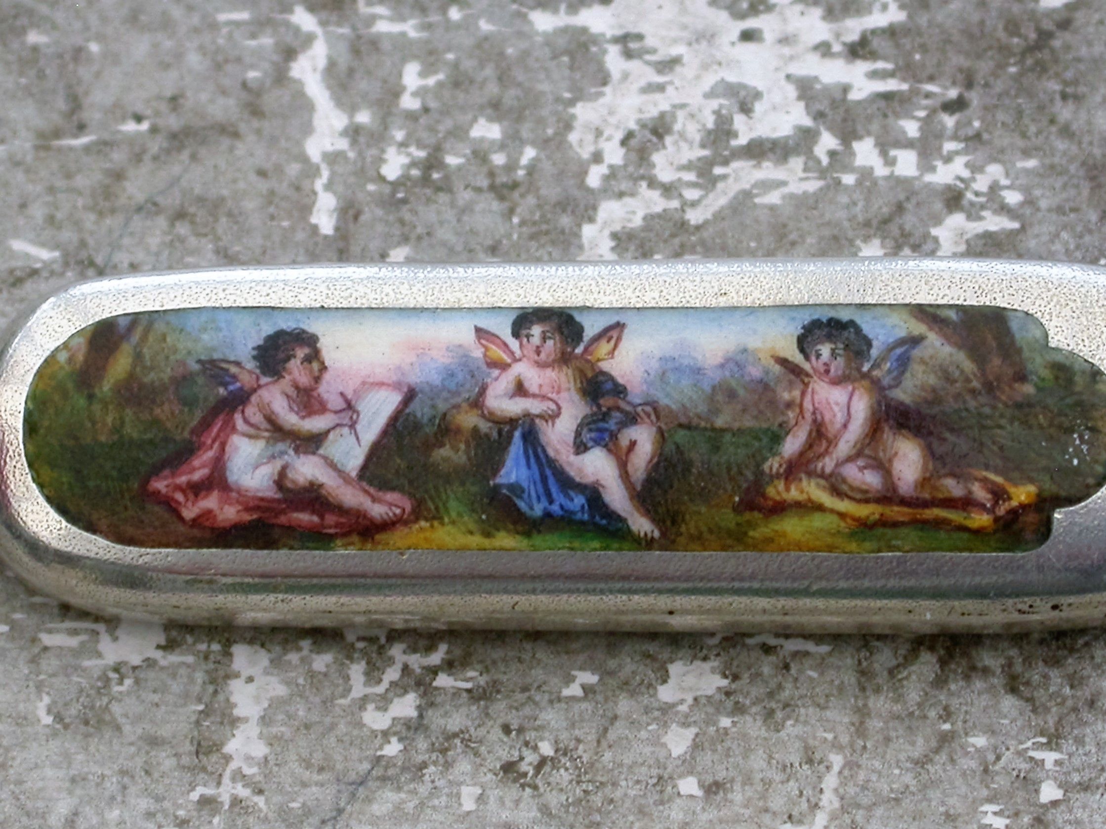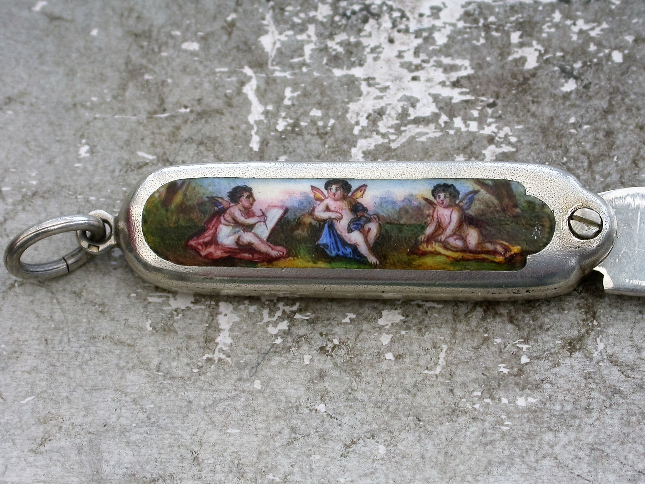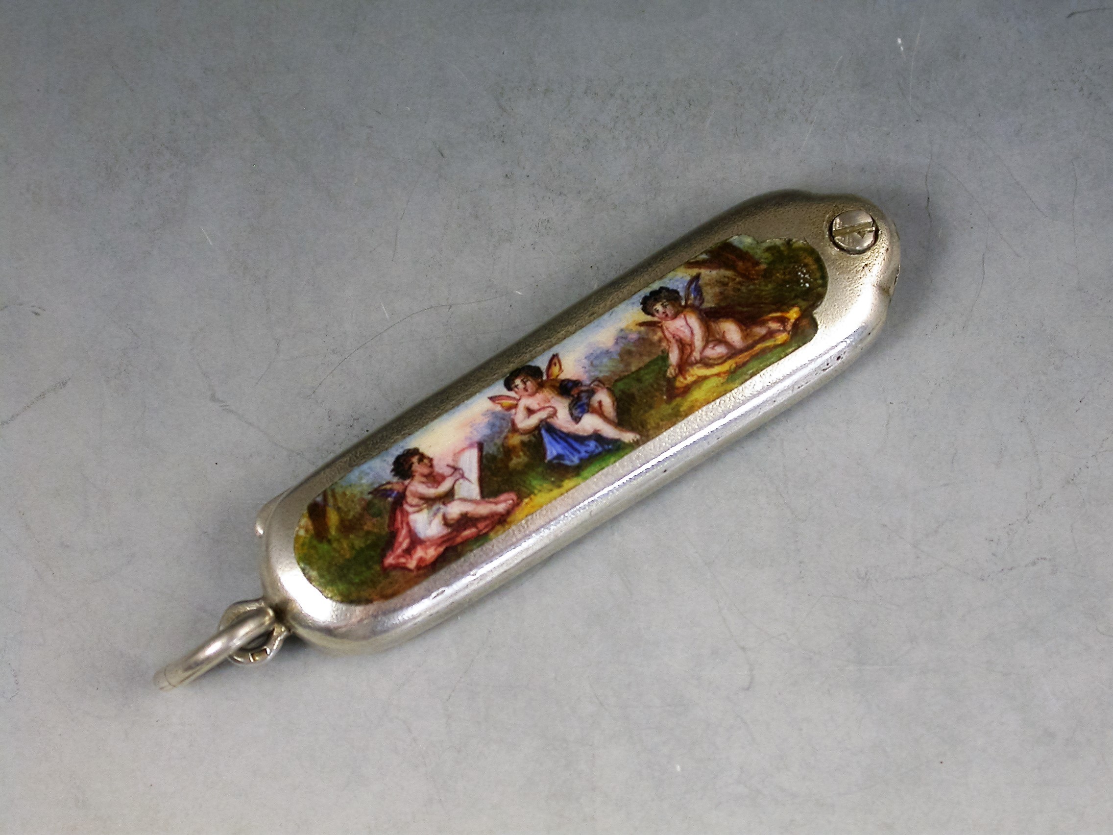 A good quality Continental silver and enamel miniature Moustache Comb with attached suspension ring with swiveling hinge to open the comb, the handle inset with an enamel panel depicting three winged cherubs, one painting the other two.