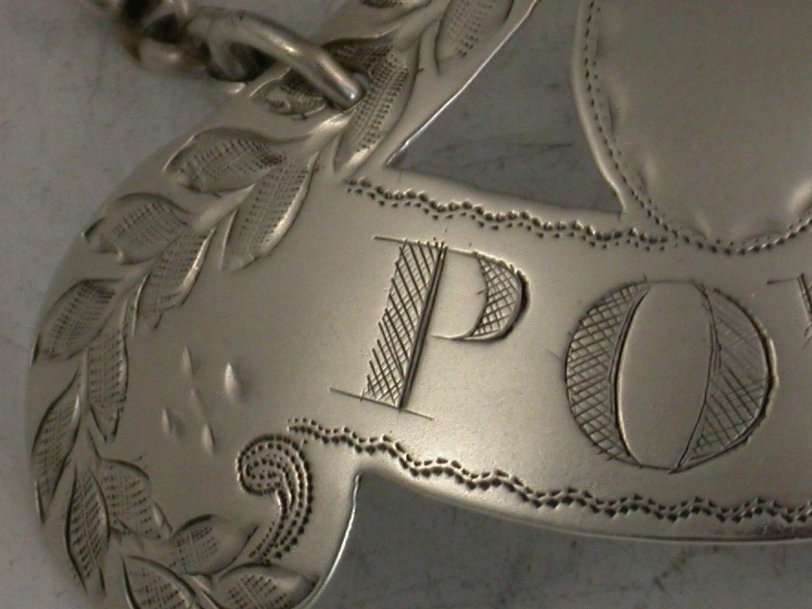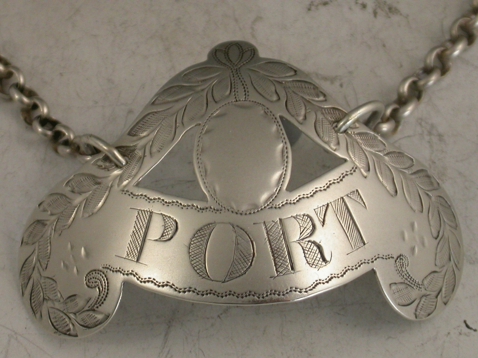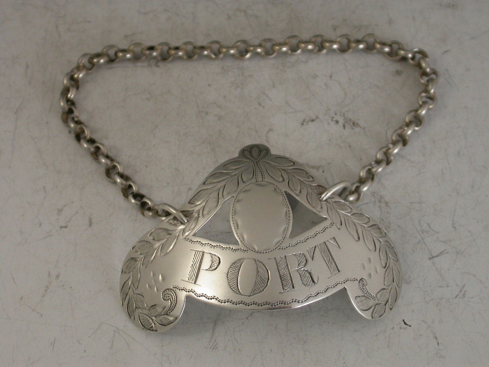 An extremely rare and interesting Scottish Provincial silver Wine Label of curved double scroll form with swags supporting a vacant oval cartouche, engraved for Port in a distinctive cross-hatched style and with a border of engraved laurel leaves.