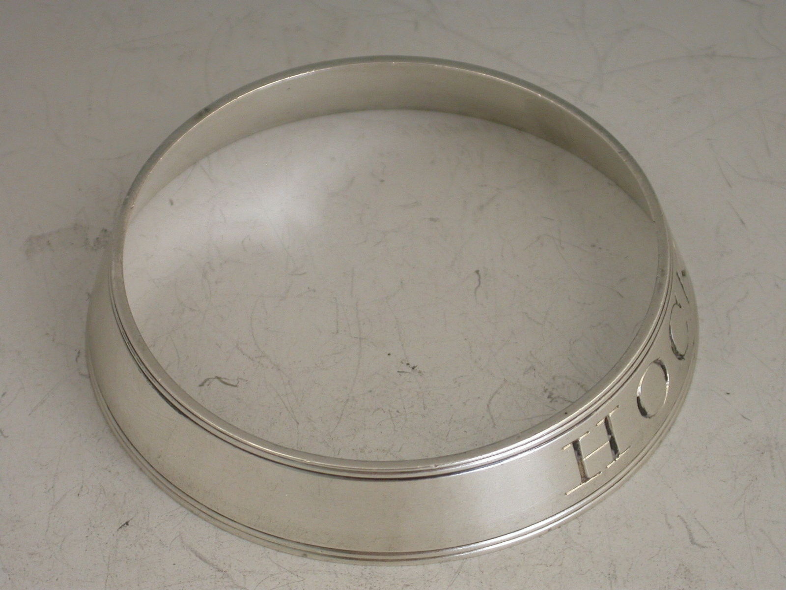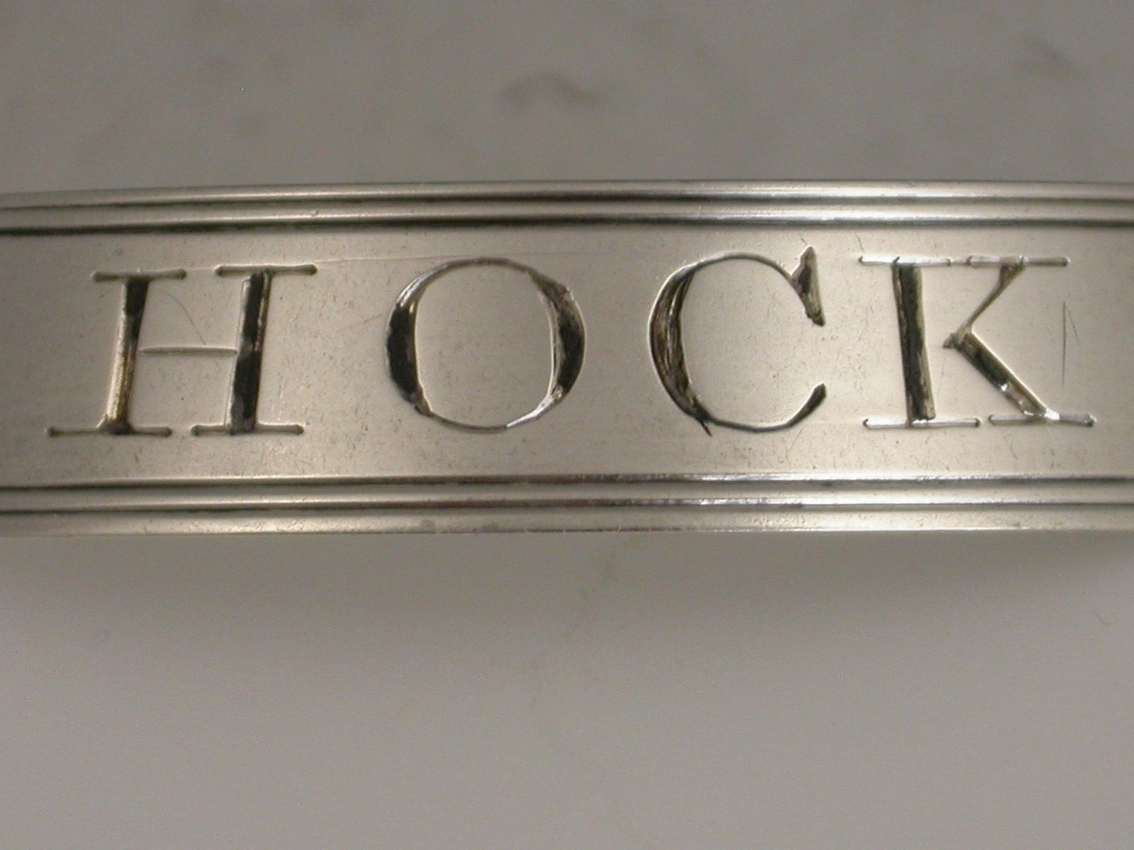 A good George III antique silver Wine Label of 'bottle collar' form with plain sloping sides with reeded borders, incised for Hock.