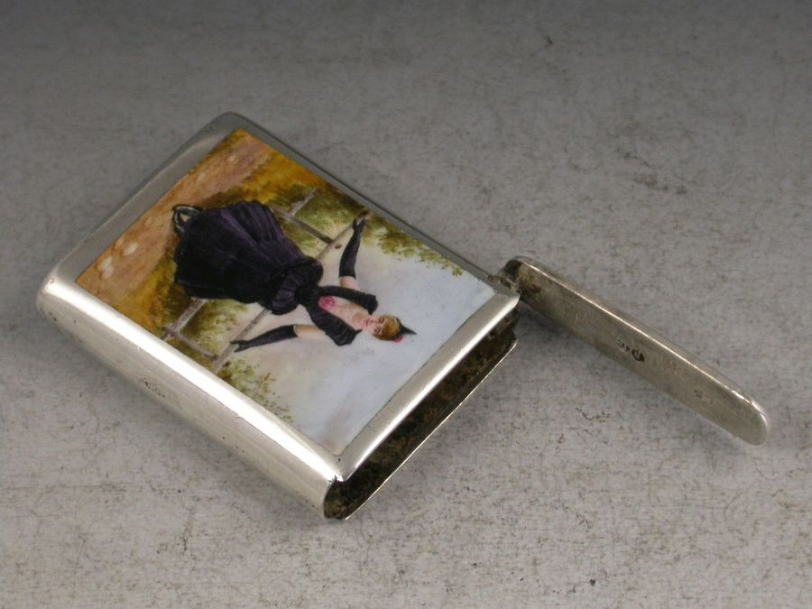 A good Victorian silver and enamel Vesta Case of rounded rectangular form with sprung hinged flat top lid, the enamelled panel depicting a glamorous lady in a black dress with a pink rose in her cleavage' leaning against a fence.