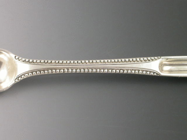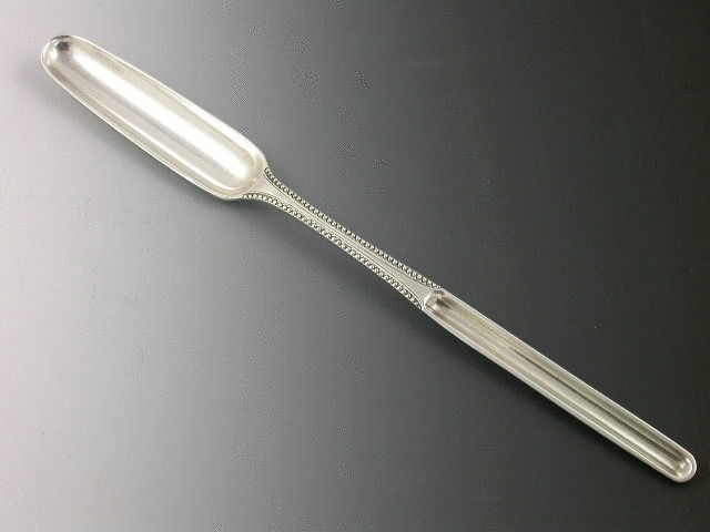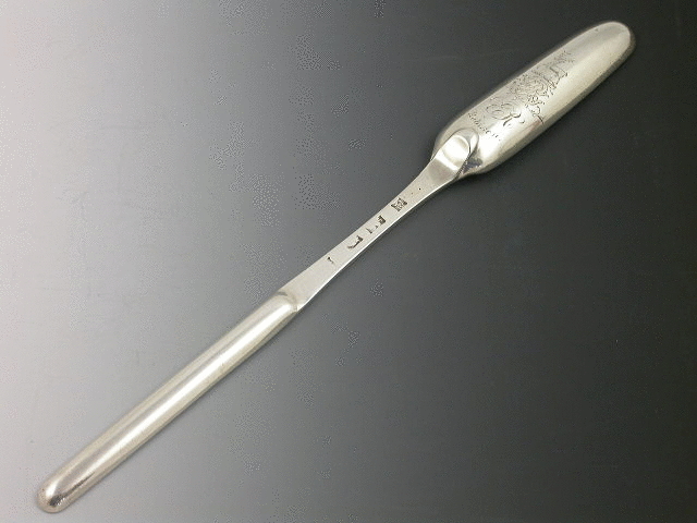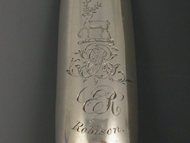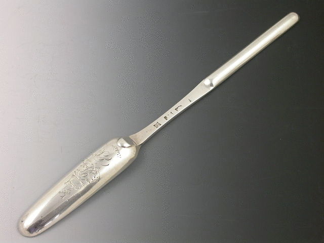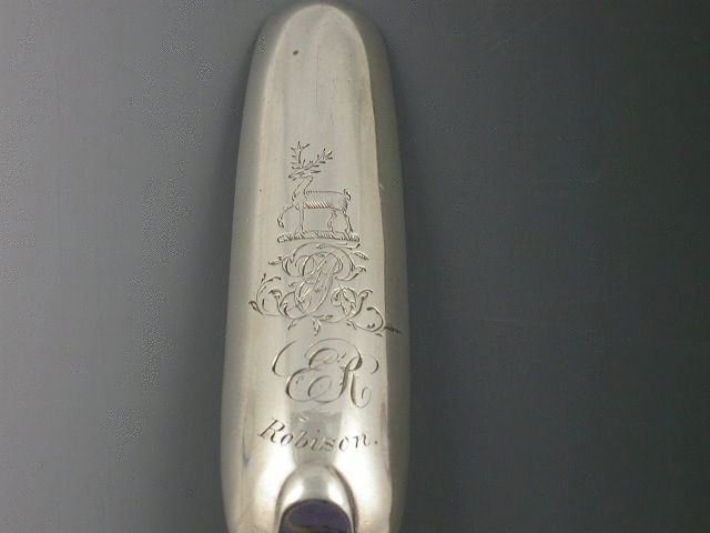 A fine George III silver Marrow Scoop with bead edge handle, the bowl engraved with a Stag Tripant, two sets of script initials and the family name; ""Robison"".
