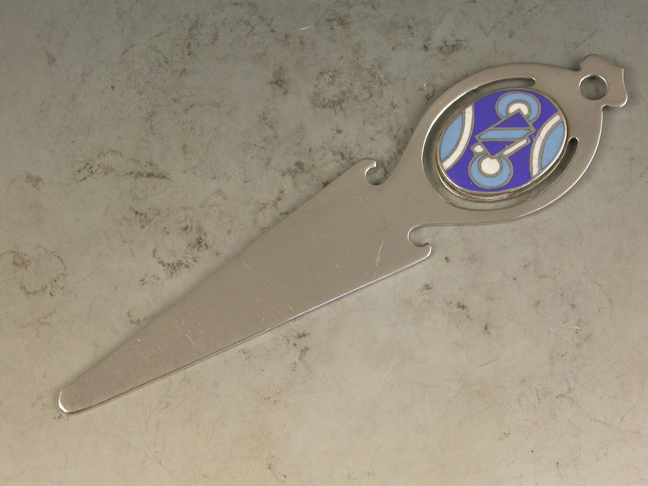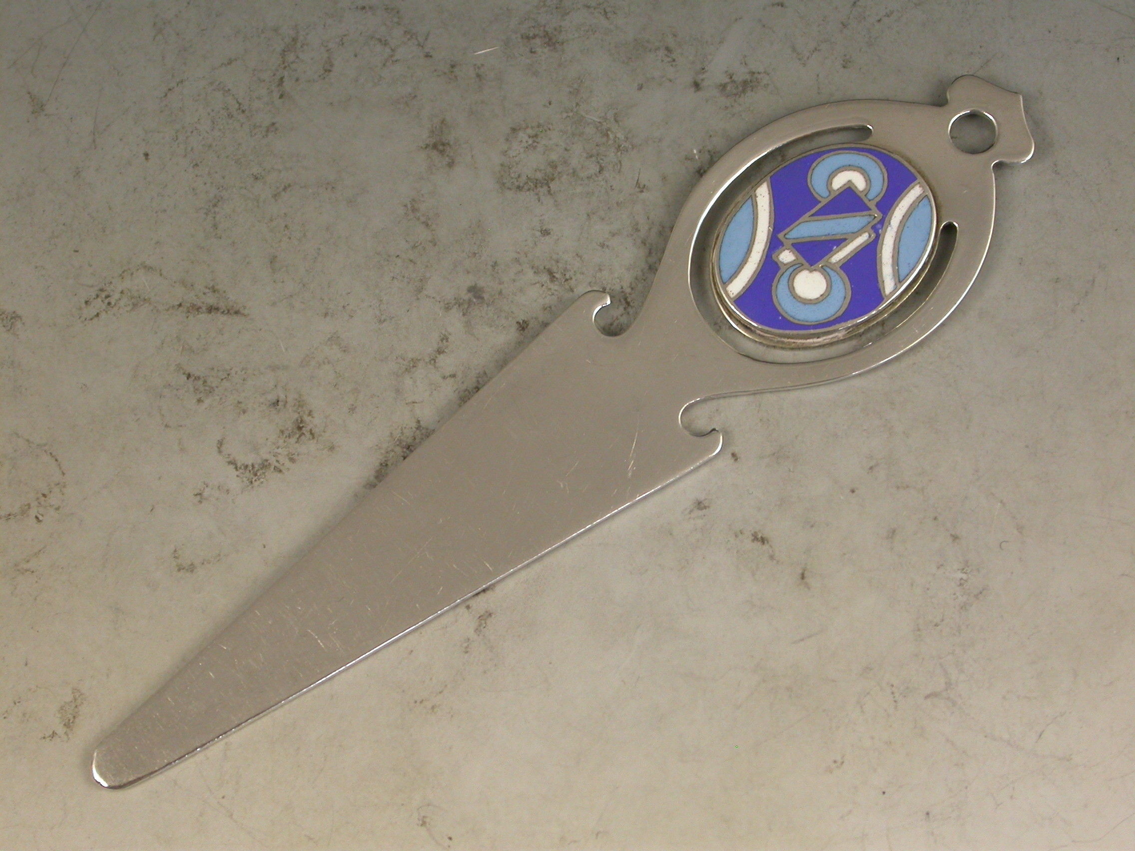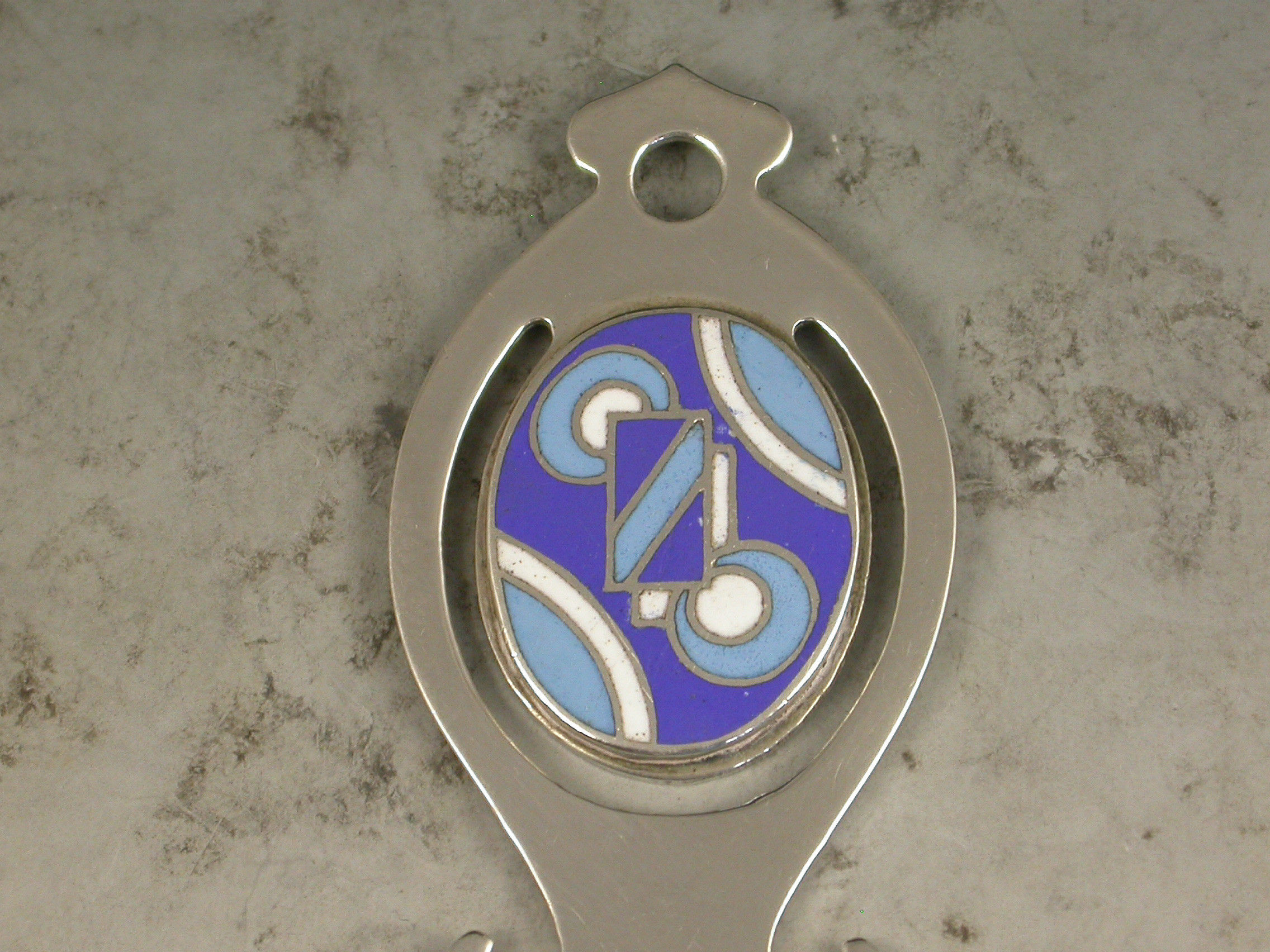 A George V silver Bookmark, the pierced handle with applied enamel disc depicting Art Deco style symbols in blue and white enamels.