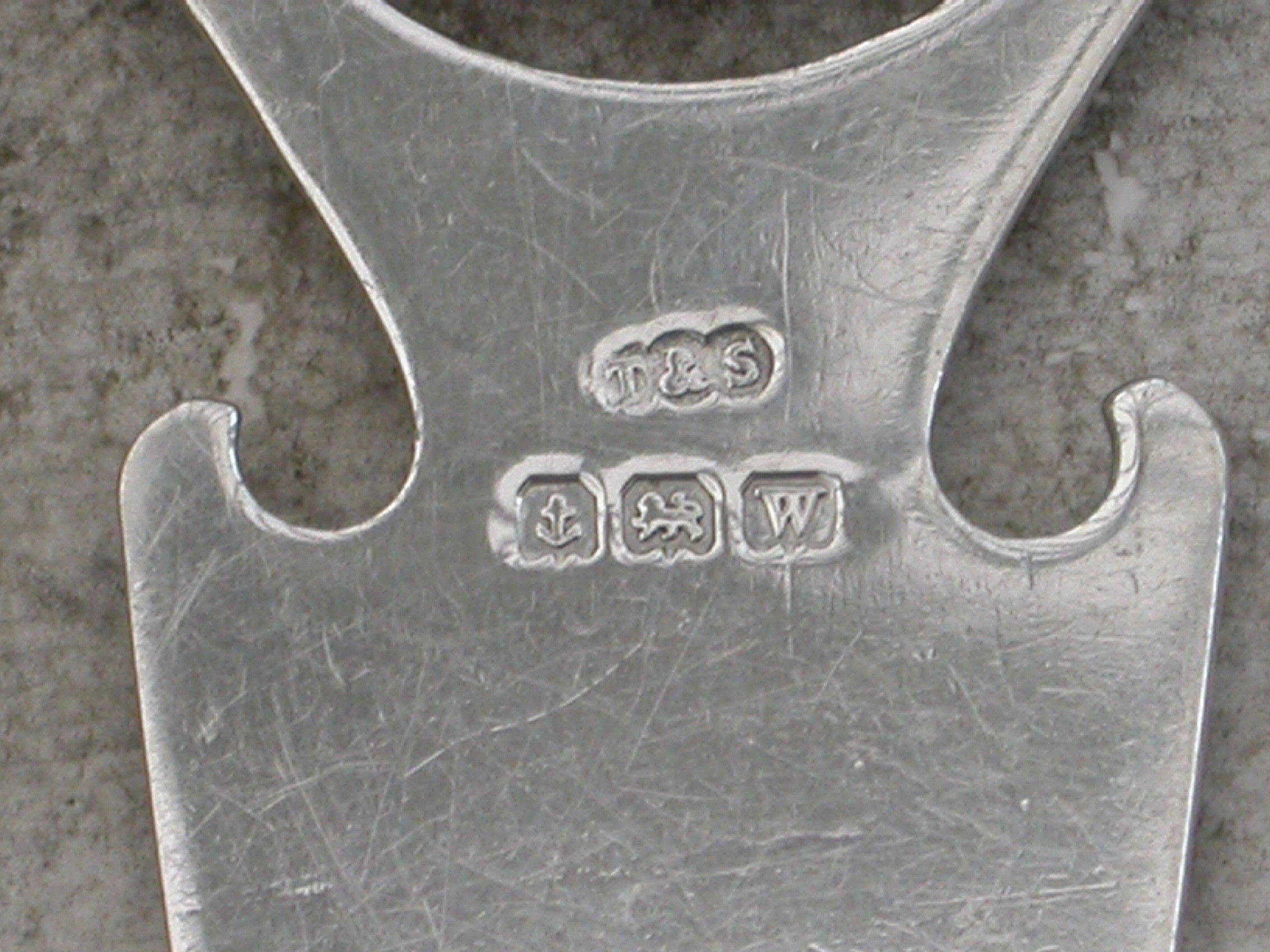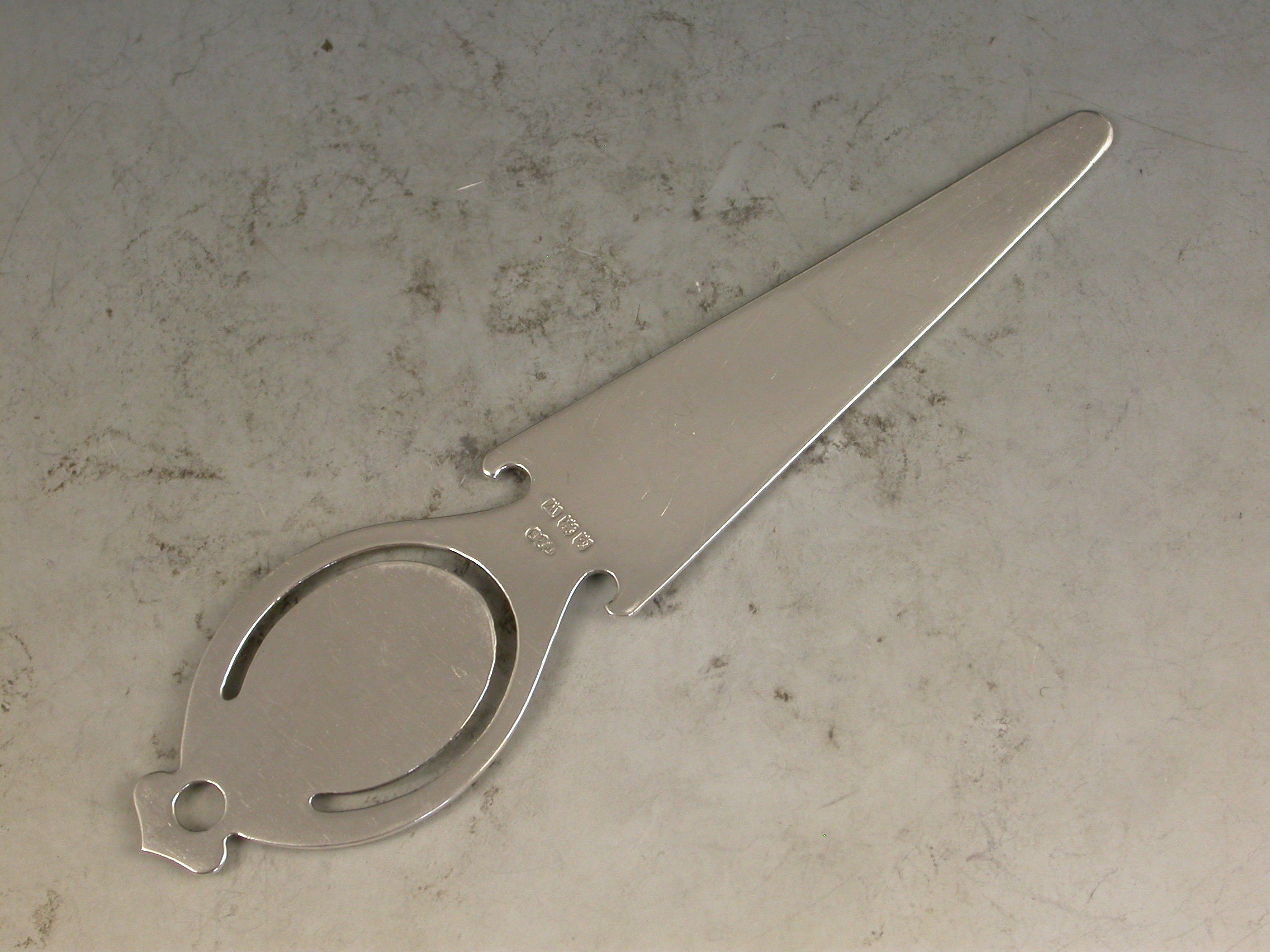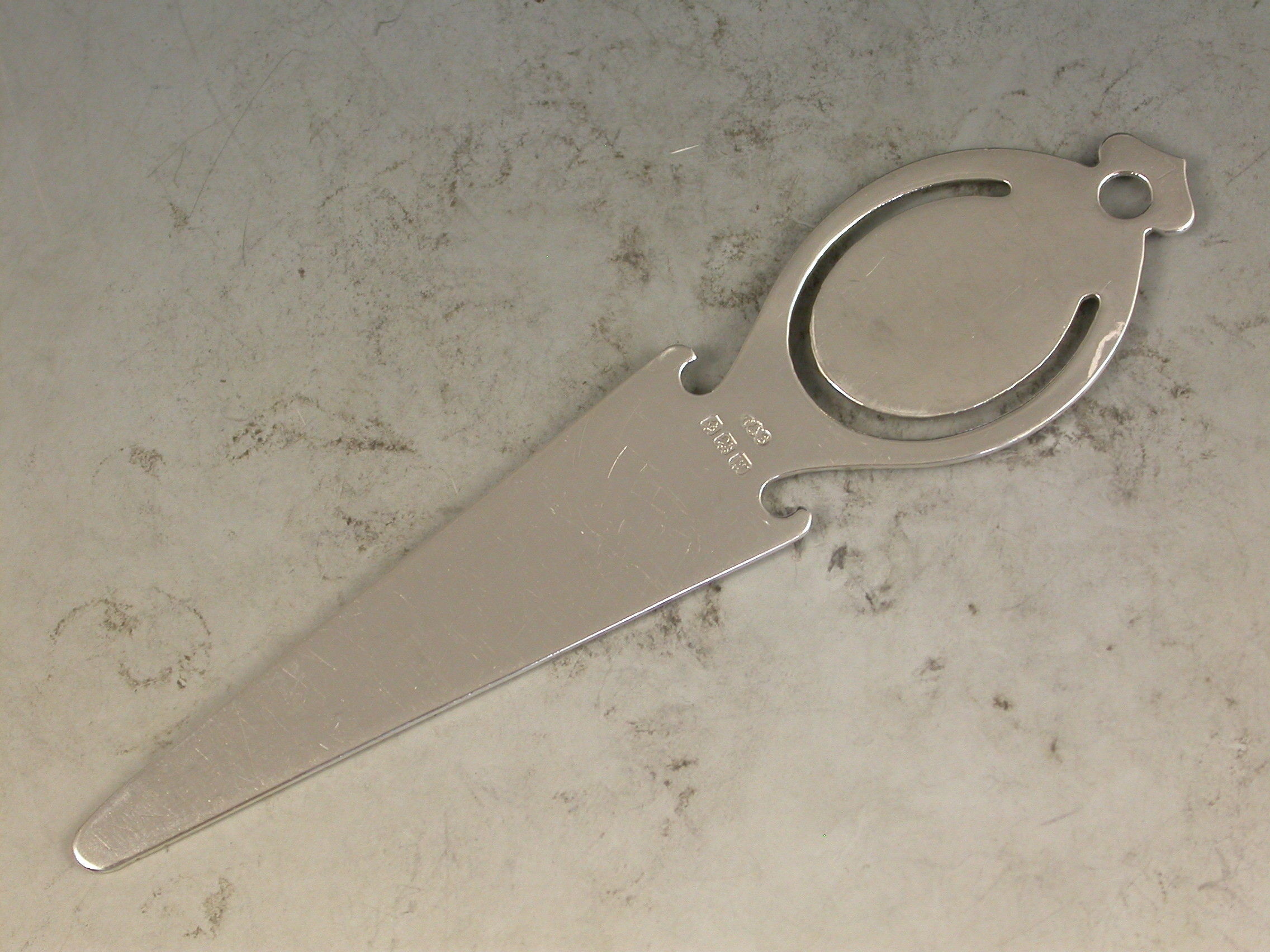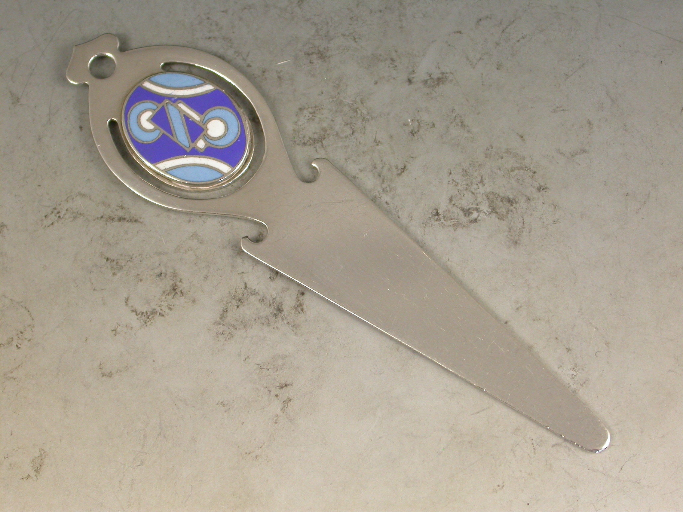 A George V silver Bookmark, the pierced handle with applied enamel disc depicting Art Deco style symbols in blue and white enamels.