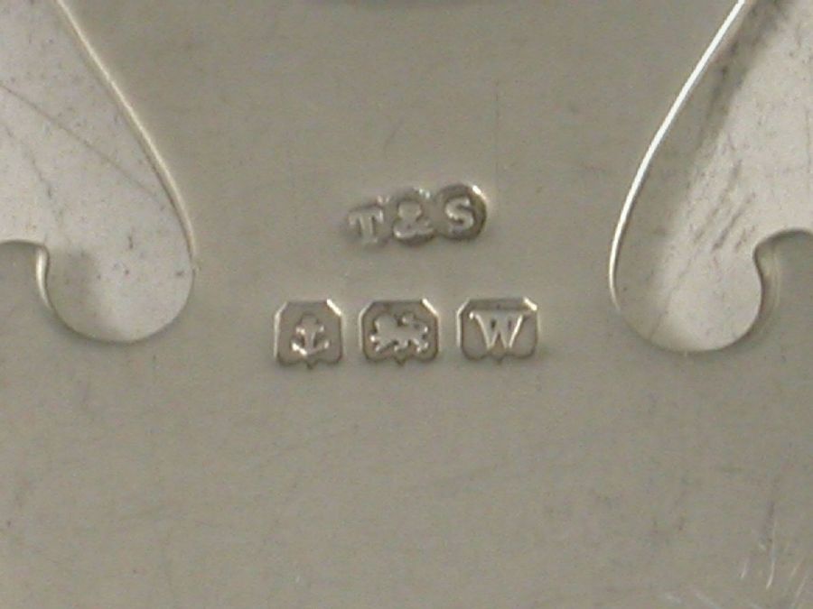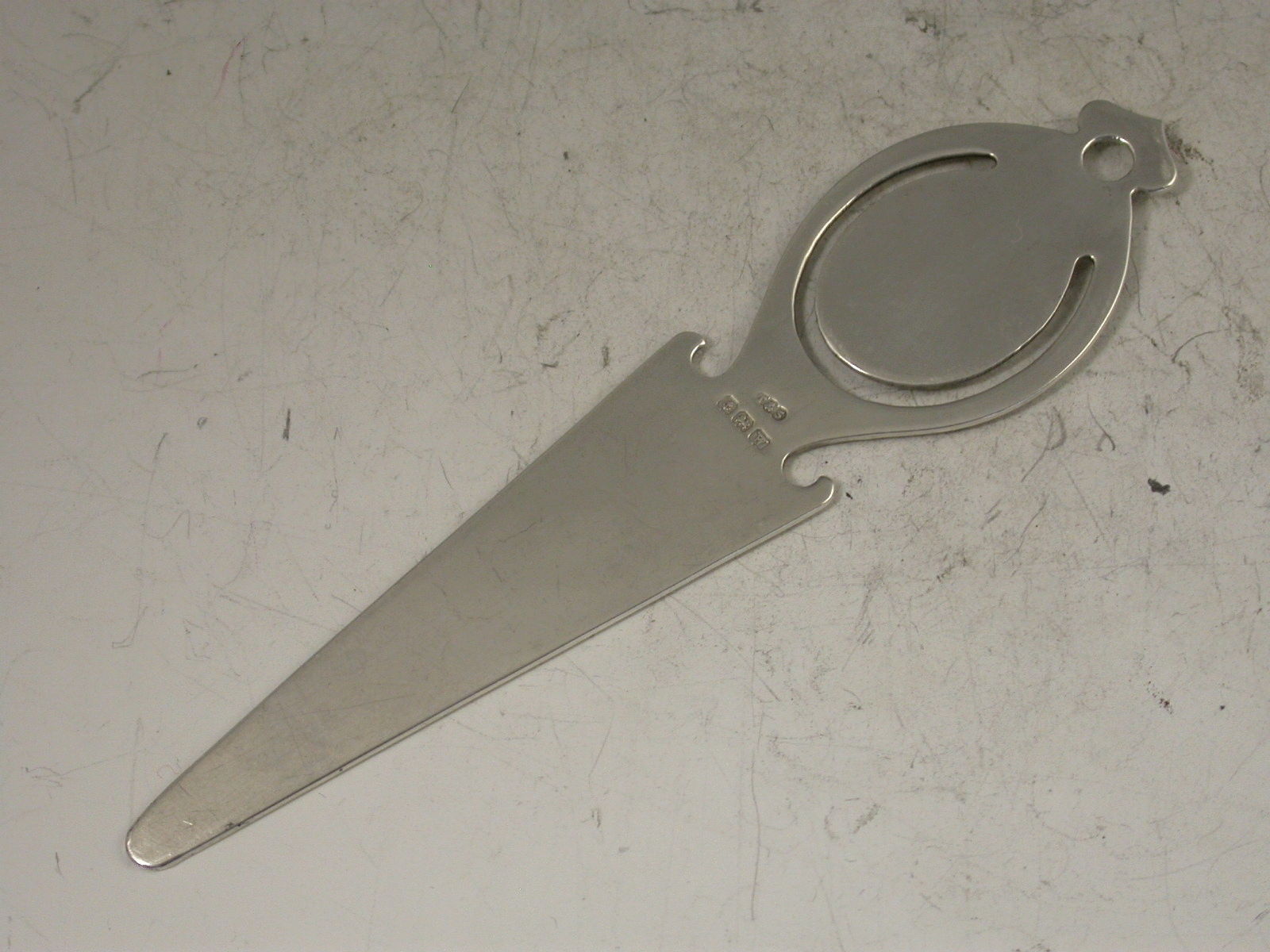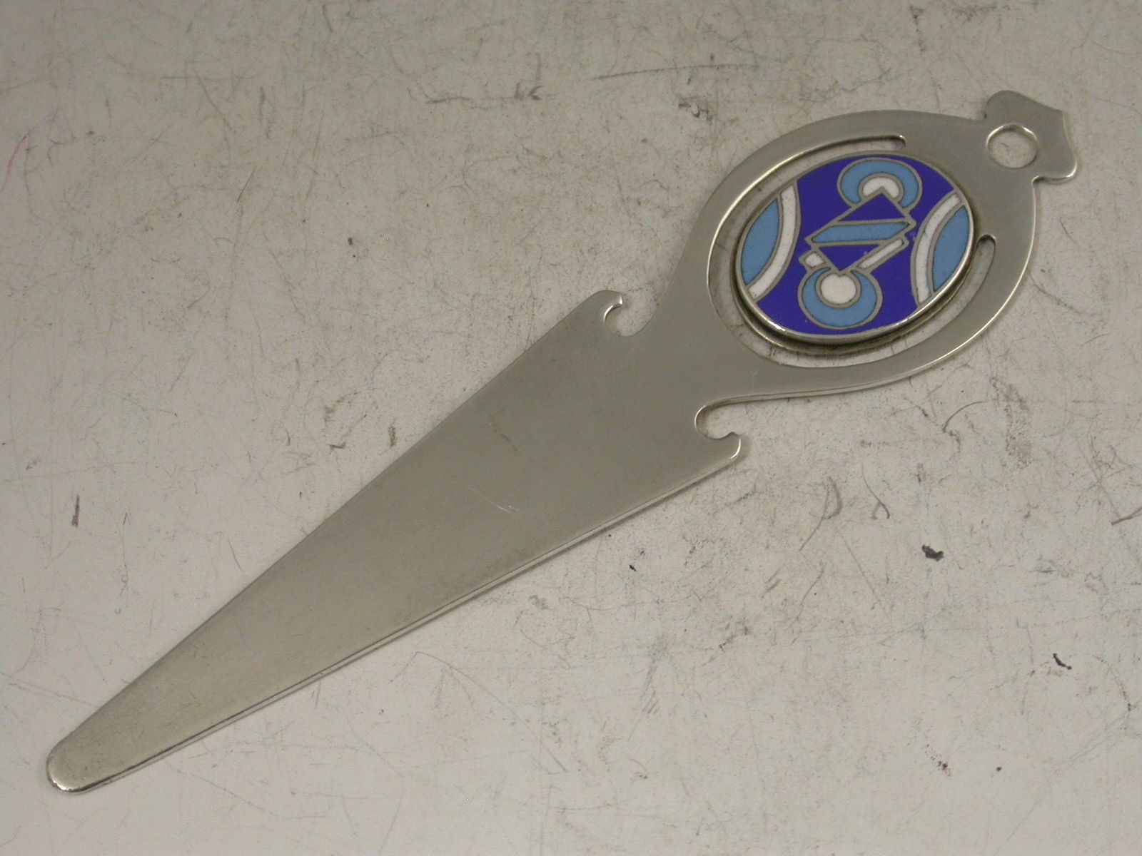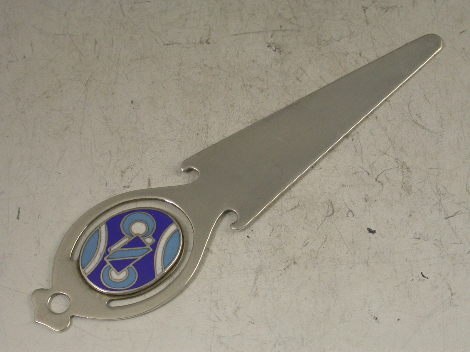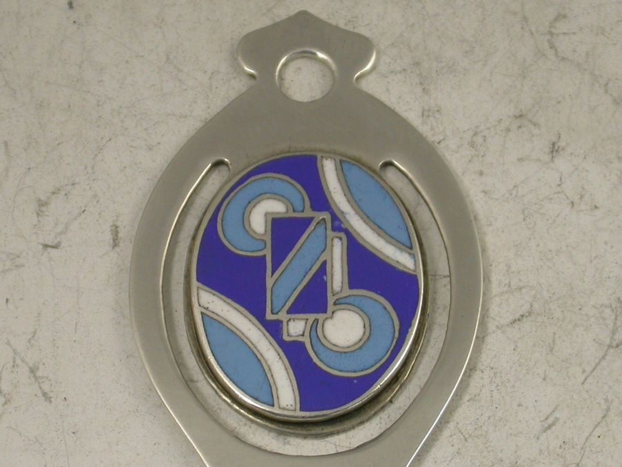 A George V silver Bookmark, the pierced handle with applied enamel disc depicting Art Deco style symbols in blue and white enamels.