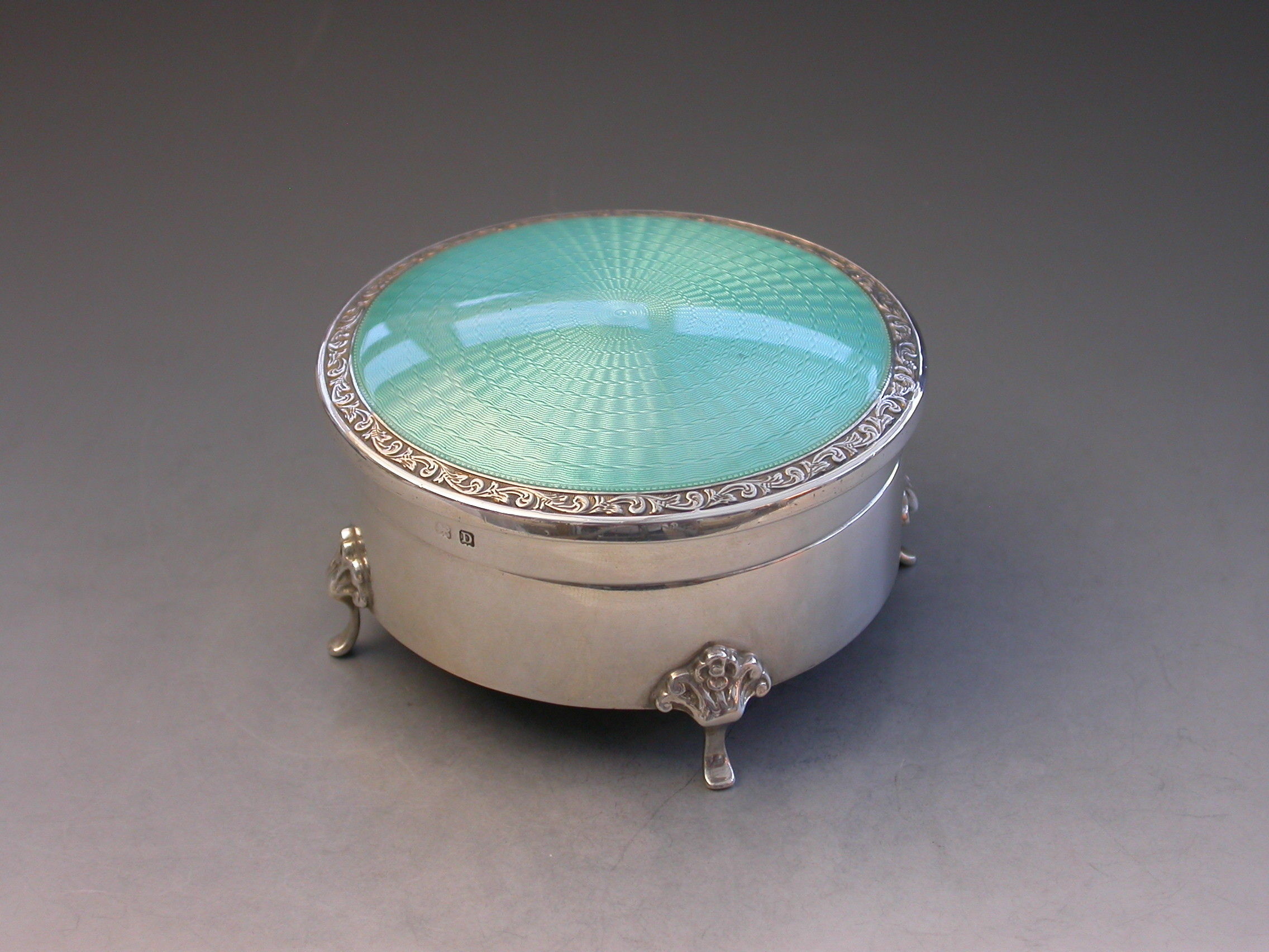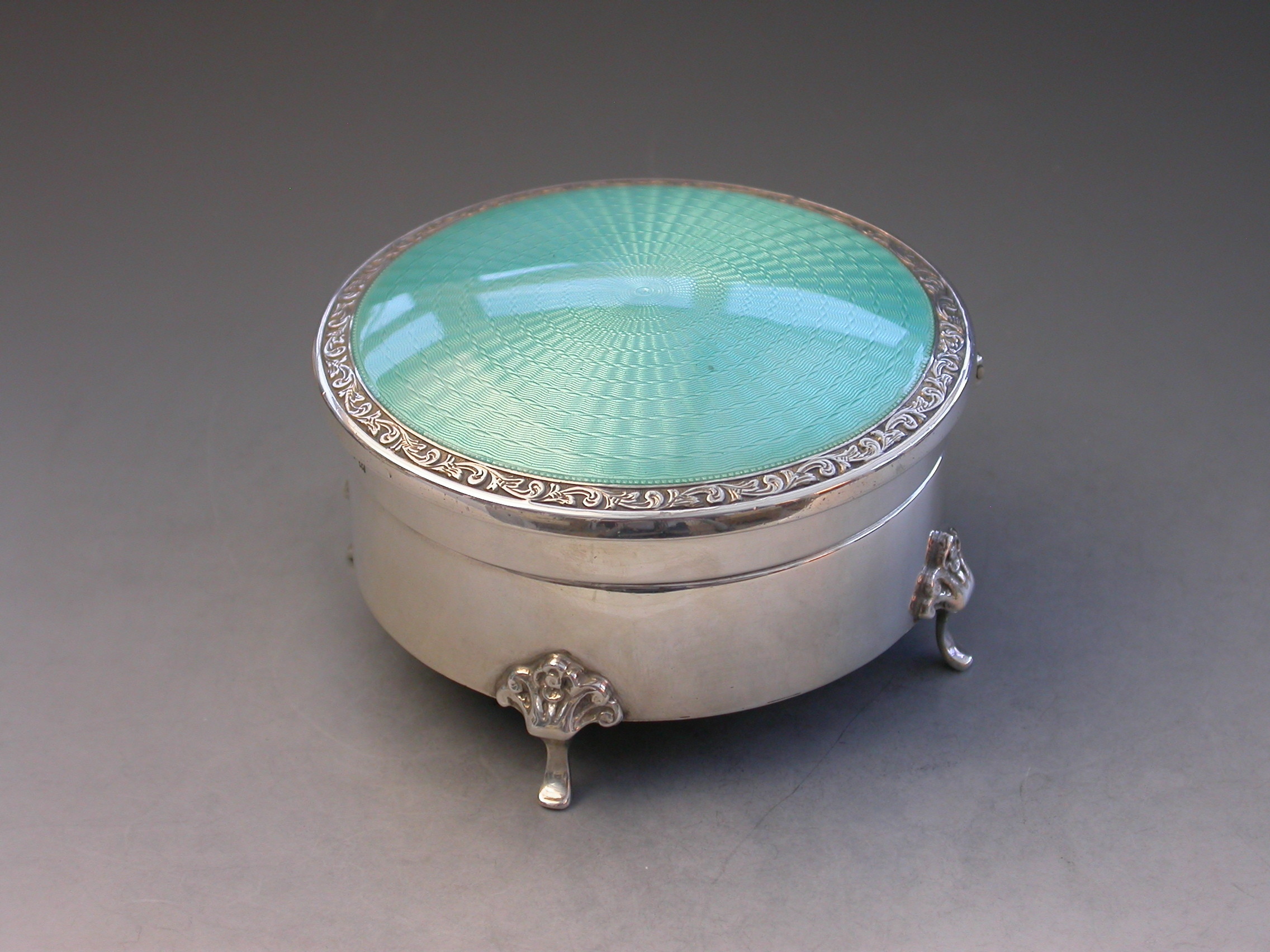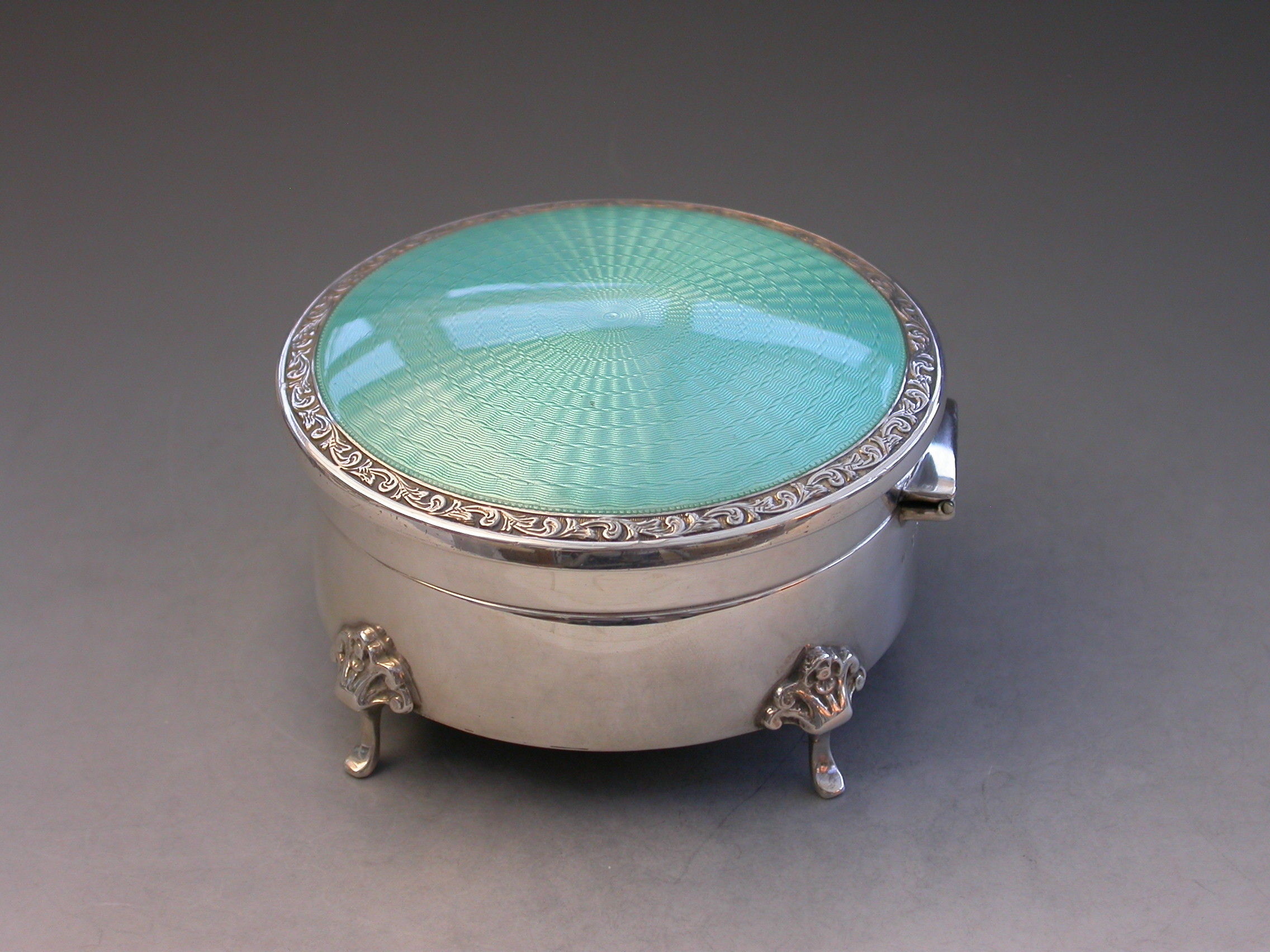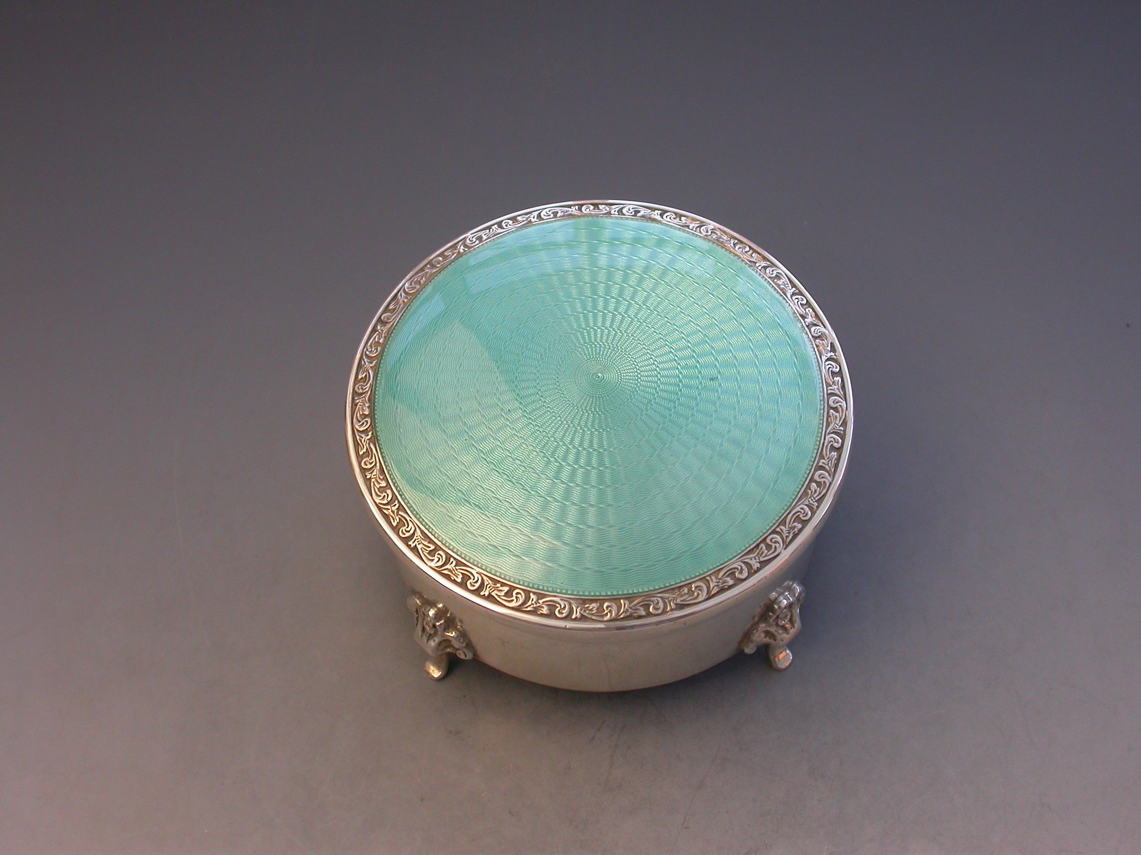 A fine early 20th century Art Deco English silver and turquoise guilloche enamel Ring Box, of circular form with hinged lid and standing on four scrolled feet. Cream silk and velvet lined interior.