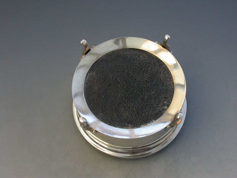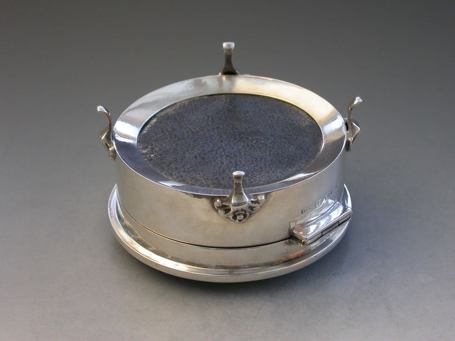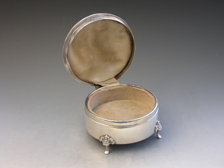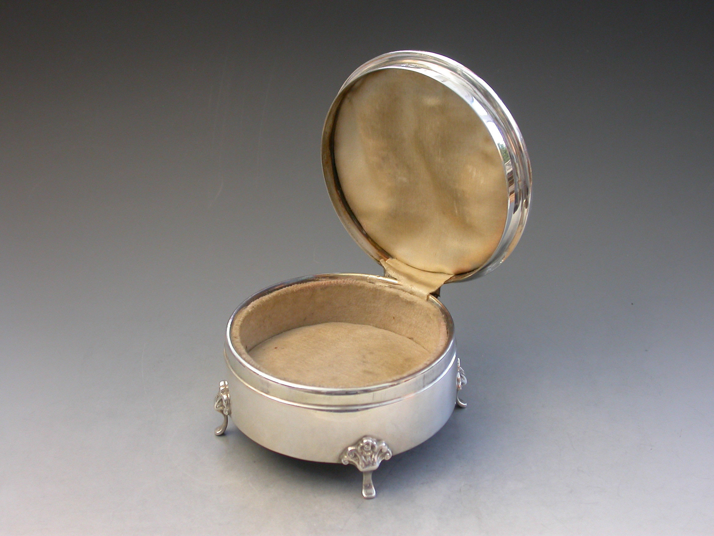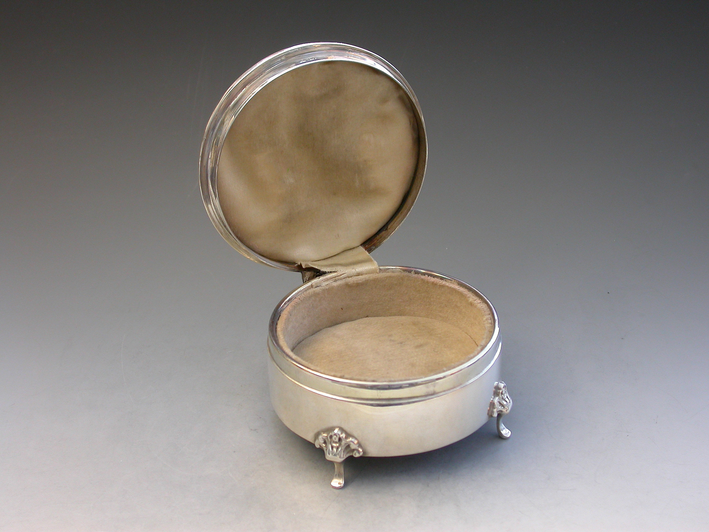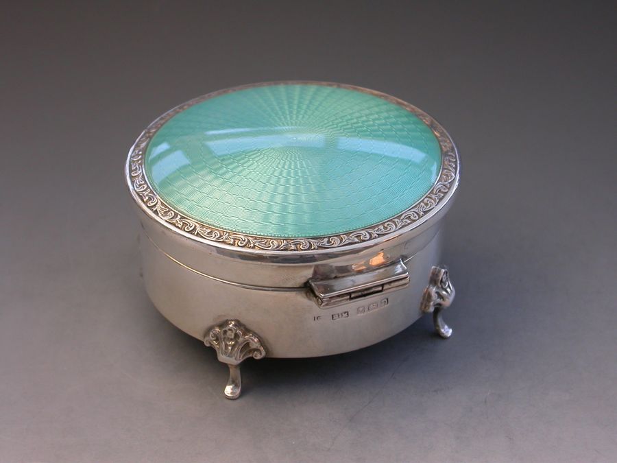 A fine early 20th century Art Deco English silver and turquoise guilloche enamel Ring Box, of circular form with hinged lid and standing on four scrolled feet. Cream silk and velvet lined interior.