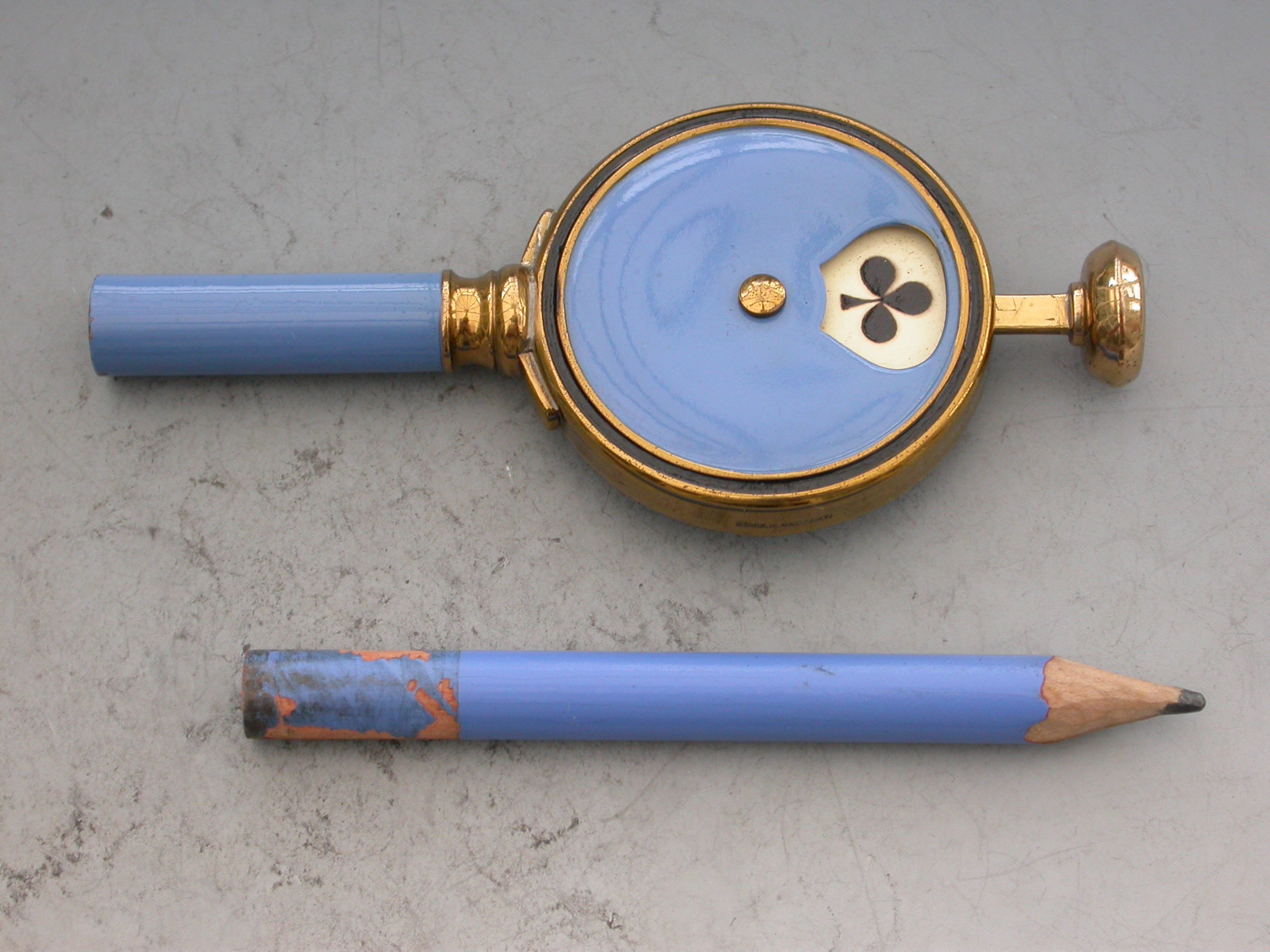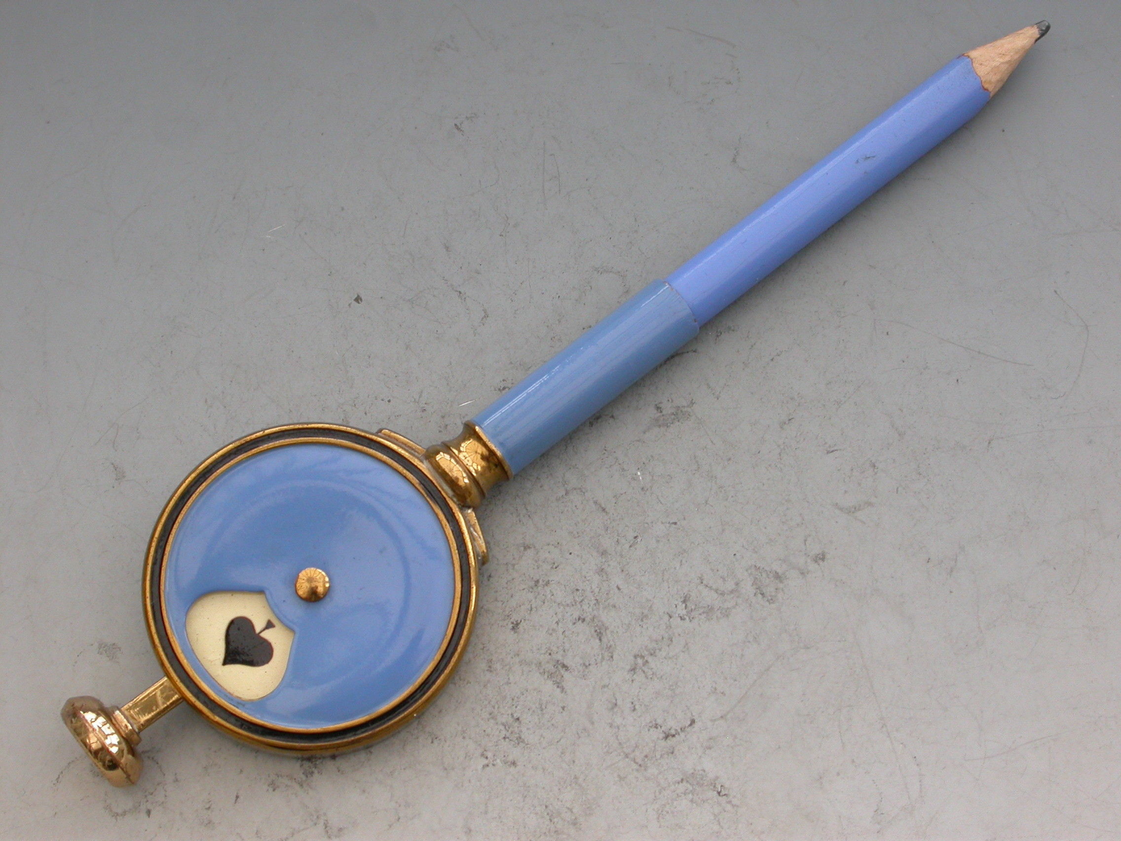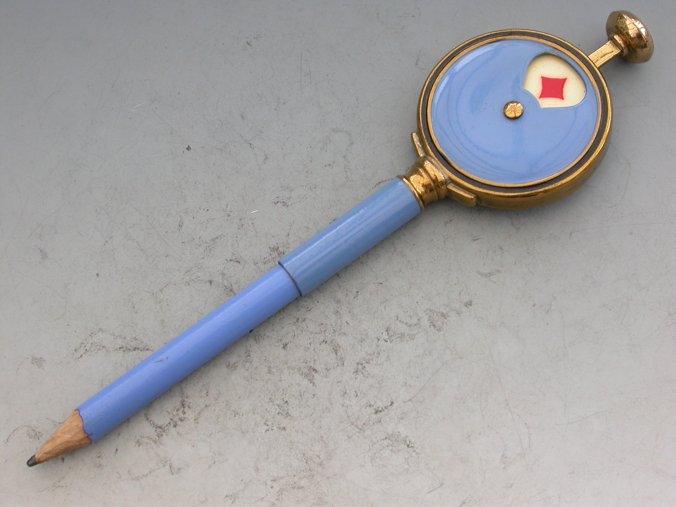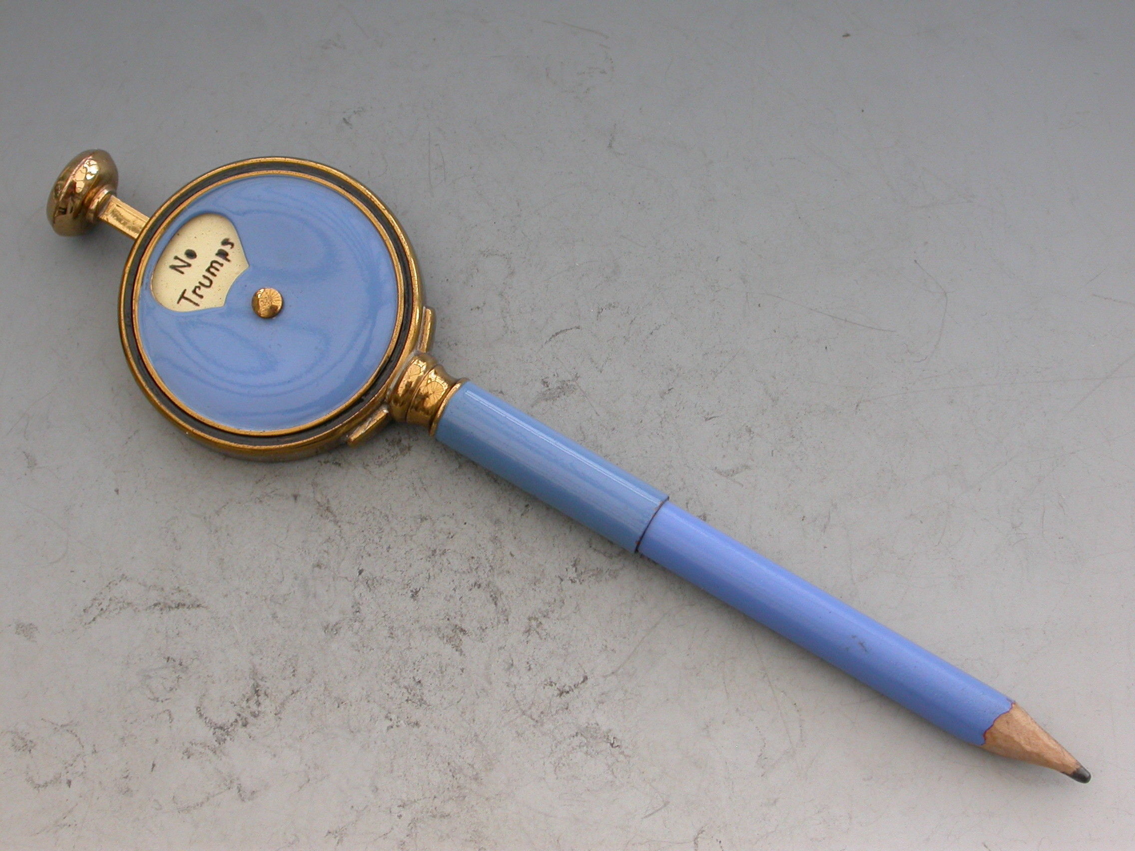 A nice quality early 20th century Art Deco style gilt metal and sky blue enamel Trumps Marker combined with a Pencil. A celluloid disc painted with the four suits and 'no-trumps' is rotated by depressing and releasing a plunger at the top.