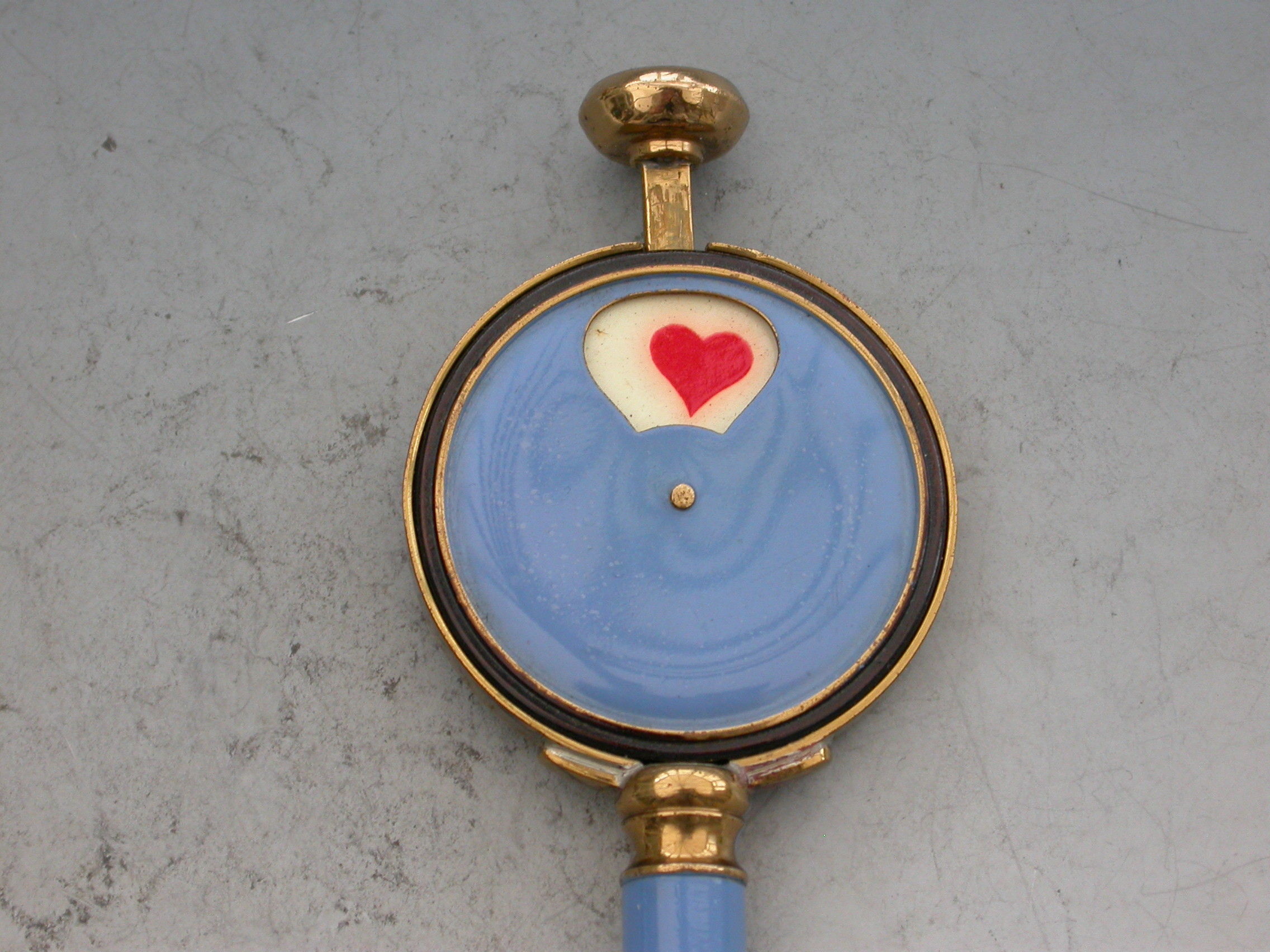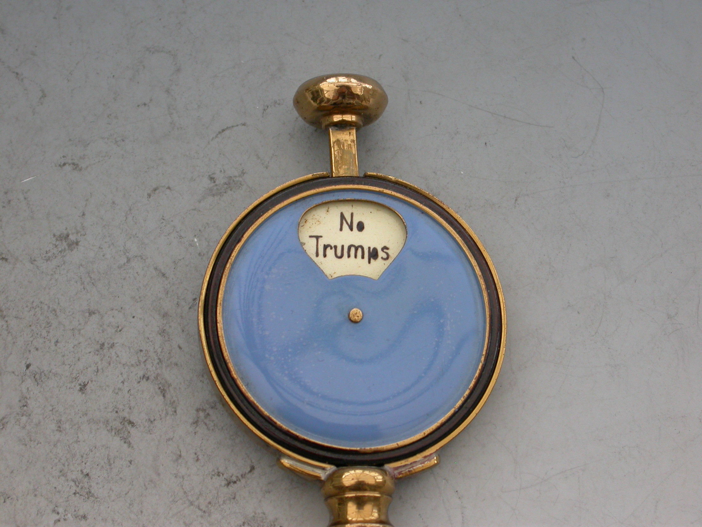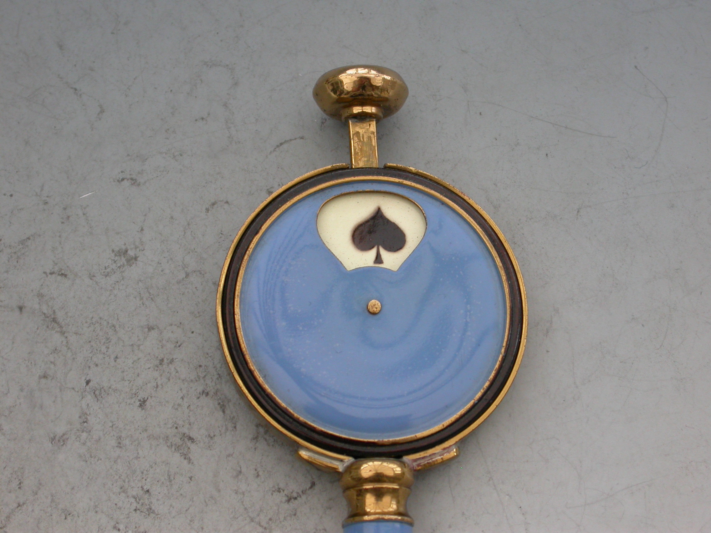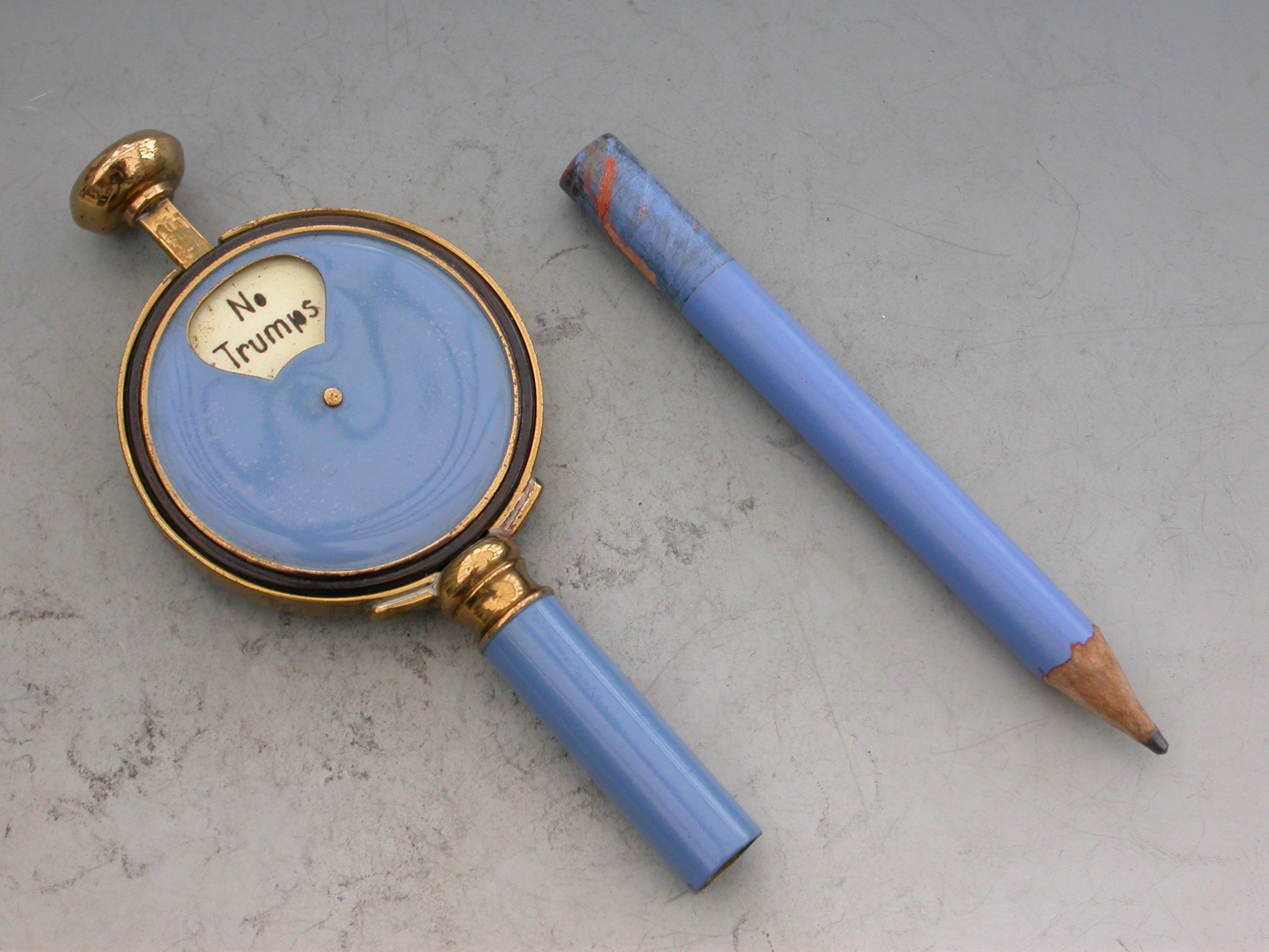 A nice quality early 20th century Art Deco style gilt metal and sky blue enamel Trumps Marker combined with a Pencil. A celluloid disc painted with the four suits and 'no-trumps' is rotated by depressing and releasing a plunger at the top.