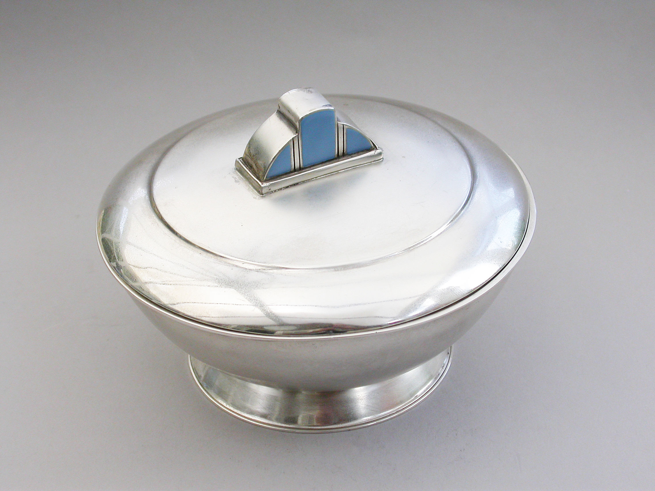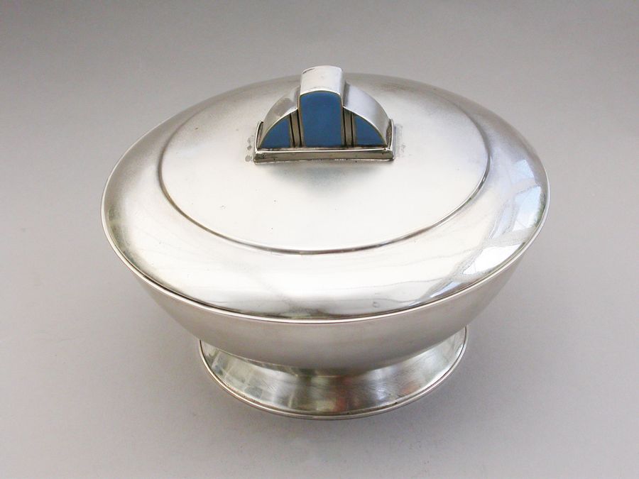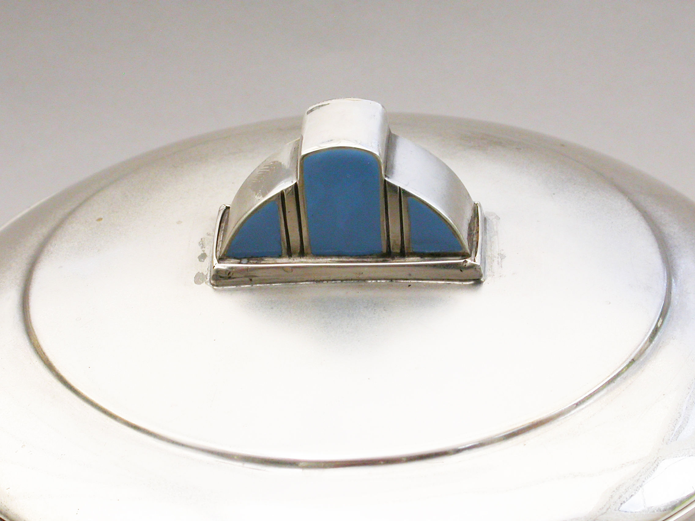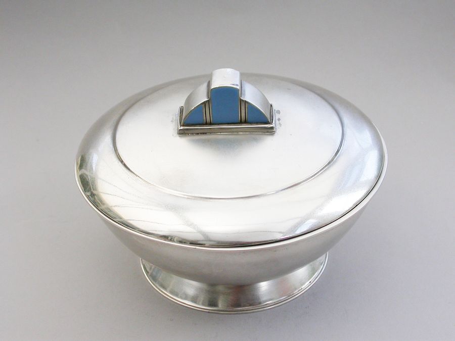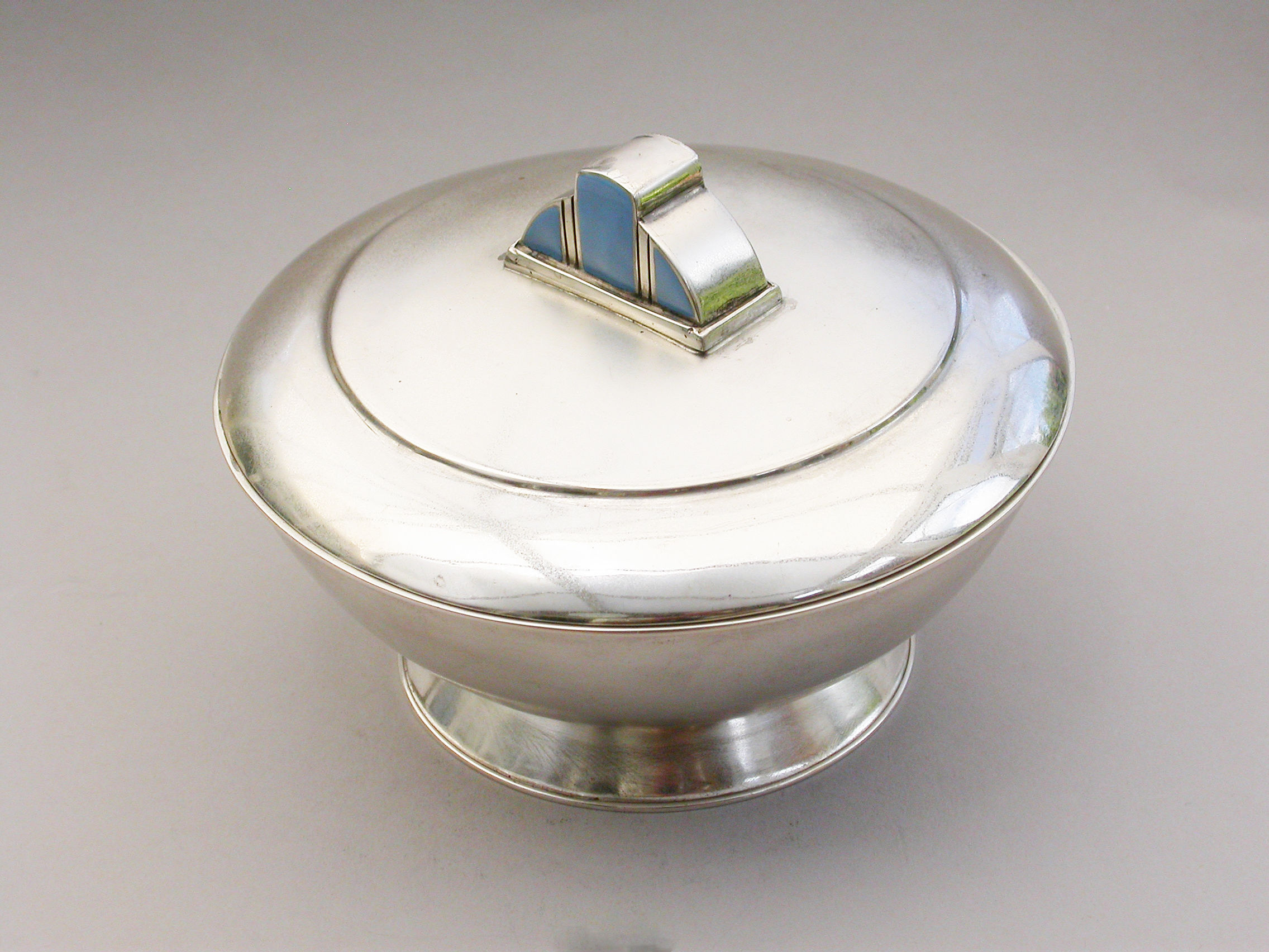 A rare early 20th century Art Deco silver and enamel Bowl and Cover, of plain circular form on flared base. The lift-off cover with sky blue enameled finial.