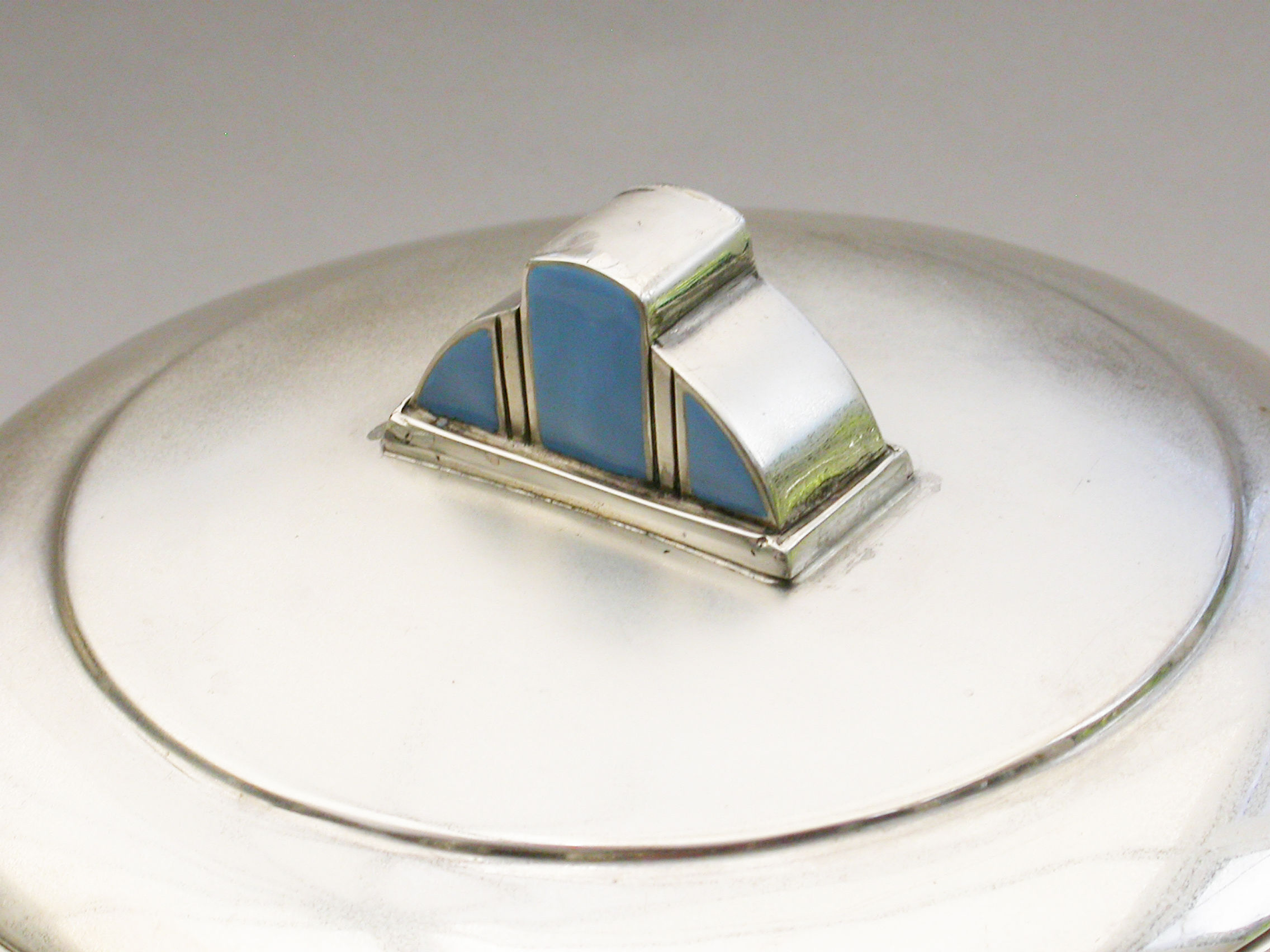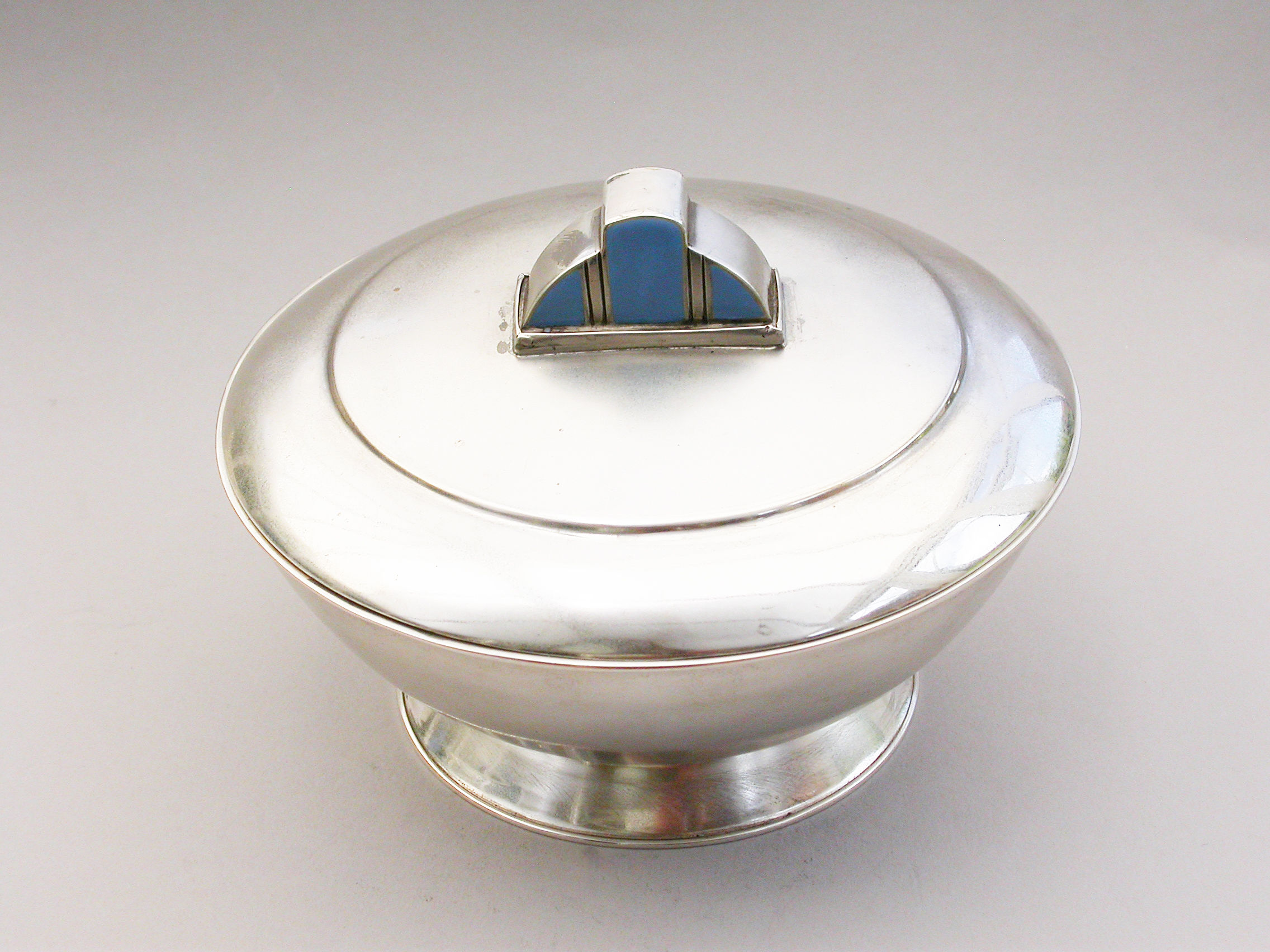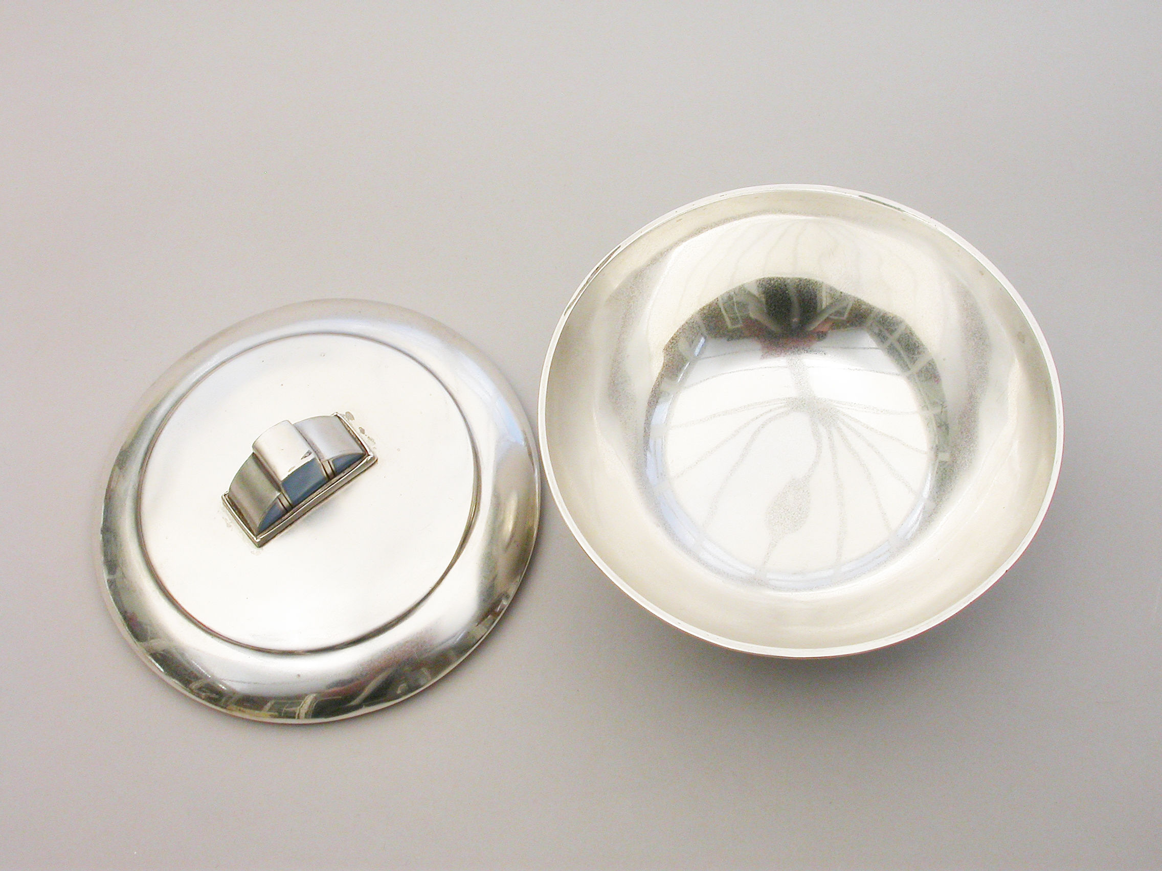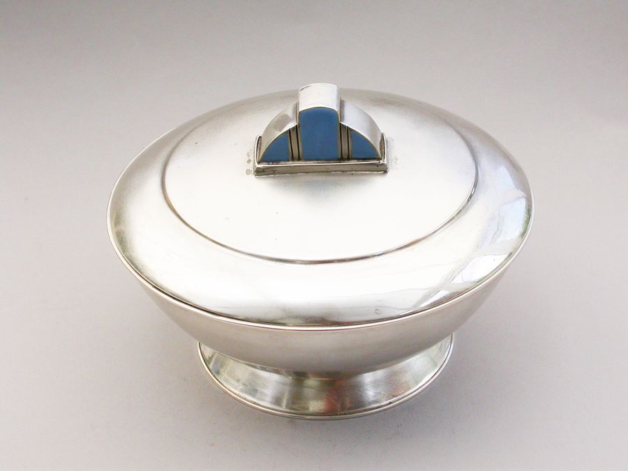 A rare early 20th century Art Deco silver and enamel Bowl and Cover, of plain circular form on flared base. The lift-off cover with sky blue enameled finial.