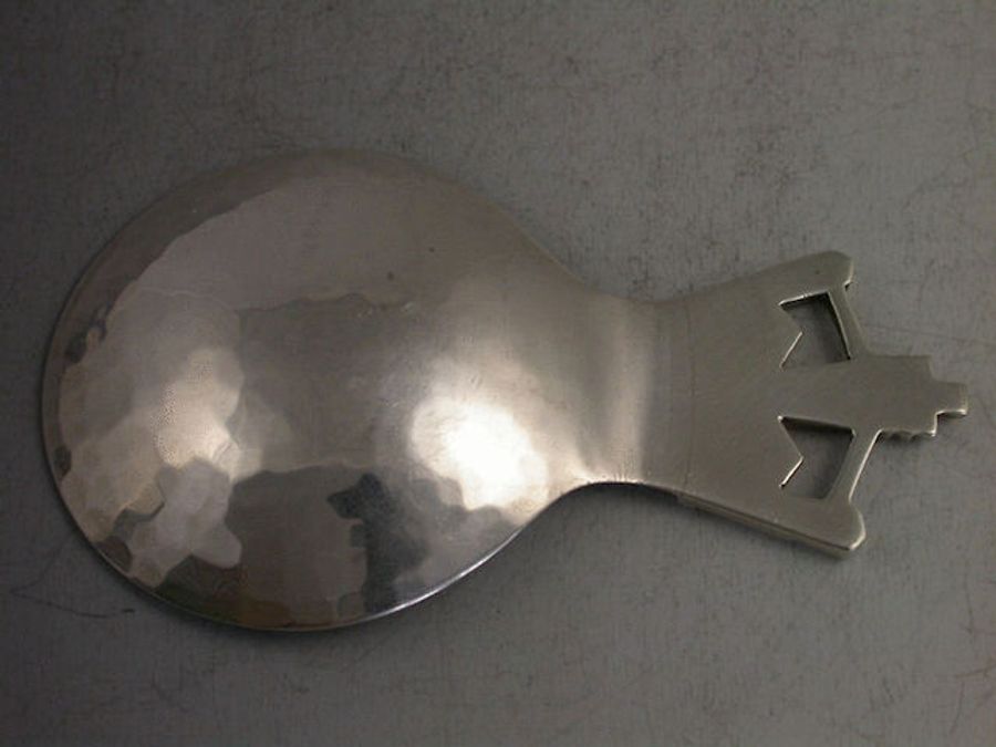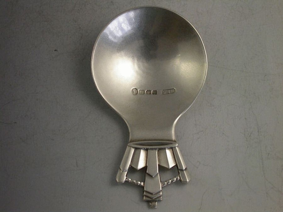 An early 20th century cast silver Caddy Spoon in the Art Deco style with plain circular bowl and pierced crown handle, made to commemorate the silver jubilee of George V and Queen Mary in 1935.