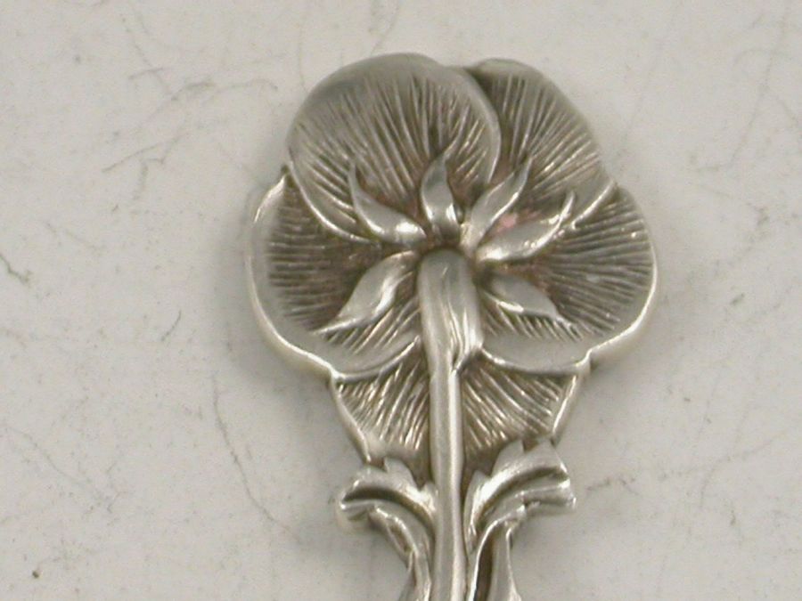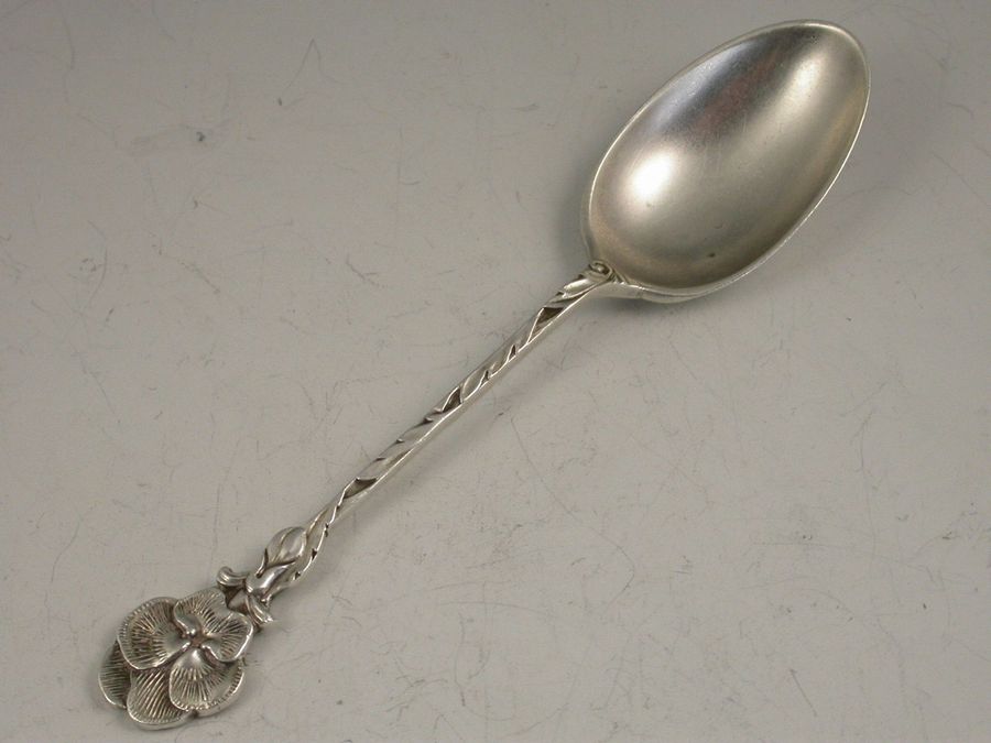 A fine early 20th century silver Tea Spoon, the handle cast as a Pansy in an Art Nouveau style, the terminal depicting both the back and the front of the flower head.